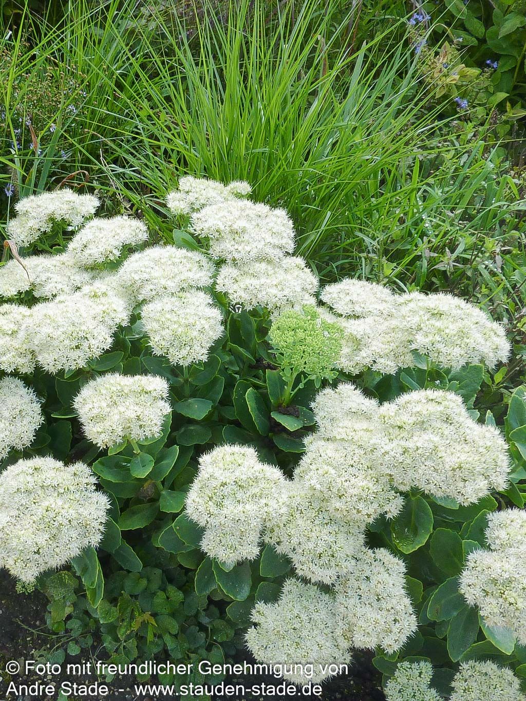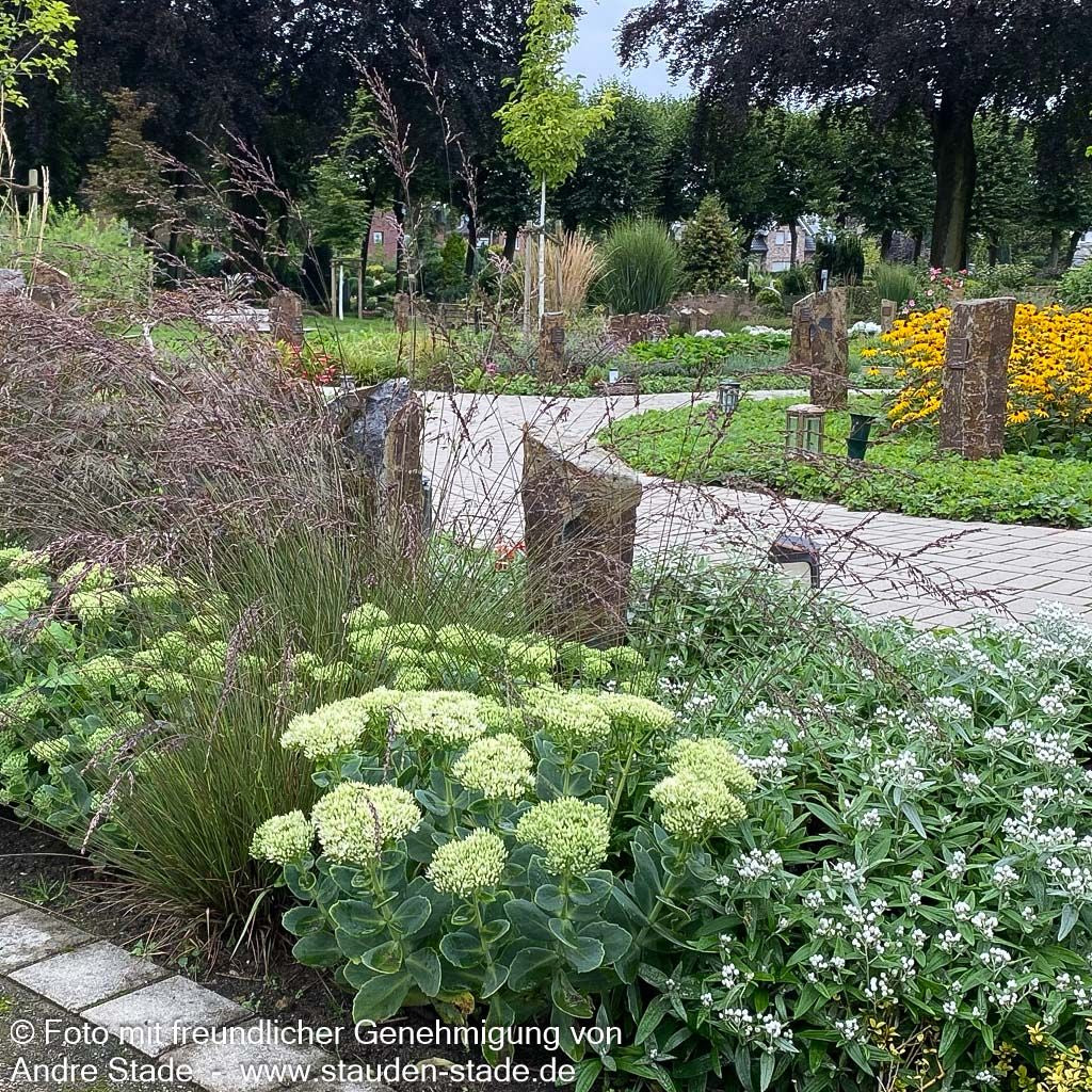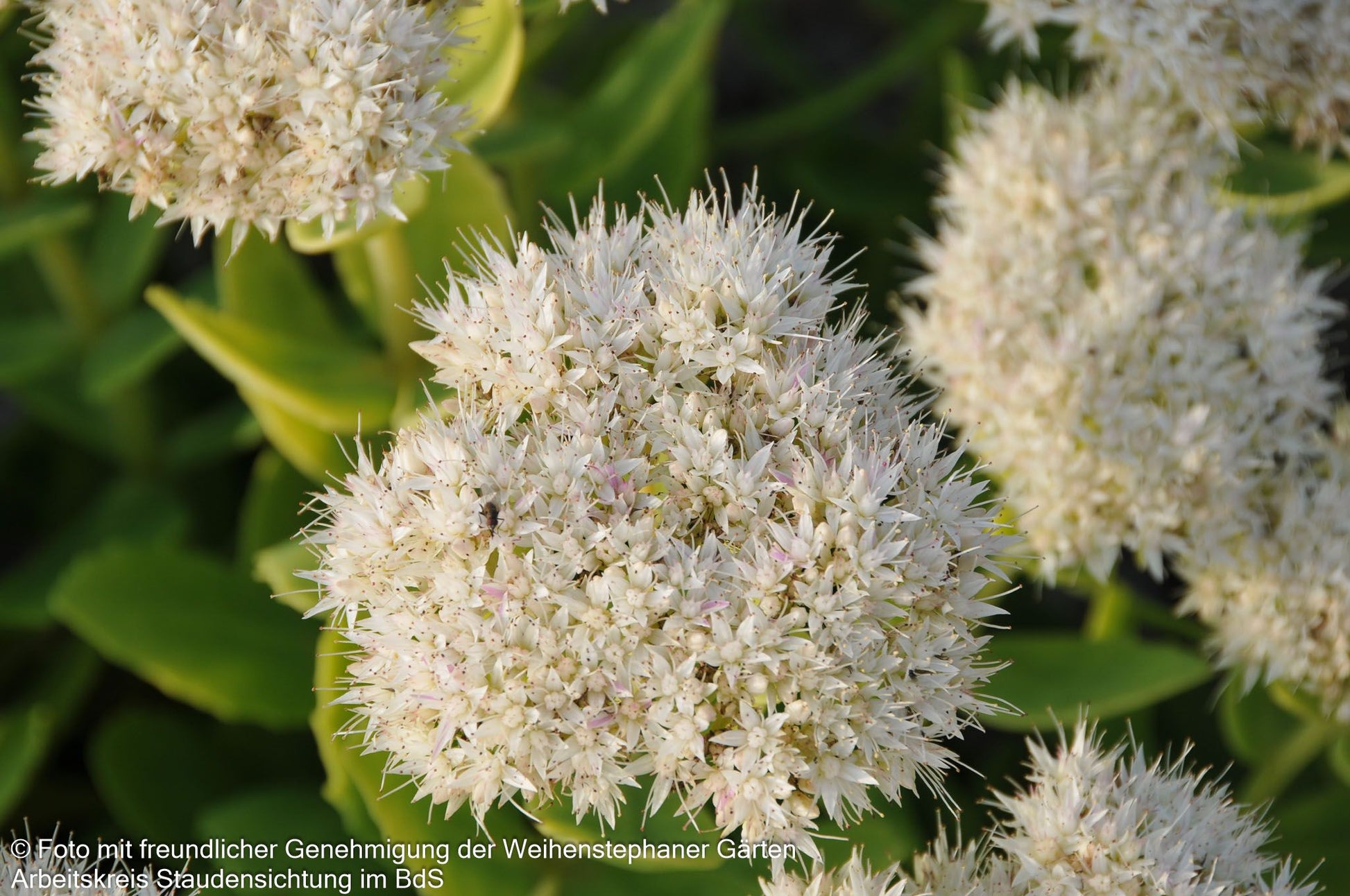 Die Prächtige Fetthenne (Sedum spectabile 'Stardust') ist eine außergewöhnliche Sorte, die als Staude des Jahres 2000 und Staude des Jahres 2011 doppelt ausgezeichnet wurde. Diese robuste Staude begeistert von August bis Oktober mit ihren strahlend weißen, einfachen Blüten, die eine Höhe von 30-40 cm erreichen. Das hell-grüne Laub bildet einen reizvollen Kontrast zu den leuchtenden Blütendolden und macht sie zur perfekten Insektennährpflanze. Diese buschig wachsende Sorte gedeiht optimal an sonnigen Standorten mit trockenen bis frischen Böden und ist bis -22°C winterhart. Als vielseitige Beetstaude eignet sie sich hervorragend für Steinanlagen, den Bauerngarten oder Schnittzwecke.