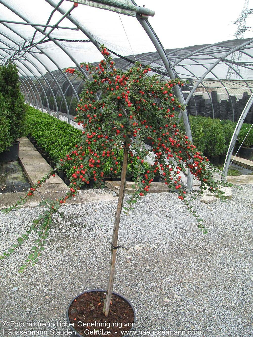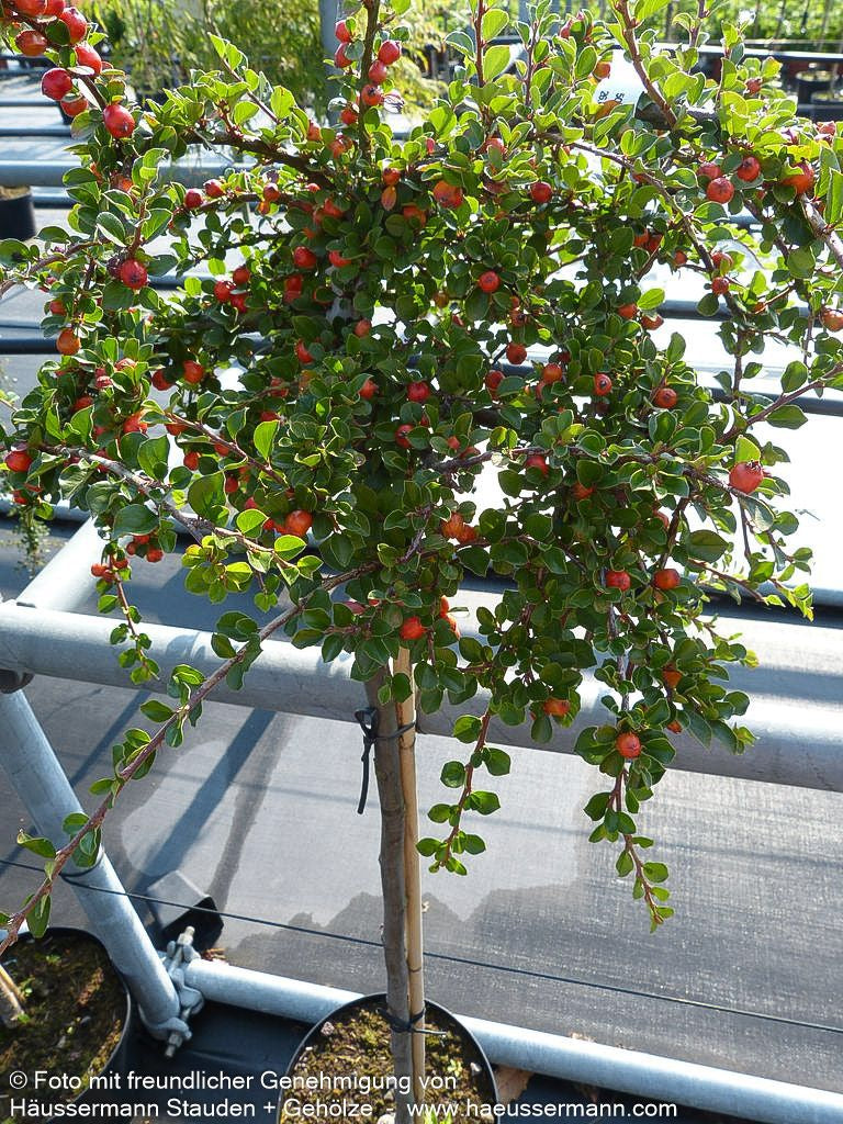 Die Preiselbeer-Zwergmispel (Cotoneaster apiculatus 'Blackburn') ist ein bezaubernder Bodendecker mit überhängendem Wuchs, der meist auf Stämmchen veredelt wird. Dieses sommergrüne Laubgehölz begeistert mit seinem flach niederliegenden Wuchs und erreicht als Kleingehölz eine Höhe von 0,5 bis 1,5 Metern. Die rosa Blüten erscheinen im Juni und locken zahlreiche Insekten an, während die großen dunkelroten Beeren ab dem Herbst bis in den Winter hinein als prächtiger Fruchtschmuck und wertvolle Vogelnahrung dienen. Diese vielseitige Pflanze gedeiht an sonnigen, halbschattigen bis absonnigen Standorten und toleriert sowohl trockene als auch frische bis feuchte Böden. Mit ihrer attraktiven Herbstfärbung ist sie ideal für Grabstätten geeignet und eine wunderbare Bereicherung für jeden kleinen Garten.