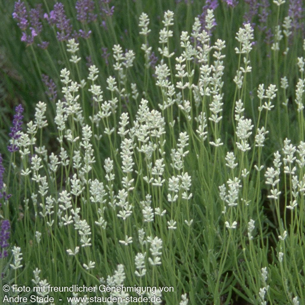 Der Provence-Lavendel (Lavandula x intermedia 'Edelweiß') verzaubert mit seinen eleganten weißen Blüten und seinem intensiven Duft jeden Gartenliebhaber. Diese außergewöhnliche Staude blüht von Juli bis August und erreicht dabei eine beeindruckende Blütenhöhe von 40 bis 50 cm. Das graugrüne, wintergrüne Laub bildet einen wunderschönen Kontrast zu den einfachen Blüten und macht diese Insektennährpflanze zu einem echten Highlight. An einem sonnigen Standort mit trockenem Boden entwickelt sich diese Beetstaude zu einem buschigen Schmuckstück, das sowohl als Leitstaude als auch als Gerüststaude hervorragend geeignet ist.