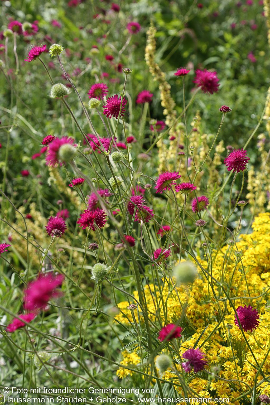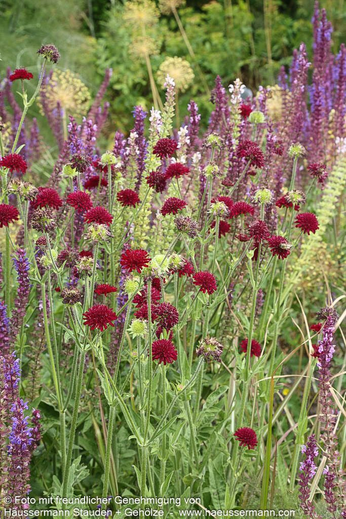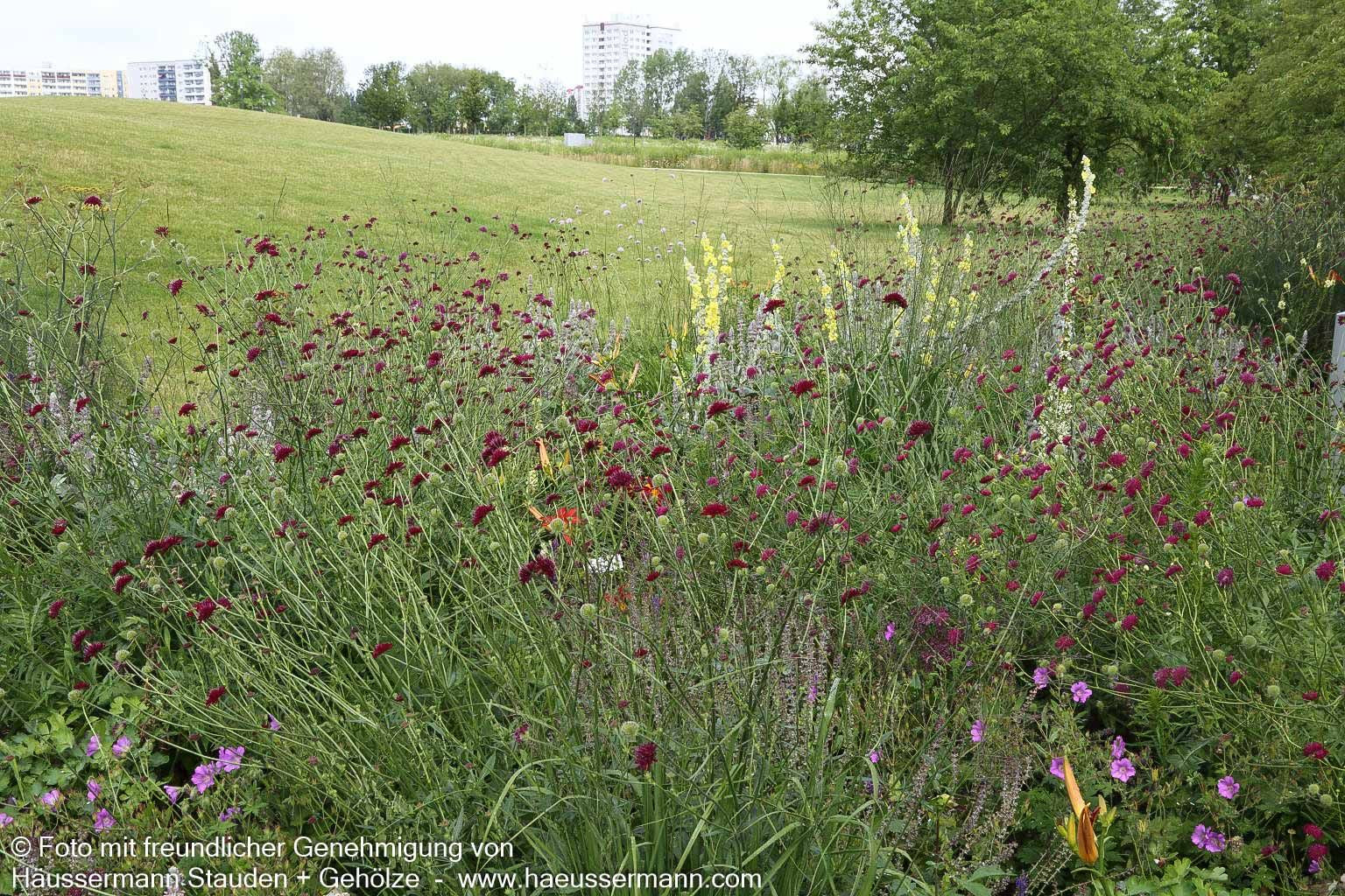Die Purpur-Witwenblume (Knautia macedonica) ist eine prächtige Staude mit leuchtend dunkelroten Blüten, die von Juli bis September für spektakuläre Farbakzente sorgt. Diese Sternensorte erreicht eine beeindruckende Höhe von 60 bis 100 cm und entwickelt sich buschig mit grünem Laub. An sonnigen Standorten mit frischen Böden gedeiht sie optimal und ist sowohl als Freiflächenstaude als auch als Gehölzrandstaude einsetzbar. Diese winterharte Insektennährpflanze ist perfekt für den Bauerngarten geeignet und sollte als Leitstaude in Gruppen von 1-3 Stück gepflanzt werden.