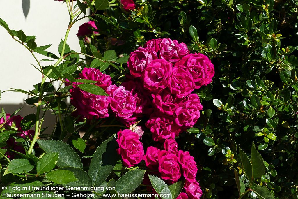 Die Ramblerrose 'Perennial Domino' (Rosa 'Perennial Domino' KL VI) ist eine außergewöhnliche Kletterrose, die von Juni bis Oktober mit kleinen, gefüllten Blüten in magenta-rot bezaubert. Diese preisgekrönte Rose des Jahres 2022 vom renommierten Züchter Tantau erreicht eine imposante Höhe von 250-350 cm und eignet sich perfekt für Rosenbögen, Spaliere oder Säulen. Als Ramblerrose überzeugt sie mit weichen, biegsamen Trieben und verströmt einen angenehm leichten Duft. Besonders bemerkenswert ist ihre ausgezeichnete Blattgesundheit und gute Rußtauresistenz, die sie zu einem pflegeleichten Laubgehölz macht, das auch Halbschatten verträgt.