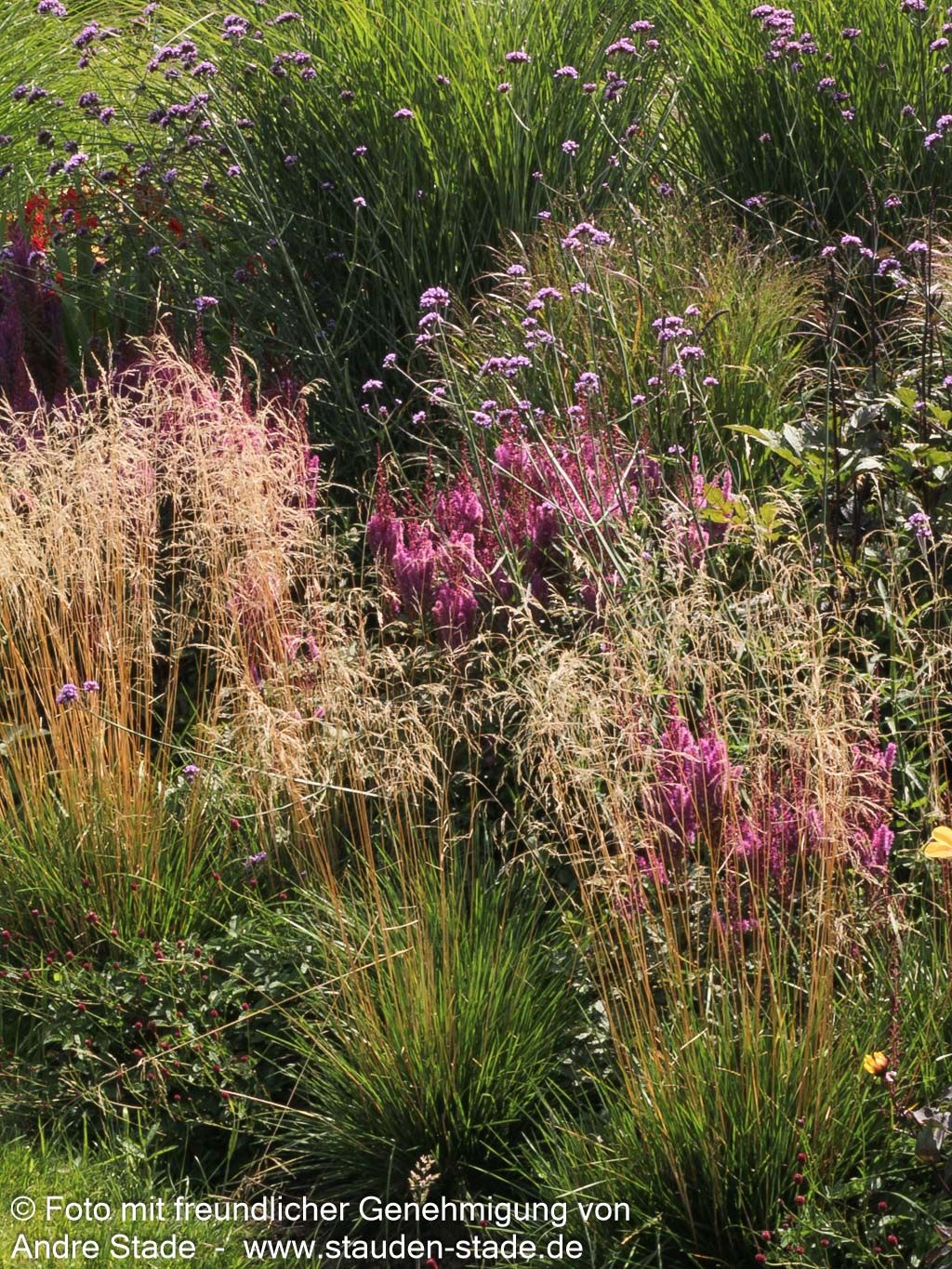 Die Rasen-Schmiele (Deschampsia cespitosa) ist ein elegantes heimisches Ziergras, das mit seinen grünlich schimmernden Blütenrispen von Juni bis August bezaubert. Dieses winterharte Gras erreicht eine Blütenhöhe von 100 cm, während das grüne wintergrüne Blattwerk 60 cm hoch wird. Mit ihrer bogig geneigten Wuchsform gedeiht sie optimal an sonnigen bis absonnigen Gehölzrändern auf frischen bis feuchten Böden. Als Sternensorte der deutschen Staudensichtung eignet sich diese vielseitige Gehölzrandstaude perfekt für den Bauerngarten, als Begleitstaude zu Rhododendron und dank ihres Fruchtschmucks auch für Schnittzwecke.