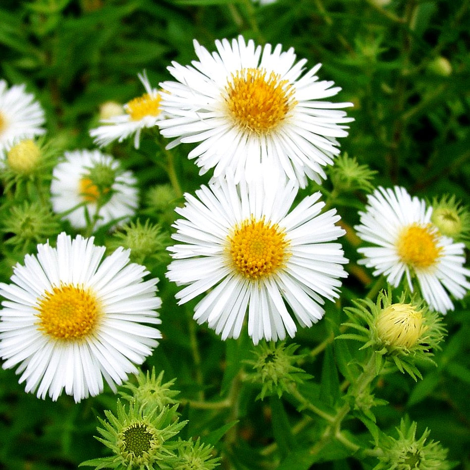 Die Raublatt-Aster (Aster novae-angliae 'Herbstschnee') verzaubert Ihren Garten mit einer Fülle weißer, halbgefüllter Blüten, die von September bis Oktober erstrahlen. Diese prächtige Staude erreicht eine imposante Blütenhöhe von 120 cm und setzt als Leitstaude markante Akzente in jedem Bauerngarten. Das grüne, sommergrüne Laub bildet den perfekten Hintergrund für die elegante Blütenpracht.