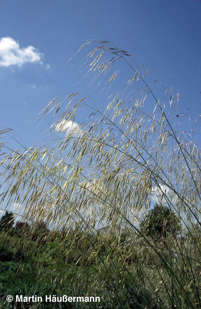 Das Riesen-Federgras (Stipa gigantea) ist ein spektakuläres Ziergras, das mit seiner imposanten Erscheinung jeden Garten bereichert. Von Juni bis August entwickelt diese beeindruckende Grasart ihre charakteristischen gelblichen Blütenrispen, die eine majestätische Höhe von 150 bis 180 cm erreichen. Das wintergrüne Blattwerk bildet einen eleganten, grundständigen Schopf von etwa 30 cm Höhe mit bogig geneigten Halmen. Als Sternensorte der deutschen Staudensichtung überzeugt dieses robuste Gras besonders an sonnigen Standorten mit trockenen Böden. Die attraktiven Fruchtstände machen es zur idealen Wahl für Schnittzwecke und floristische Arrangements. Als Leitstaude setzt das Riesen-Federgras mit seinem dekorativen Fruchtschmuck auch im Winter wunderschöne Akzente in naturnahen Gärten und Felssteppe-Pflanzungen.