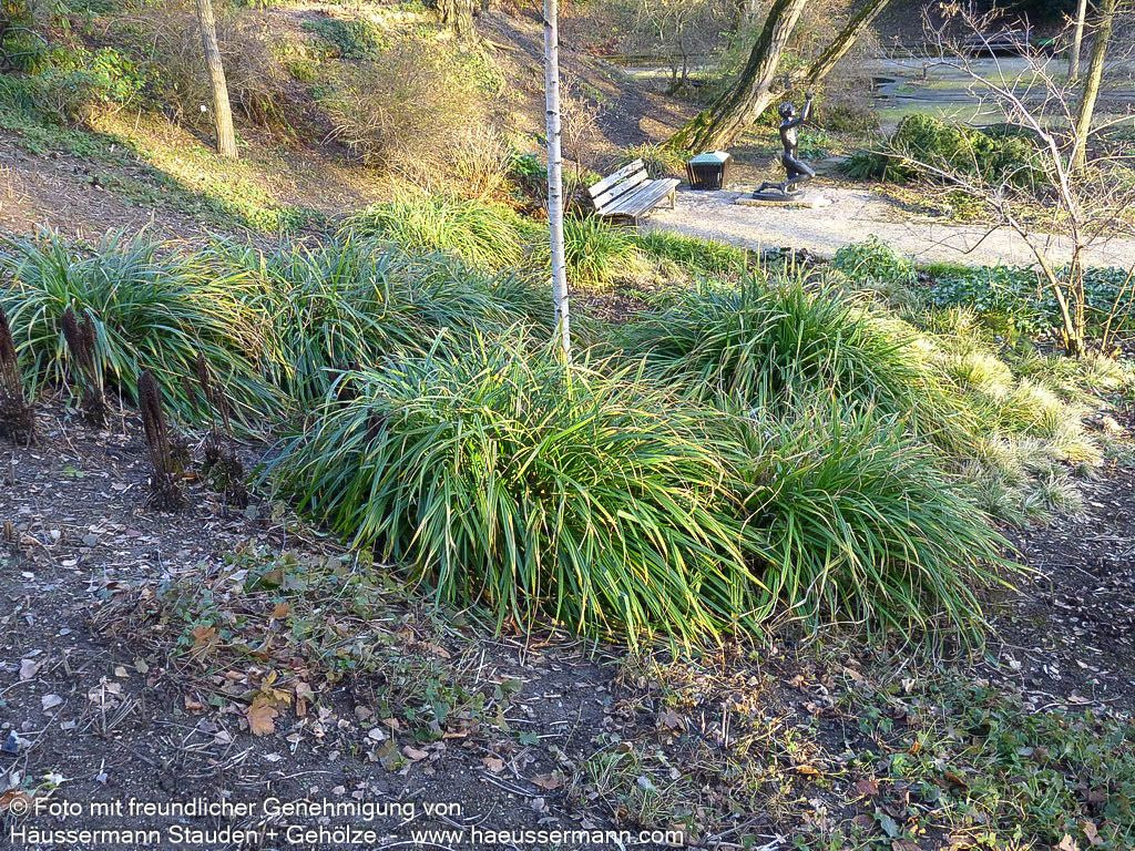 Die Riesen-Segge (Carex pendula) ist eine imposante heimische Grasart, die als Staude des Jahres 2015 ausgezeichnet wurde und zu den Sternesorten der deutschen Staudensichtung zählt. Mit ihrer eleganten, bogigen Wuchsform und den grünen, wintergrünen Blättern (40-60 cm hoch) bildet sie einen attraktiven Blattschopf, der sich perfekt als großflächiger Bodendecker eignet. Die unscheinbaren grünlichbraunen Blüten erscheinen von Juni bis Juli und erreichen eine beeindruckende Höhe von 100-120 cm. Diese robuste, winterharte Gehölzunterpflanzung gedeiht optimal an halbschattigen bis absonnigen Standorten mit feuchten bis frischen Böden und zeigt ein starkes Wuchsverhalten mit gelegentlicher Selbstaussaat.