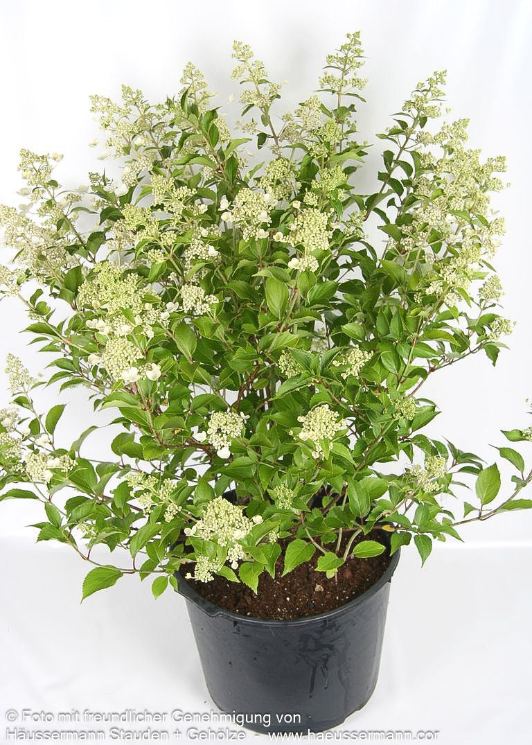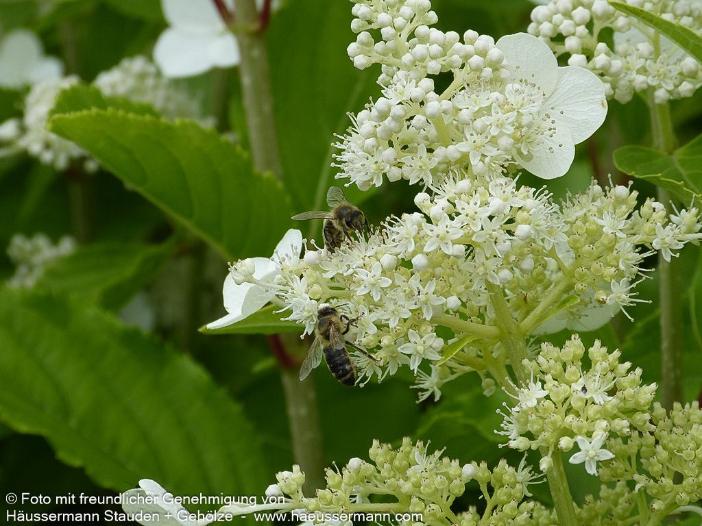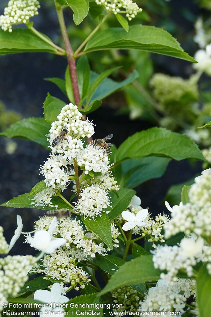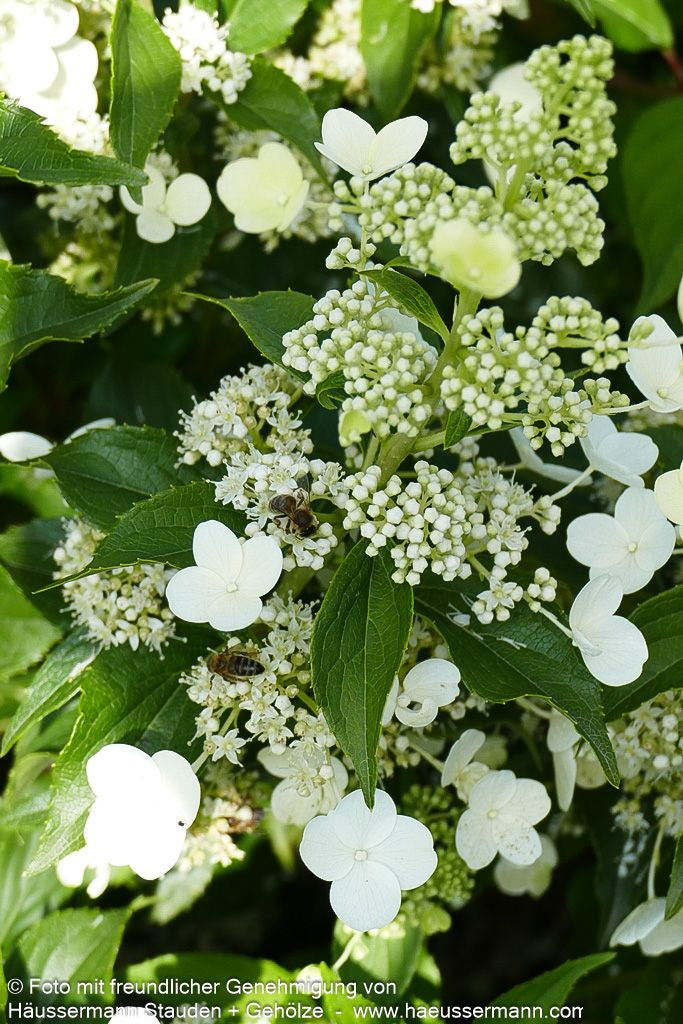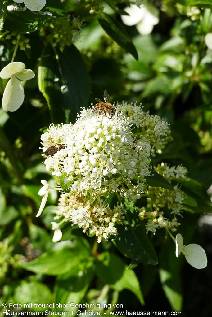Die Rispen-Hortensie (Hydrangea paniculata 'Kyushu') ist ein prächtiger Zierstrauch, der mit seinen großen, cremweißen und angenehm duftenden Blütenrispen von Juli bis September begeistert. Dieser mittelhohe Strauch erreicht eine Höhe von 2-3 Metern und wächst breit aufrecht. Als wertvolle Insektennährpflanze gedeiht sie sowohl an sonnigen als auch absonnigen Standorten und bevorzugt frische bis feuchte Böden. Diese äußerst frostharte Laubpflanze ist sommergrün und eignet sich hervorragend für kleine Gärten in sonniger oder halbschattiger Lage, sowohl als Blütenhecke als auch in Einzelstellung als spektakulärer Blütenschmuck.
