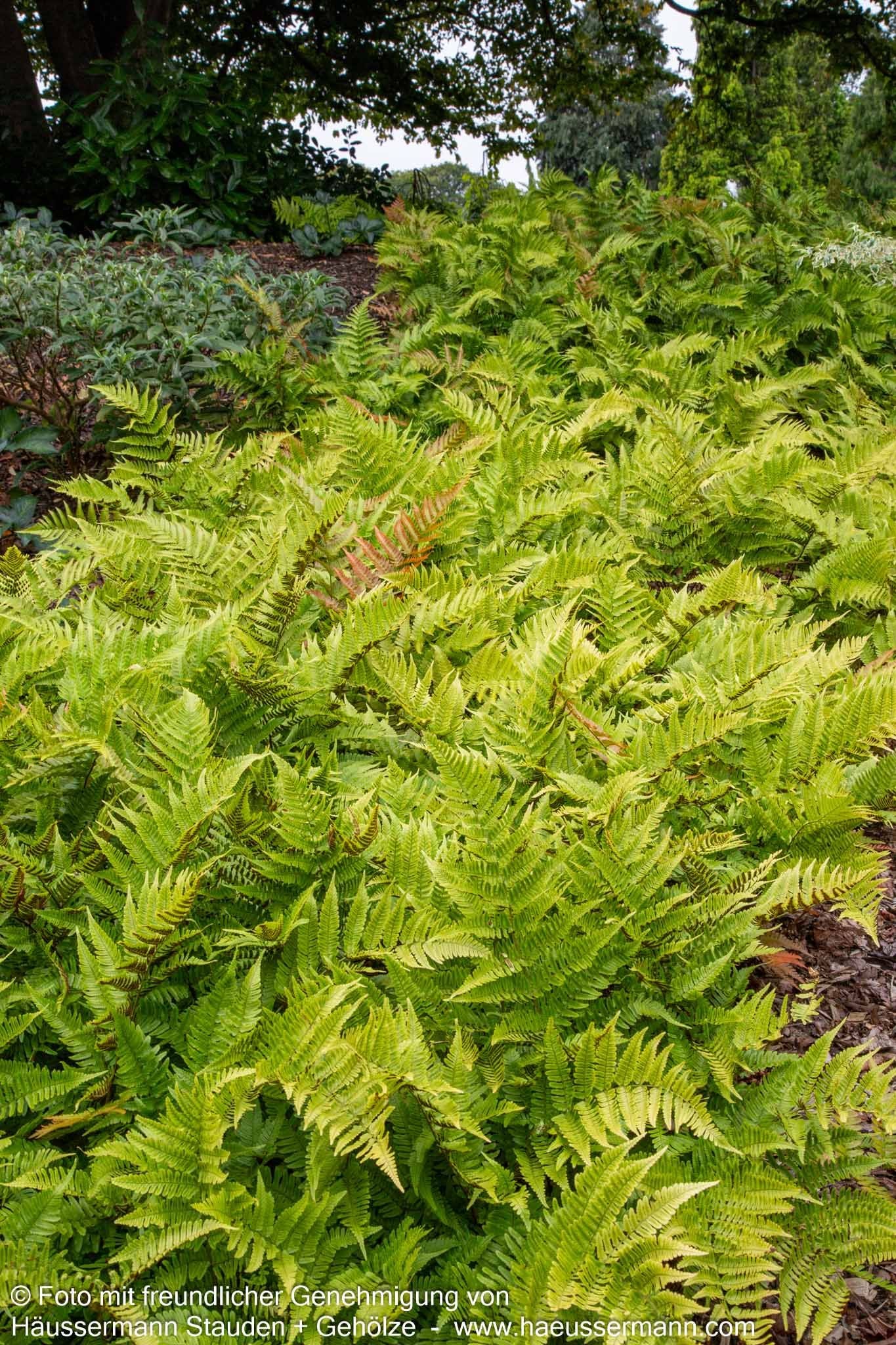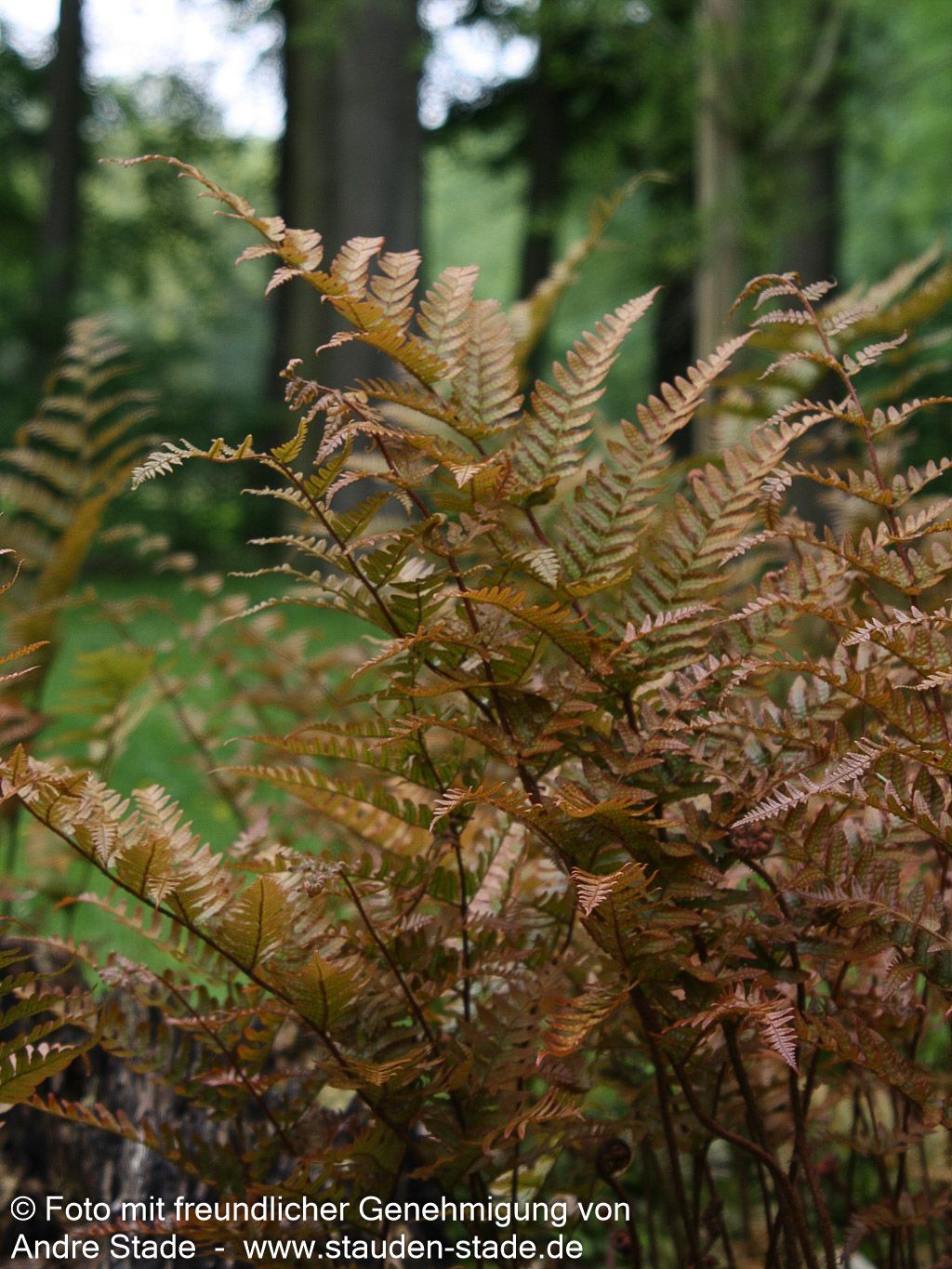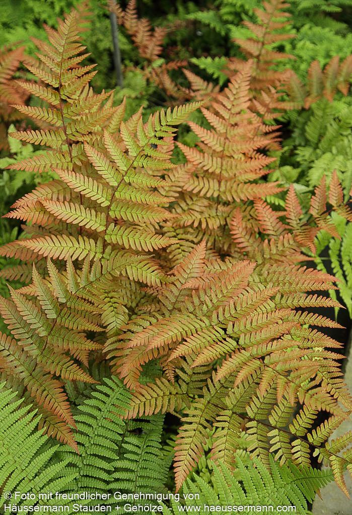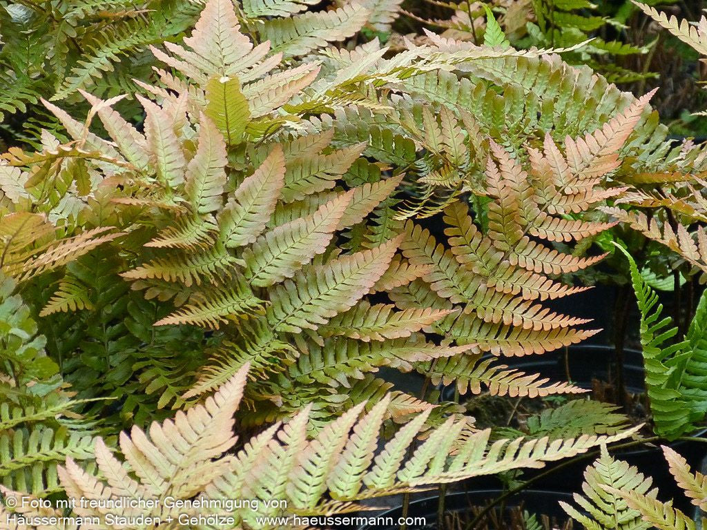 Der Rotschleierfarn (Dryopteris erythrosora) ist ein faszinierender Farn mit besonderer Blattform und Textur, der durch seine dunkel-grünen, wintergrünen Wedel besticht. Diese Sternensorte erreicht eine Höhe von 30 bis 60 cm und entwickelt eine ausladend bis breitausladende, bogige Wuchsform. Der fremdländische Rotschleierfarn gedeiht optimal an halbschattigen, wechselsonnigen bis absonnigen Plätzen mit frischem Boden. Als vielseitige Gehölzunterpflanzung und Gehölzrandstaude eignet er sich hervorragend zur Kombination mit Rhododendren und ist bis -11°C winterhart.
