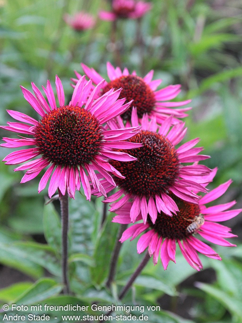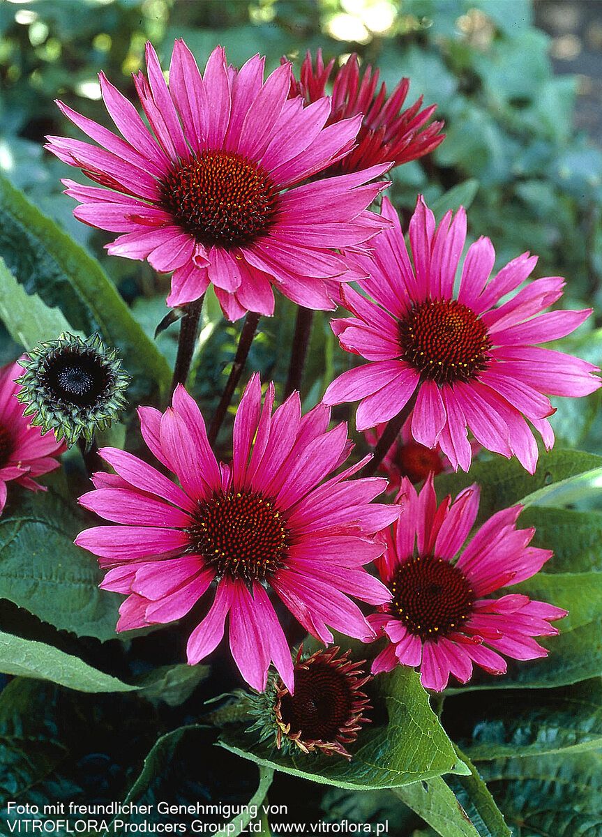 Der Scheinsonnenhut Echinacea purpurea 'Fatal Attraction' verzaubert mit seinen tief purpurrosa Blüten auf dunklen Stielen und bildet von Juli bis September einen spektakulären Blickfang im Garten. Diese robuste Staude erreicht eine Höhe von 60-70 cm und begeistert mit ihren dunkel-grünen, sommergrünen Blättern, die einen reizvollen Kontrast zu den leuchtenden purpurrosa Blüten bilden. An einem sonnigen Standort mit frischem Boden entfaltet diese Insektennährpflanze ihre volle Pracht und ist dabei bis -28°C winterhart. Als perfekte Rosenbegleiterin und klassische Bauerngartenstaude eignet sie sich hervorragend für die Vase und verwandelt jeden Garten in ein Paradies für Bienen und Schmetterlinge.