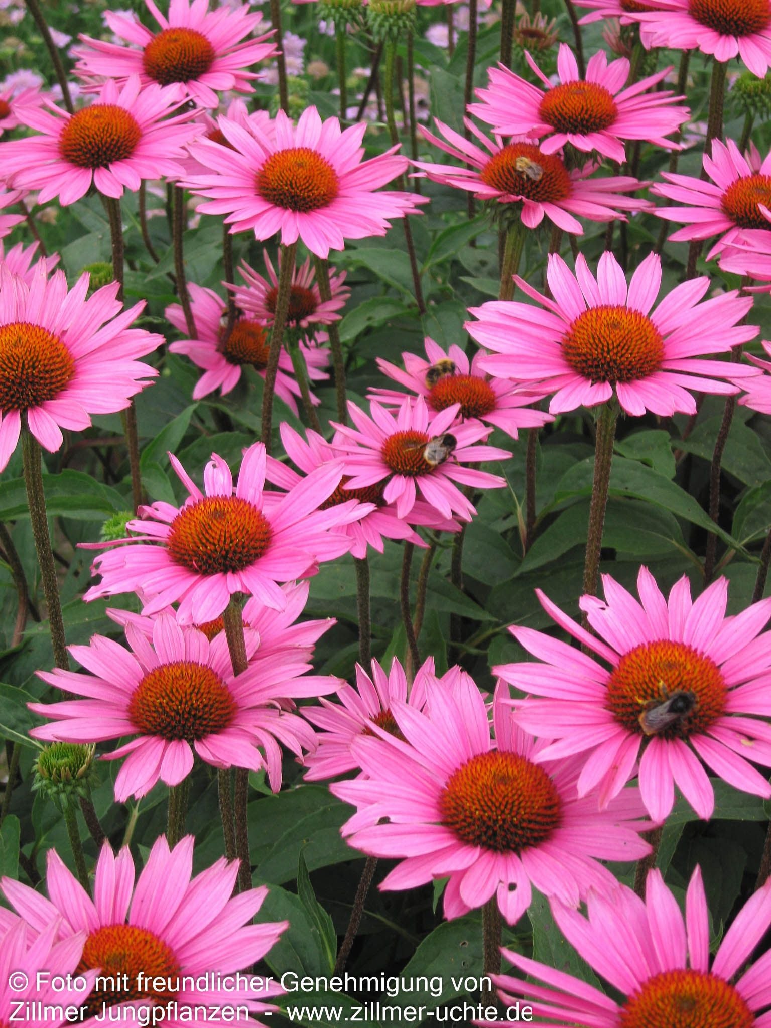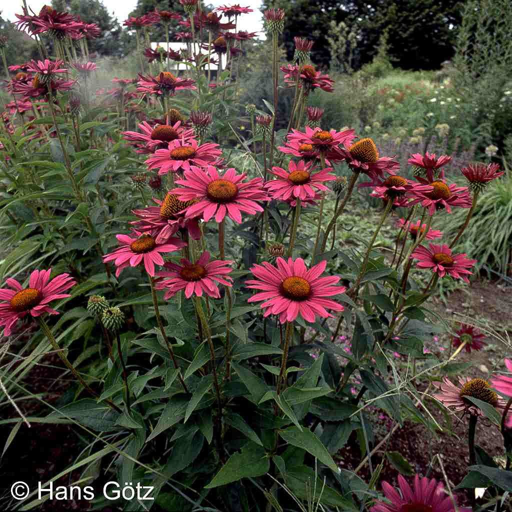Der Scheinsonnenhut (Echinacea purpurea 'Rubinstern') ist eine prachtvolle Sternesorte der deutschen Staudensichtung, die mit ihren purpurrosa Blüten von Juli bis Oktober für monatelange Farbe in Ihrem Garten sorgt. Diese robuste Staude erreicht eine beeindruckende Blütenhöhe von 90 bis 110 cm und überzeugt mit dunkel-grünen, sommergrünen Blättern. Der 'Rubinstern' gedeiht optimal an sonnigen Standorten auf frischen bis trockenen Böden und ist mit seiner Winterhärte bis -39°C äußerst pflegeleicht. Als wertvolle Insektennährpflanze und perfekter Rosenbegleiter bereichert diese Beetstaude jeden Bauerngarten und eignet sich hervorragend für Schnittzwecke.