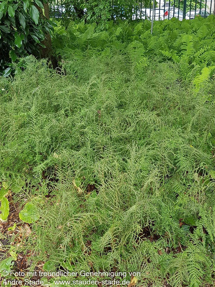 Der Schellenbaumfarn (Dryopteris filix-mas 'Linear.Polydactylon') ist ein außergewöhnlicher Farn mit spektakulären troddelartigen Vergabelungen an den Fiederenden, die ihm seinen charakteristischen Namen verleihen. Diese beeindruckende Züchtung entwickelt dunkel-grüne, wintergrüne Blätter, die 50-70 cm hoch werden und durch ihre besondere Blattform jeden Betrachter faszinieren. Der robuste Farn gedeiht optimal an halbschattigen bis absonnigen Plätzen unter Gehölzen oder als Gehölzrandstaude in frischem, humusreichem Boden. Mit seiner extremen Winterhärte bis -43°C und aufrechten bis ausladenden Wuchsform eignet er sich hervorragend als Solitär oder in kleinen Gruppen und harmoniert besonders schön mit Rhododendron.