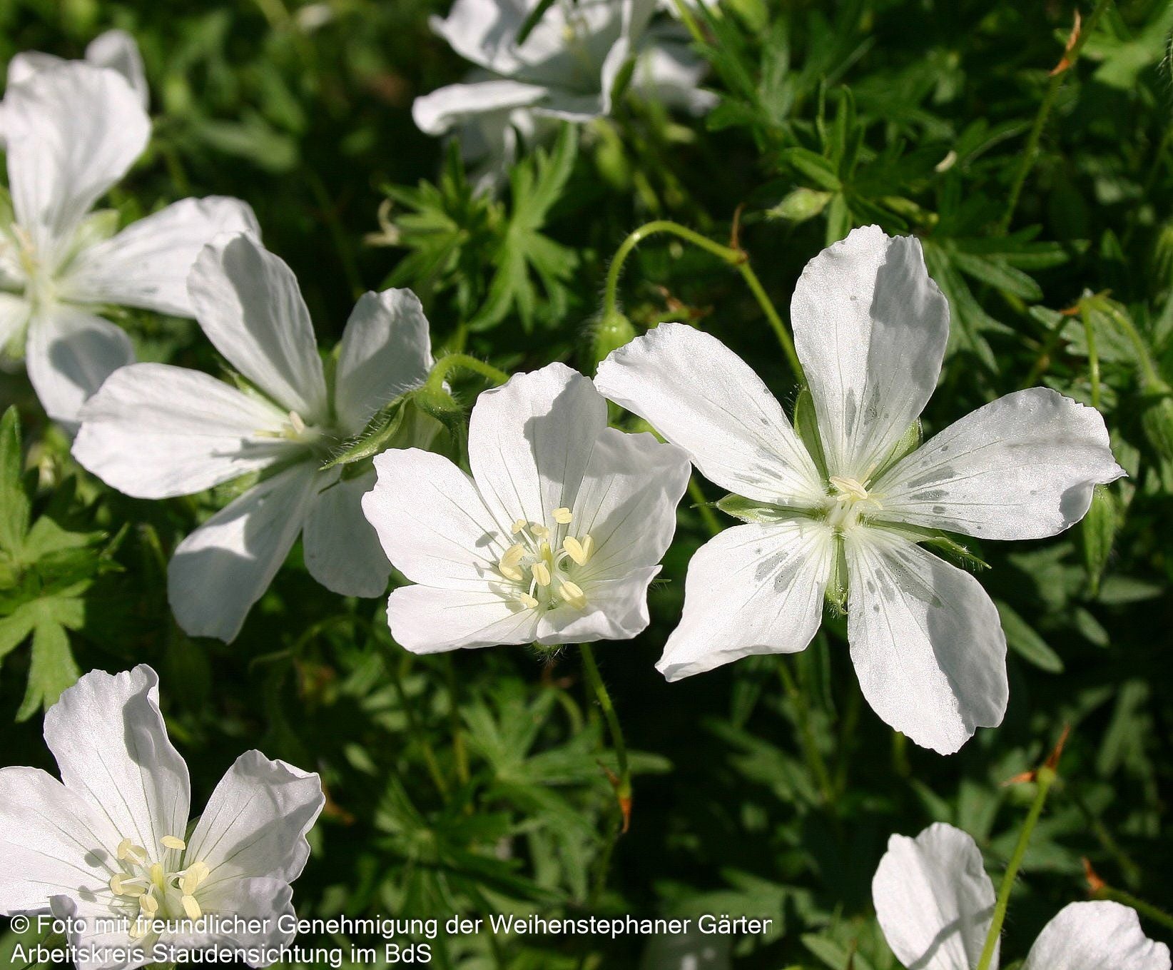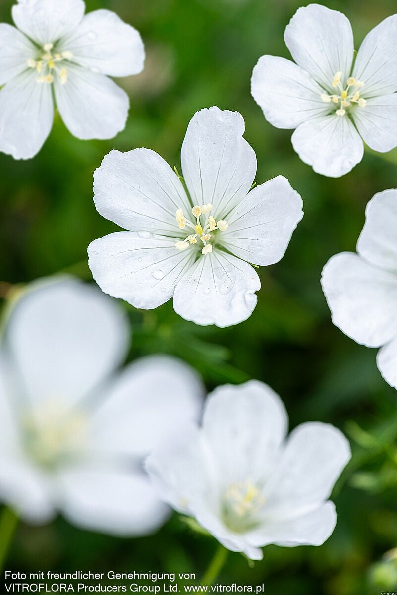 Der Schnee-Storchschnabel (Geranium sanguineum 'Album') ist eine preisgekrönte Staude des Jahres 2004 und begeistert mit seiner eleganten Erscheinung. Diese robuste Staude entwickelt von Mai bis September zauberhafte weiße, einfache Blüten in 30-40 cm Höhe über dem tief-grünen, sommergrünen Laub. Mit ihrer kissenartigen bis breitausladenden Wuchsform eignet sich diese winterharte Gehölzrandstaude hervorragend als kleinflächiger Bodendecker für sonnige Standorte mit trockenen Böden. Besonders vielseitig zeigt sich diese Sternensorte in Steinanlagen, als Gehölzrandstaude oder sogar für die extensive Dachbegrünung.