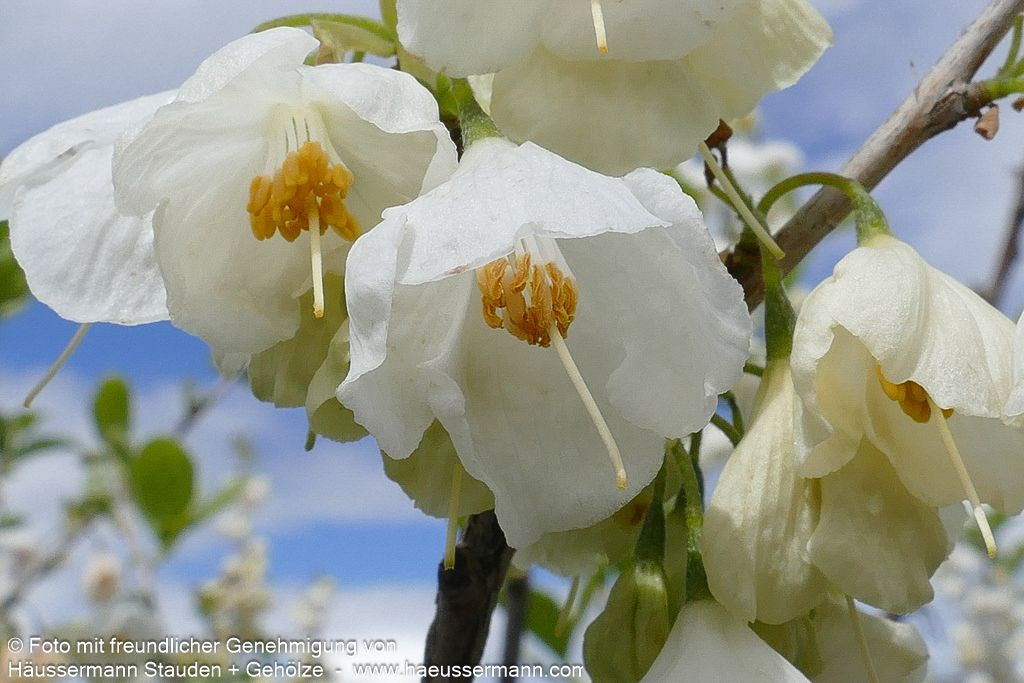 Der Schneeglöckchenbaum (Halesia carolina) verzaubert jeden Garten mit seinen zarten, reinweißen glockigen Blüten, die bereits im April und Mai erscheinen - noch vor dem Laubaustrieb. Dieser rundliche Laubstrauch entwickelt sich zu einem imposanten Großgehölz von 3-5 Metern Höhe und Breite mit breit aufrechter Wuchsform. Das sommergrüne hell- bis mittelgrüne Laub verwandelt sich im Herbst in ein leuchtendes Gelbgrün und macht ihn zu einem wertvollen herbstfärbenden Blütenschmuck. An sonnigen bis absonnigen Plätzen mit frischen bis feuchten Böden gedeiht dieser wertvolle Gartenstrauch prächtig und dient zugleich als wichtige Insektennährpflanze.