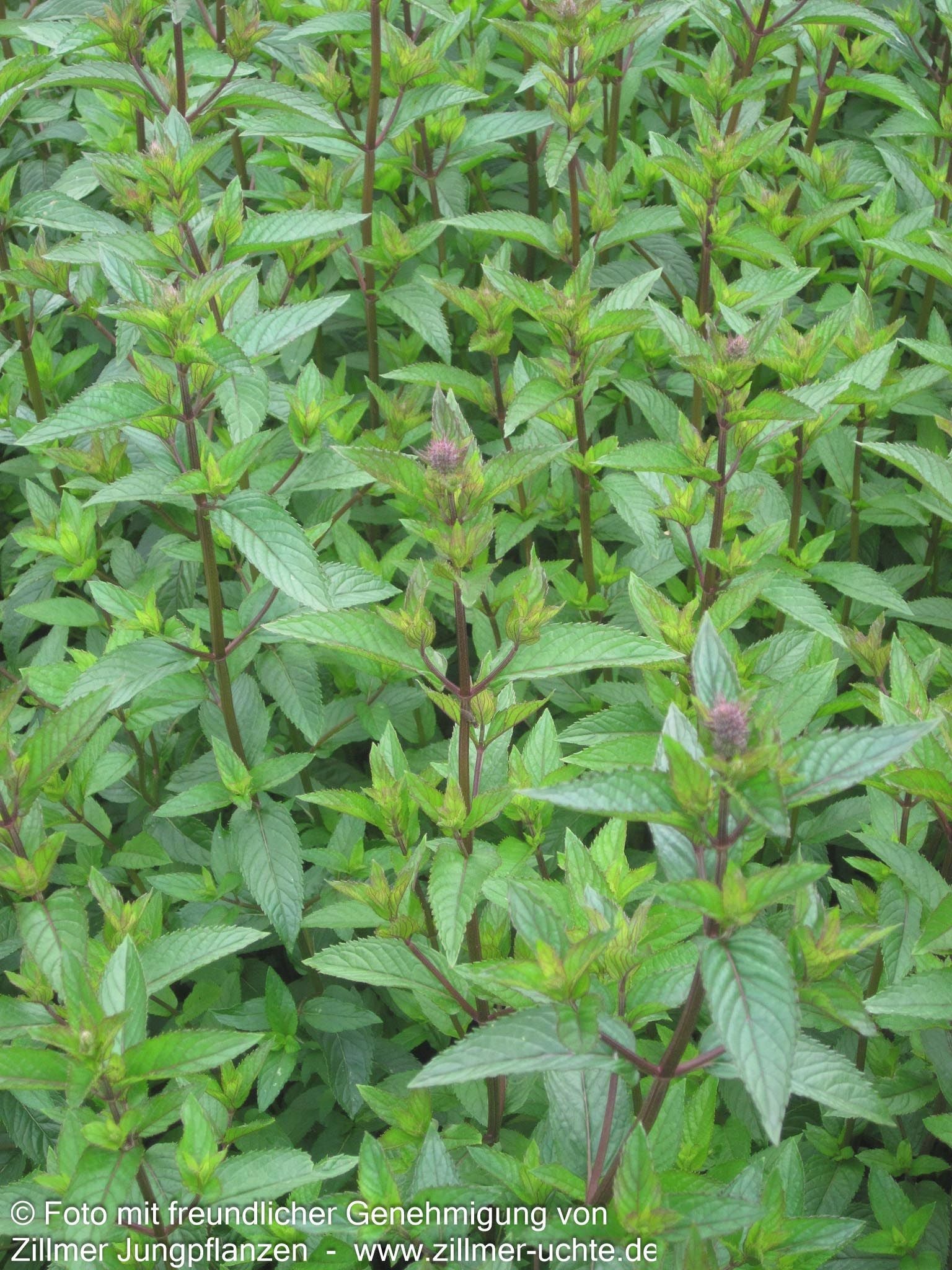 Die Schokoladen-Minze (Mentha x piperita 'Chocolate') ist eine außergewöhnliche Kräuterstaude, deren junge Blätter ein verführerisches Aroma nach Minzschokolade verströmen und sich perfekt für Süßspeisen eignen. Diese Tee-Kräuter Staude erreicht eine Wuchshöhe von 30-50 cm und schmückt sich von Juni bis September mit zarten violetten Blüten. Der aromatische Tee aus den grünen, sommergrünen Blättern wirkt wohltuend krampflösend bei Magen- und Darmbeschwerden. Diese Insektennährpflanze gedeiht optimal an sonnigen Standorten auf frischem, humusreichem Boden und benötigt reichlich Wasser. Als Bauerngarten-Klassiker bildet sie durch ihr ausläuferbildendes Wuchsverhalten dichte Bestände und ist bis -22°C winterhart. Ein Sommerrückschnitt fördert den vitalen Neuaustrieb dieser duftenden Minzen-Spezialität.