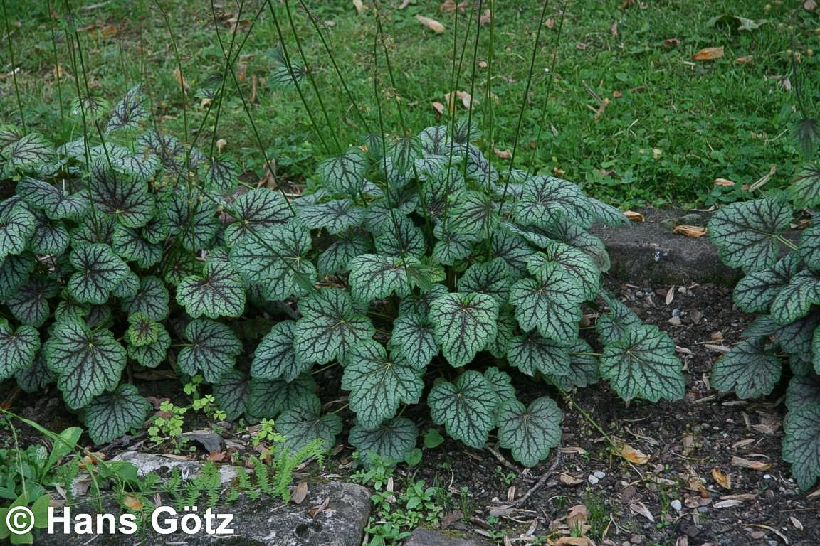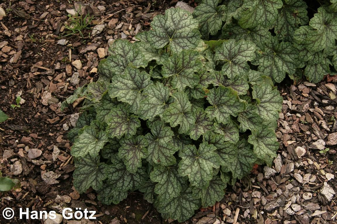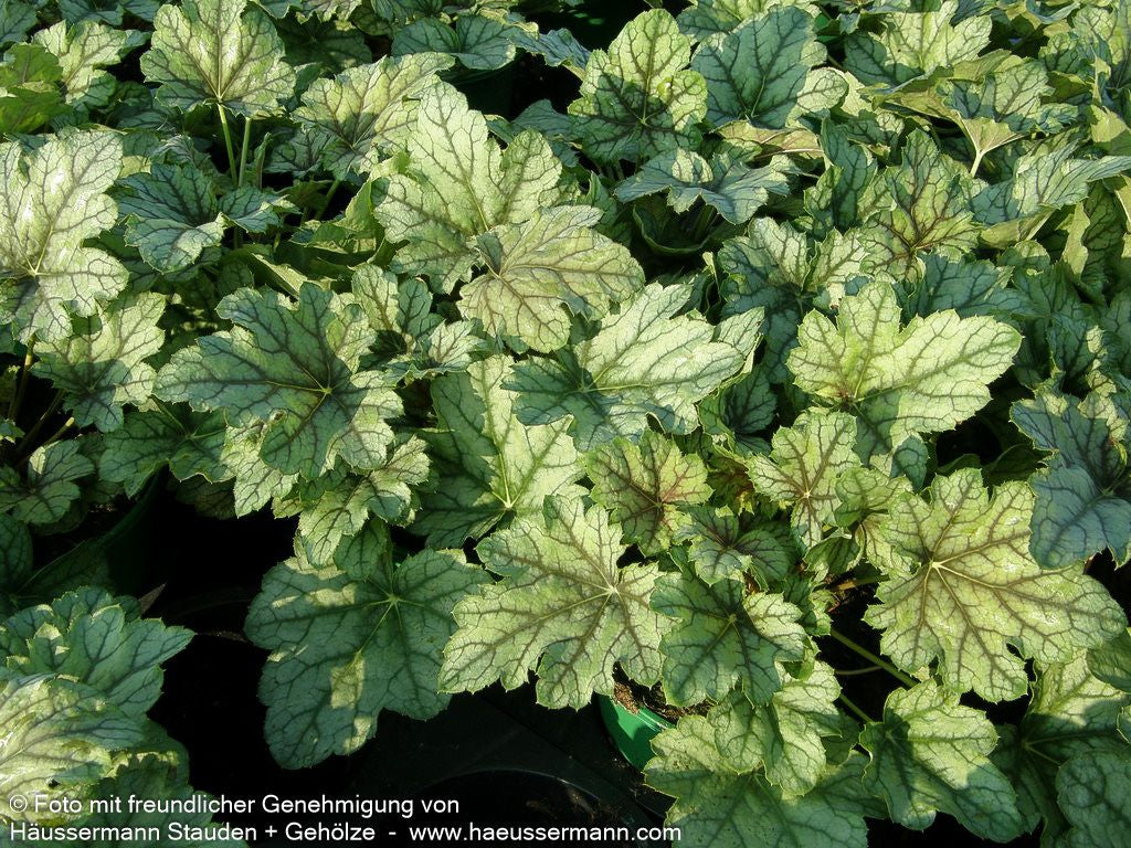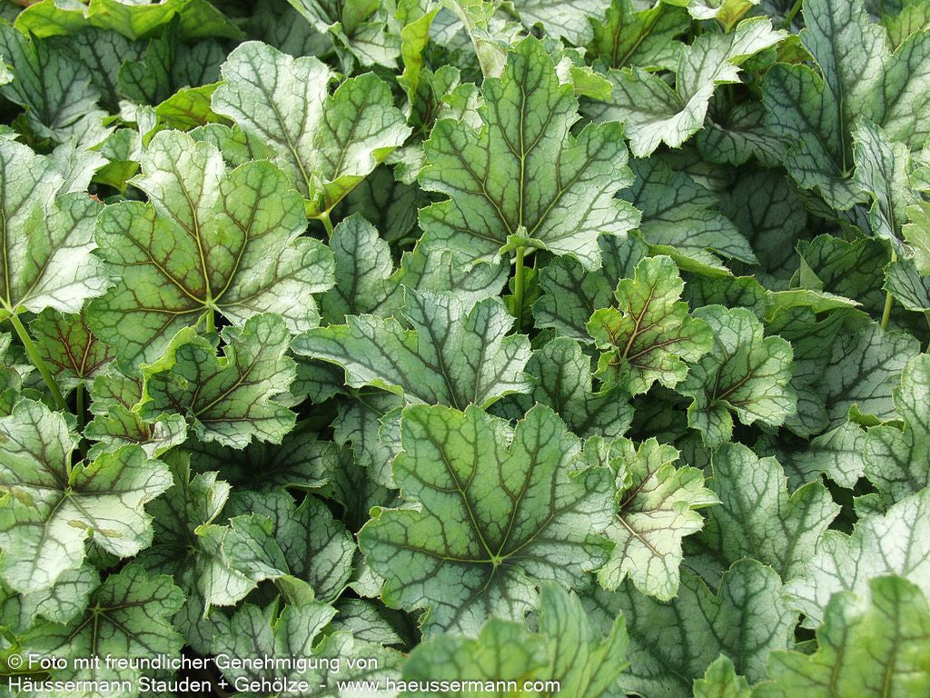 Das Silberglöckchen (Heuchera x cult. 'Venus') ist eine himmlische Staude, die mit ihren großen silberglänzenden Blättern und einem Hauch von Grün jeden Garten verzaubert. Die kontrastreich gemusterten dunklen Blattnerven verleihen dieser wintergrünen Schönheit eine besondere Eleganz. Von Mai bis Juli schmücken fast weiße Blüten die attraktive Blattrosette und setzen zarte Akzente. Diese robuste Staude gedeiht optimal an halbschattigen bis wechselsonnigen Plätzen und ist mit ihren wintergrünen Eigenschaften ein Blickfang zu jeder Jahreszeit. Die weißen Blüten harmonieren perfekt mit der silbrigen Blattfärbung. 'Venus' eignet sich hervorragend als Begleitstaude zu Rhododendron und bereichert schattige Gartenpartien mit ihrer außergewöhnlichen Blattstruktur.