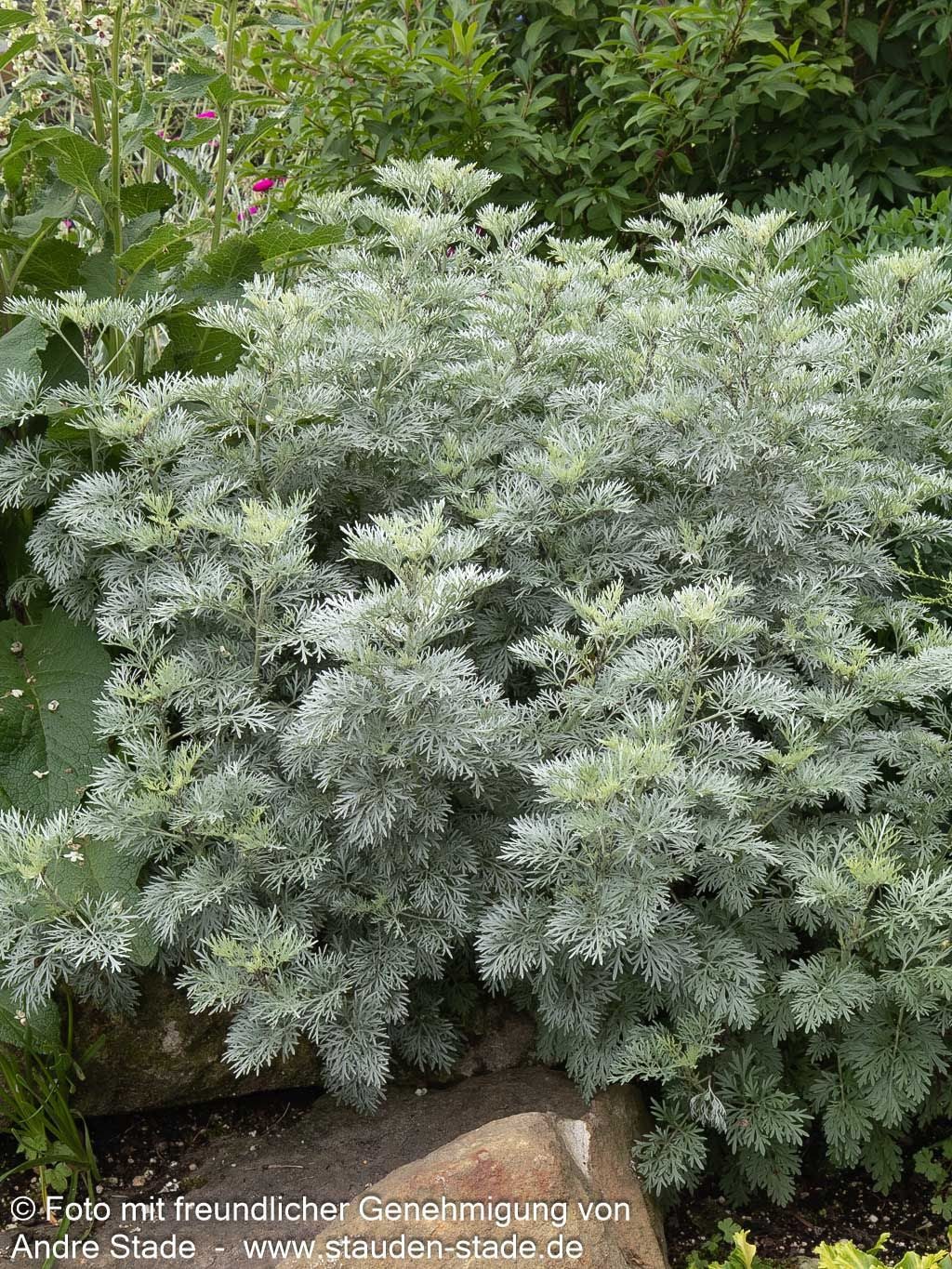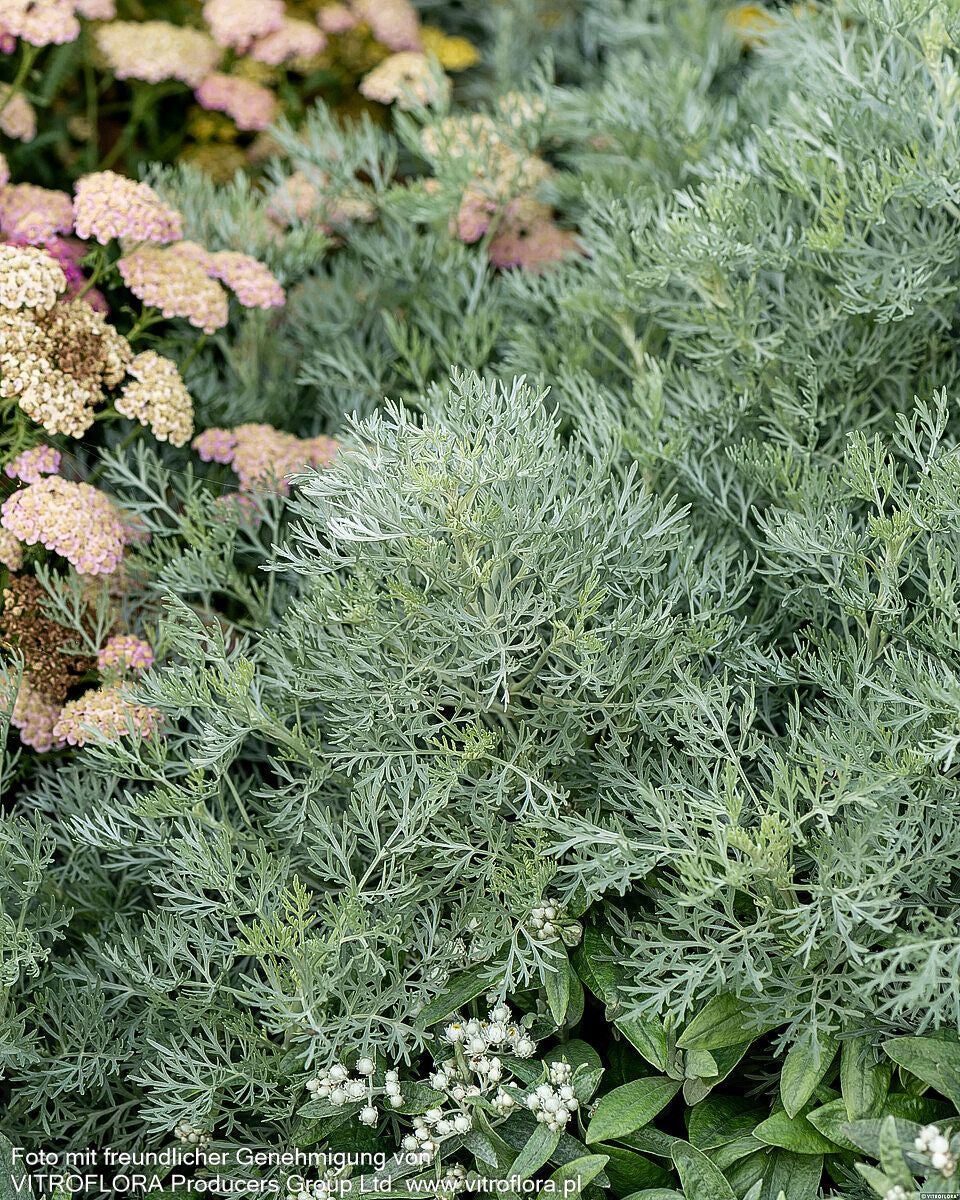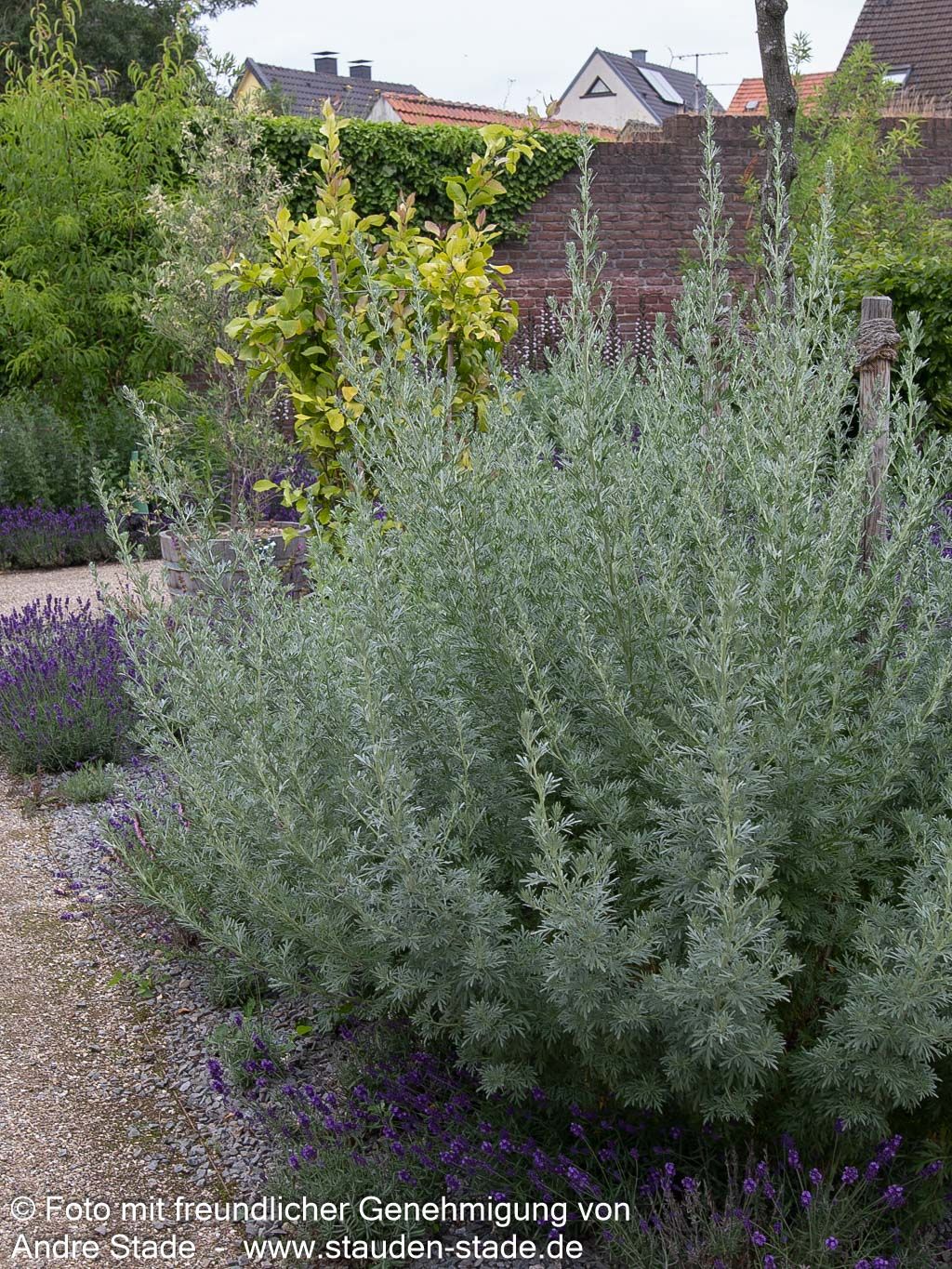 Der Silbrige Strauch-Wermut (Artemisia arborescens 'Powis Castle') ist eine außergewöhnliche Staude, die mit ihren weißgrauen, duftenden Blättern einen besonderen Akzent in jeden Garten bringt. Diese robuste Pflanze erreicht eine Höhe von 60-100 cm und entwickelt von Juli bis September unscheinbare, hell-gelbe Blüten, die einen angenehmen Kontrast zum silbrigen Laub bilden. Als Leitstaude eignet sie sich perfekt für sonnige Standorte mit trockenen Böden und ist eine Bereicherung für Bauerngärten, Freiflächen und Steinanlagen. Die sommergrüne Staude besticht durch ihre besondere Blattstruktur und den charakteristischen Blattduft, der typisch für Wermut-Arten ist und bereits in der Antike geschätzt wurde.