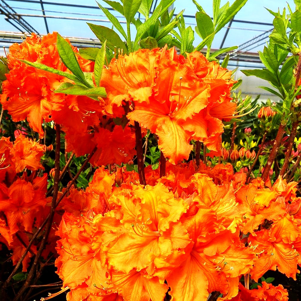 Die Sommergrüne Azalee (Rhododendron luteum 'Gibraltar' I) verzaubert mit ihrer leuchtend orangenen bis rotorangenen Blütenpracht, die von einem markanten dunkelorangen Fleck akzentuiert wird. Dieser kompakte Kleinstrauch wächst breit aufrecht und erreicht eine Höhe von 1,5 bis 2 Metern. Von Mai bis Juni entfalten sich die Blüten mit ihrem charakteristisch stark gekräuselten Saum – ein echter Blütenschmuck für jeden Garten. Als sommergrünes Laubgehölz aus der Gruppe der Laubabwerfenden Azaleen eignet sich diese prächtige Azalee ideal für das Moorbeet. Sie bevorzugt sonnige bis halbschattige und absonnige Standorte mit frischen bis feuchten Böden. Wichtig: Diese Schönheit ist kalkempfindlich und dankt Ihnen saure Bodenverhältnisse mit einer üppigen orangenen Blütenfülle.