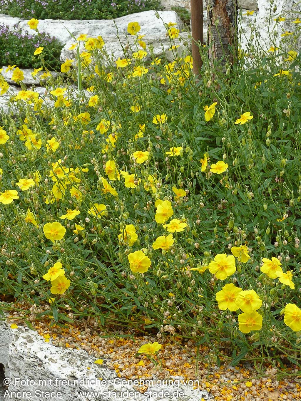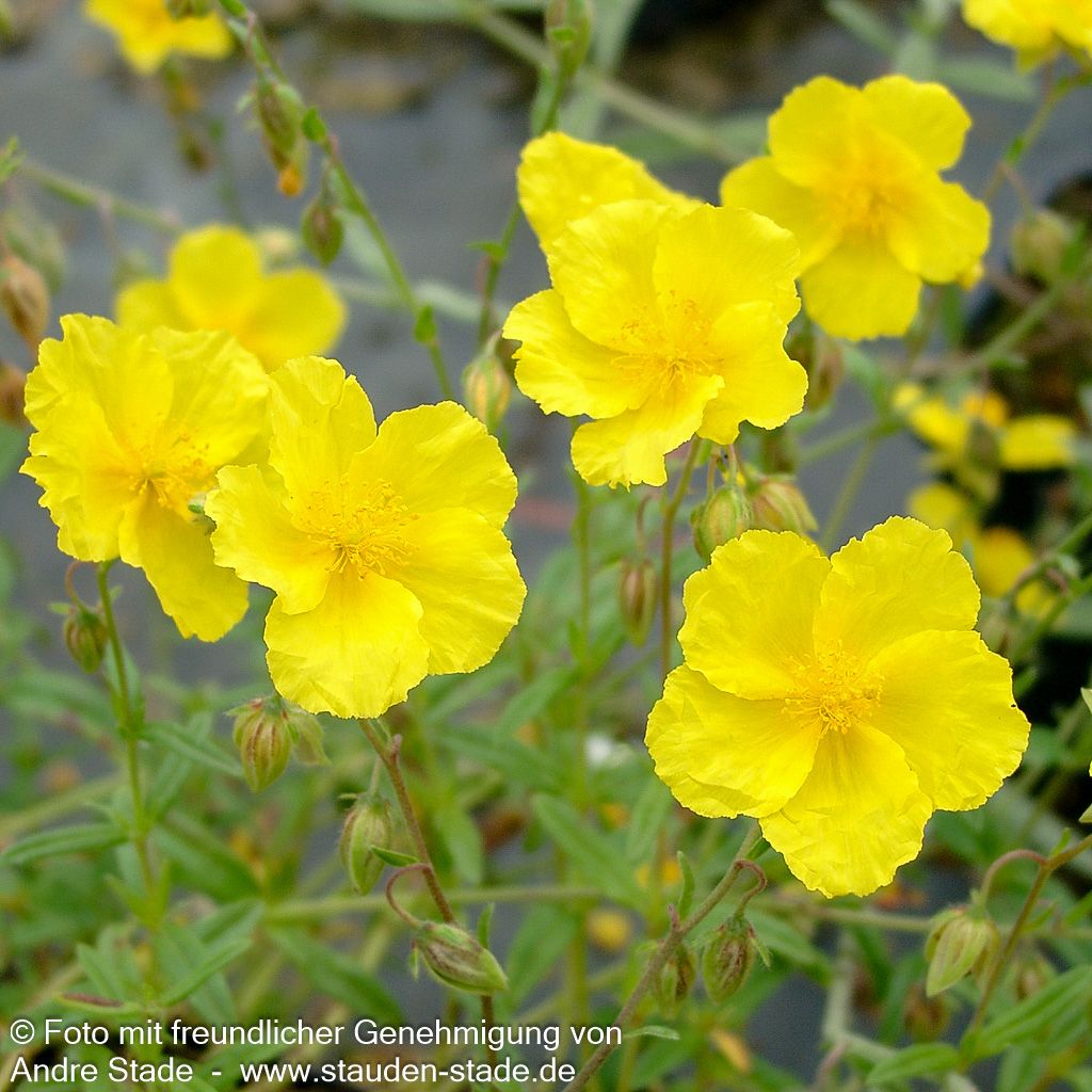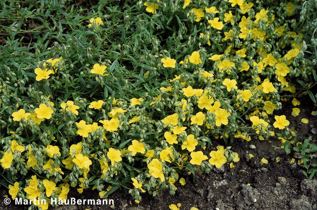 Das Sonnenröschen (Helianthemum x cult. 'Golden Queen') verzaubert mit seinen leuchtend gelben, einfachen Blüten von Mai bis August und erreicht dabei eine kompakte Blütenhöhe von 20 cm. Diese robuste Staude besticht durch ihr dunkel-grünes, wintergrünes Laub und eignet sich perfekt als kleinflächiger Bodendecker. Als Sternensorte der deutschen Staudensichtung gedeiht sie optimal an sonnigen Standorten auf trockenen bis frischen Böden und ist winterhart bis -17°C. Besonders wertvoll ist sie als Insektennährpflanze und für Steinanlagen, Felssteppen und Mauerkronen.