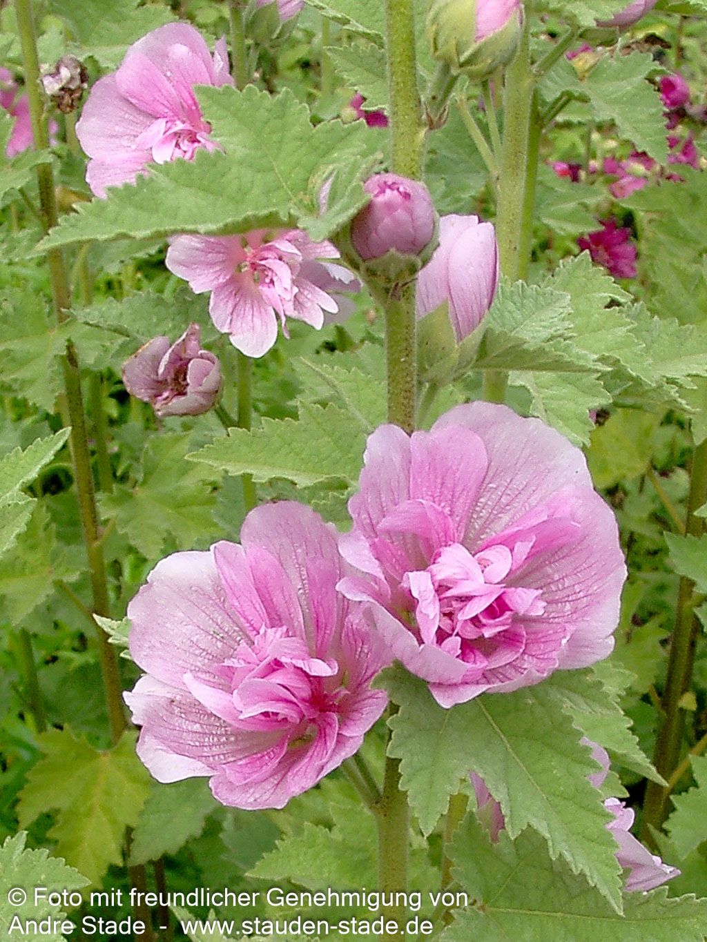 Die Strauch-Stockrose (Alcalthaea suffrutescens 'Parkrondell') ist eine außergewöhnliche Züchtung, die mit ihren dunkelrosa gefüllten Blüten und rot verbänderten Staubgefäßen von Juni bis September begeistert. Diese als Sternensorte bewertete Staude erreicht eine imposante Blütenhöhe von 100-120 cm und eignet sich perfekt für Bauerngärten. Mit ihren dunkel-grünen, sommergrünen Blättern gedeiht sie optimal an sonnigen Standorten auf frischen bis trockenen Böden. Als vielseitige Leitstaude eignet sie sich sowohl als Beetstaude als auch für Freiflächenpflanzungen und ist bis -17°C winterhart.