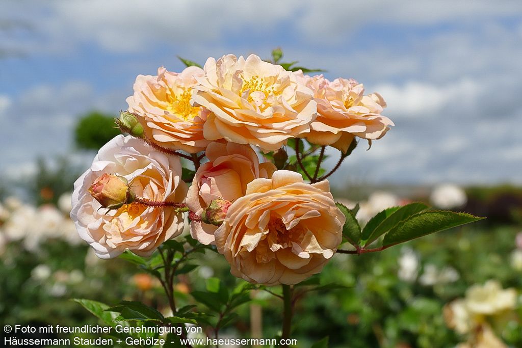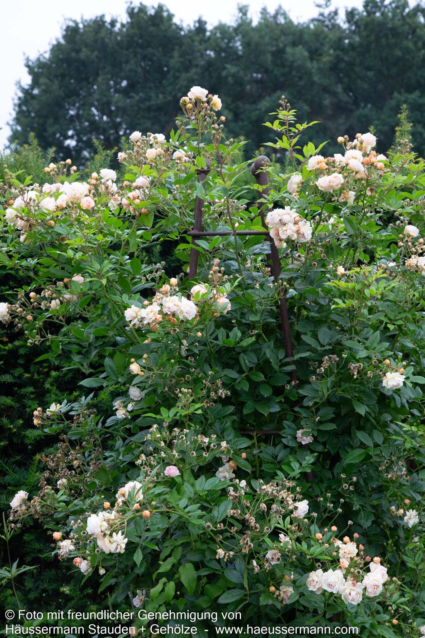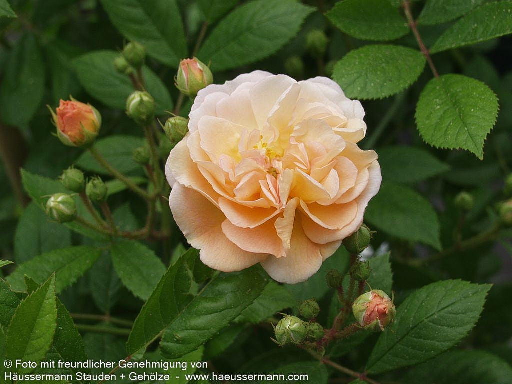 Die Strauchrose 'Ghislaine de Feligonde' (Rosa 'Ghislaine de Feligonde' STR IV) ist eine bewährte Rosensorte aus dem Jahr 1916, die Gartenliebhaber mit ihrer außergewöhnlichen Vielseitigkeit begeistert. Von Mai bis in den September schmückt sie Ihren Garten mit kleinen gefüllten Blüten in zartem Gelborange, die zu rosaweiß verblassen und einen reichlichen, intensiven Duft verströmen. Diese robuste Strauchrose erreicht eine Höhe von 150-200 cm und überzeugt durch ihren kräftigen, überhängenden Wuchs - sie kann sogar als Rambler verwendet werden. Mit ihrer guten Mehltauresistenz und Rußtauresistenz sowie dem dunkelgrünen Laub ist sie ideal als Solitär oder für Schnittzwecke geeignet.