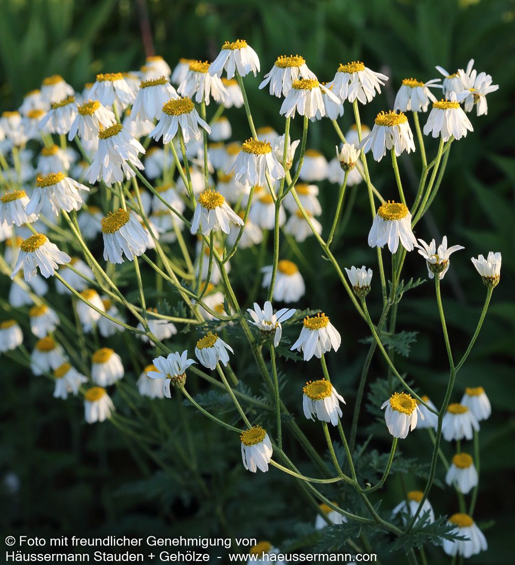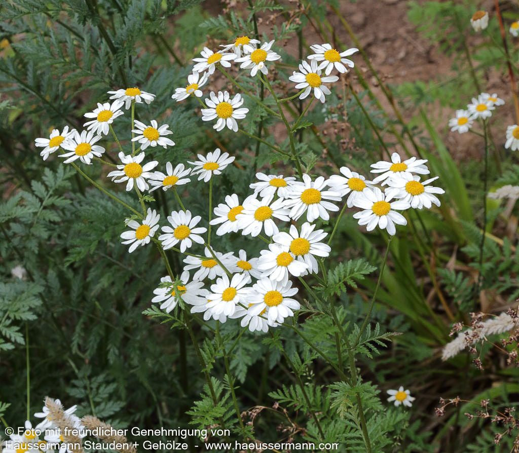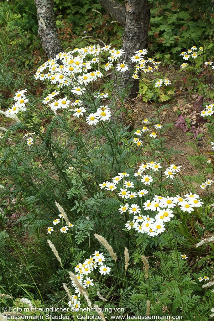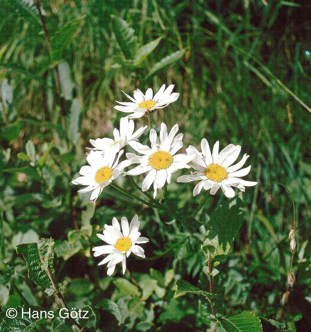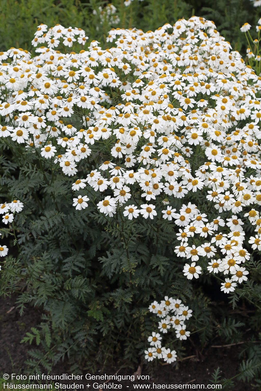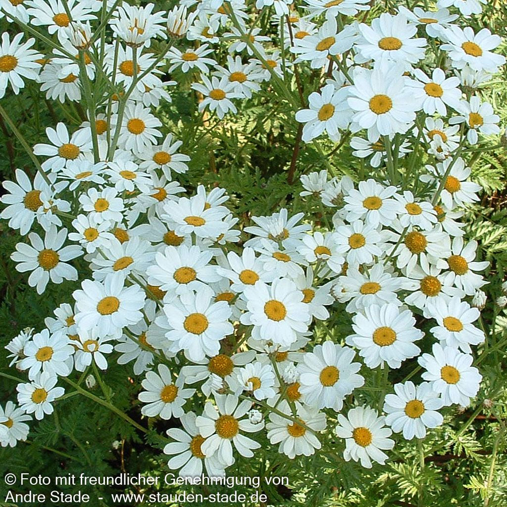 Die Strauß-Margerite (Tanacetum corymbosum) ist eine bezaubernde heimische Staude, die mit ihren strahlend weißen, einfachen Blüten von Juni bis Juli jeden Garten bereichert. Diese robuste Pflanze erreicht eine beeindruckende Blütenhöhe von 80 bis 120 cm und entwickelt dunkel-grüne, sommergrüne Blätter mit einem charakteristischen Blatt- oder Blütenduft. Als Insektennährpflanze lockt sie Bienen und Schmetterlinge an und eignet sich hervorragend für Schnittzwecke und Floristik. Die buschig wachsende Margerite gedeiht optimal an sonnigen Standorten und toleriert sowohl trockene als auch frische Böden. Als winterharte Z7-Staude eignet sie sich perfekt als Leitstaude sowohl für Gehölzrandstauden-Pflanzungen als auch für Freiflächenstauden-Bereiche.
