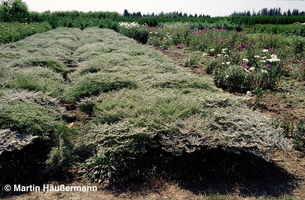 Der Tatarenschleier (Goniolimon tataricum) ist eine außergewöhnliche Staude mit zartem Charme und vielseitigen Einsatzmöglichkeiten. Diese prämierte Sternensorte entwickelt ihre weißen, einfachen Blüten von Juli bis August in einer Höhe von 30 cm über dem rosettenartigen Blattwerk. Die grünen, wintergrünen Blätter bilden eine attraktive Grundlage für die luftigen Blütenstände. Perfekt gedeiht diese winterharte Staude an sonnigen Standorten mit trockenen Böden, sei es in Steinanlagen, Felssteppen oder Freiflächen. Als wertvolle Insektennährpflanze bereichert sie nicht nur den Bauerngarten, sondern eignet sich auch hervorragend für Schnittzwecke in der Floristik.