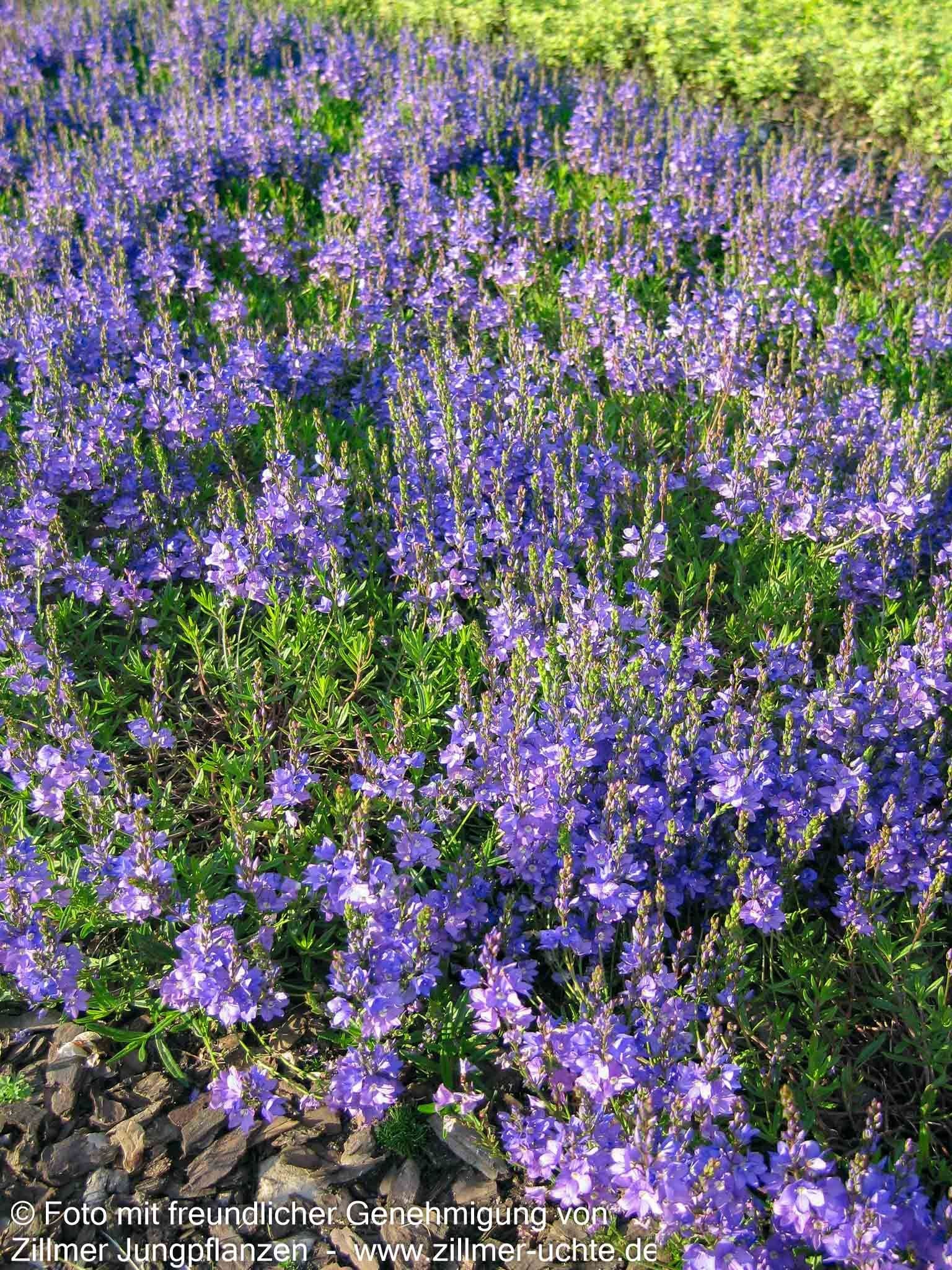 Der Teppich-Ehrenpreis (Veronica prostrata) ist eine außergewöhnliche heimische Staude, die als Staude des Jahres 2007 ausgezeichnet wurde. Diese bezaubernde Staude bildet mit ihrer teppichartigen Wuchsform dichte Matten und erreicht eine Blütenhöhe von 10 bis 15 cm. Von Mai bis September verzaubert sie mit ihren blauen, einfachen Blüten und den grünen, sommergrünen Blättern. Als idealer Bodendecker gedeiht sie perfekt an sonnigen Standorten mit trockenen Böden und eignet sich hervorragend für Steinanlagen, Steinfugen oder Mauerkronen. Diese winterharte Sternensorte ist zudem eine wertvolle Insektennährpflanze und mit ihrer Winterhärte bis -28°C absolut zuverlässig.