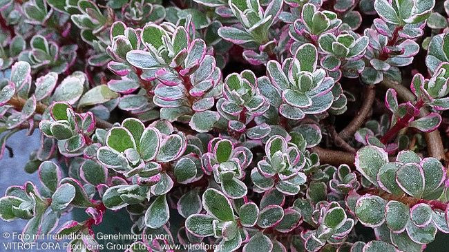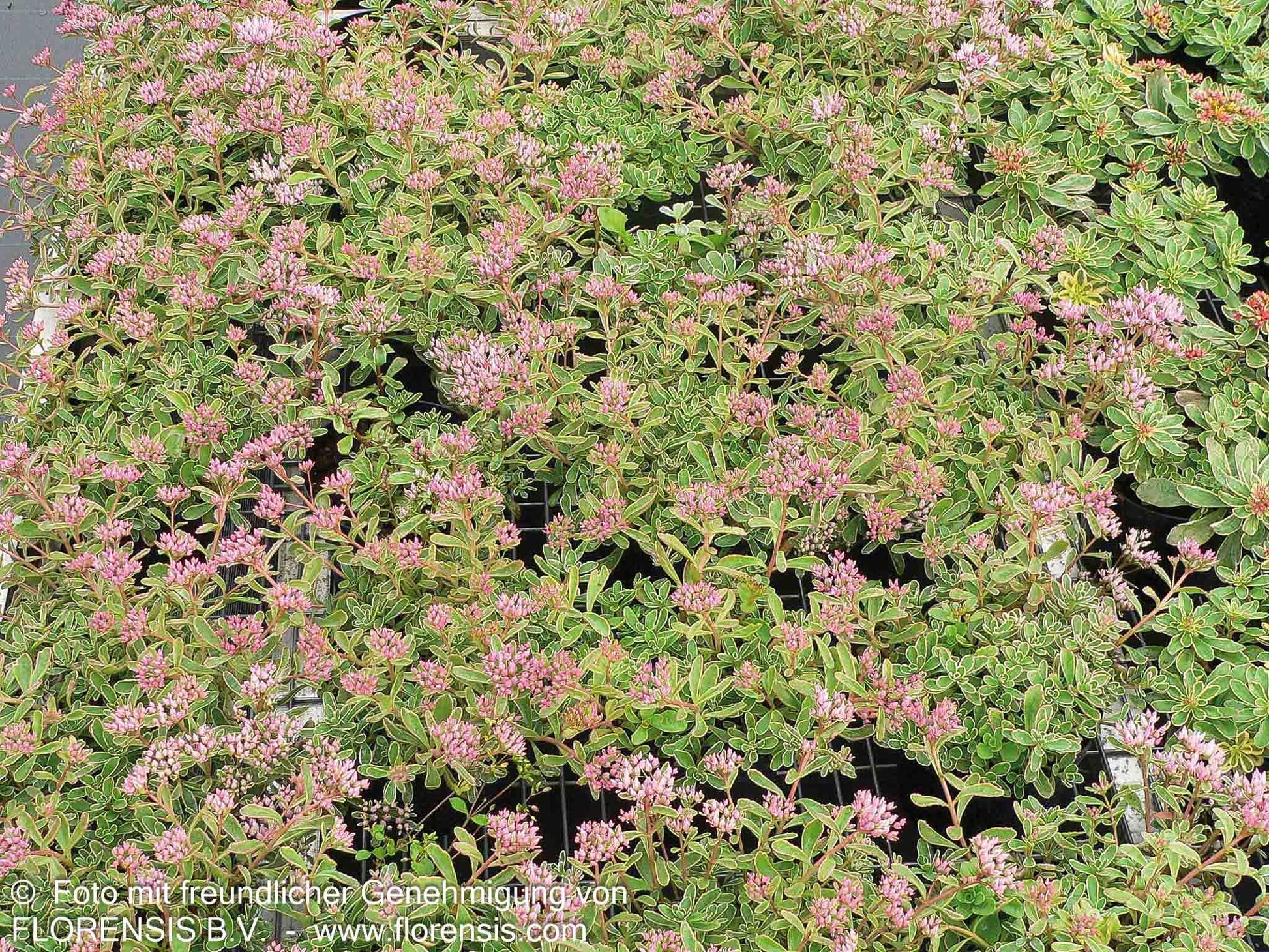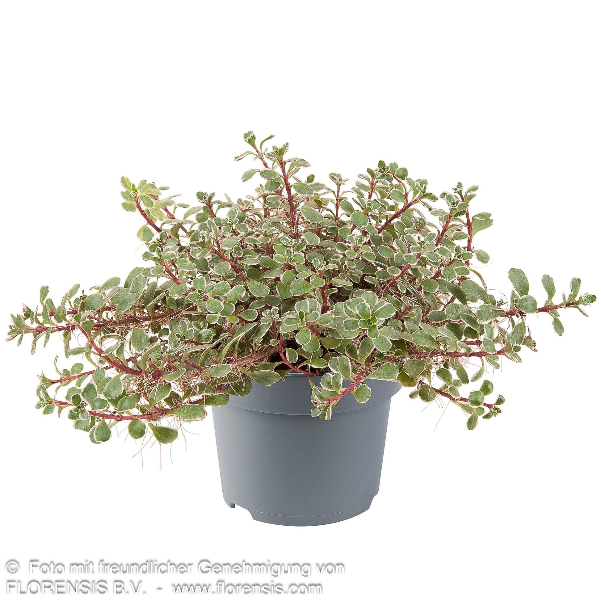 Das Teppich-Fettblatt (Sedum spurium 'Tricolor') ist eine außergewöhnliche Staude, die mit ihrer dreifarbigen Blattfärbung in Grün, Rosa und Weiß jeden Garten bereichert. Diese prämierte Sternensorte bildet dichte, teppichförmige Matten und erreicht eine Blütenhöhe von nur 10-15 cm. Von Juli bis August schmücken rosa Blüten die sukkulente Pflanze und locken als Insektennährpflanze zahlreiche Bestäuber an. Das wintergrüne Laub mit seiner besonderen Textur macht sie zu einem ganzjährigen Blickfang. Diese vielseitige Staude gedeiht an sonnigen bis absonnigen Plätzen auf frischem Boden und eignet sich perfekt als kleinflächiger Bodendecker, für Steinanlagen oder sogar für die extensive Dachbegrünung.