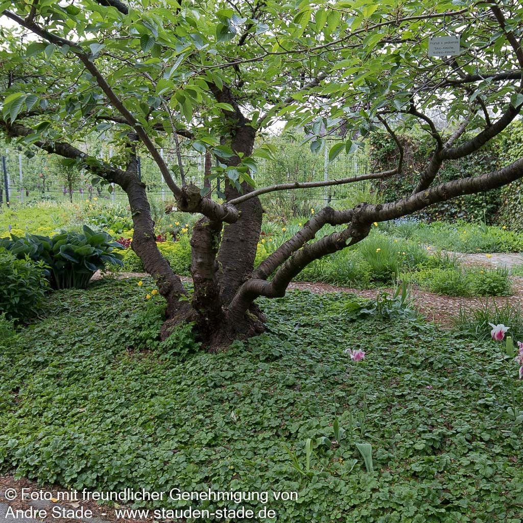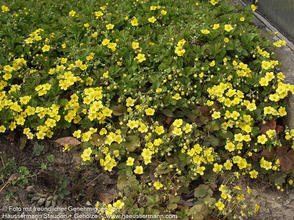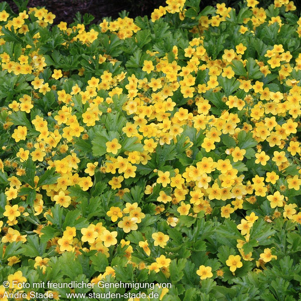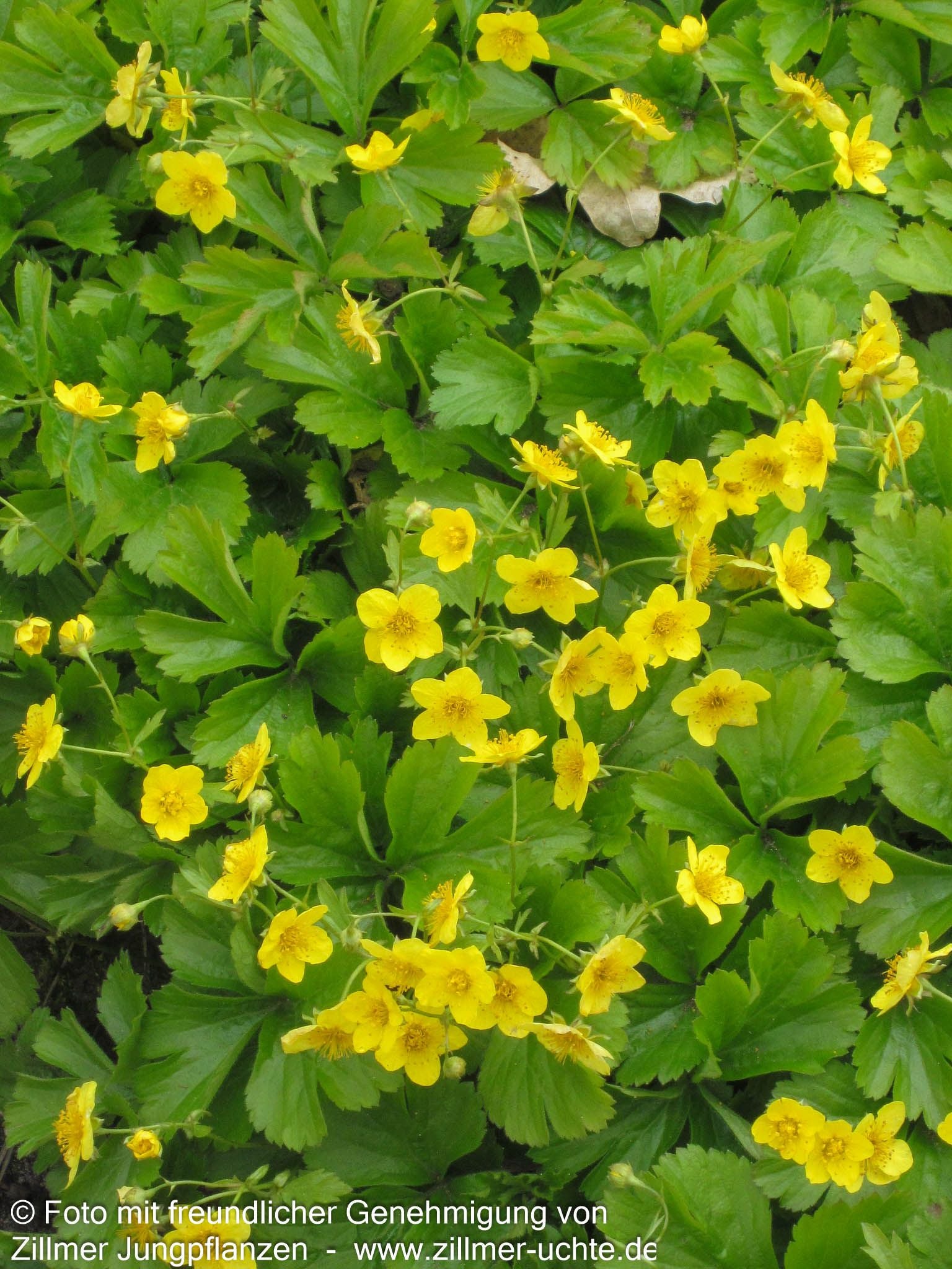 Die Teppich-Golderdbeere (Waldsteinia ternata) ist eine bezaubernde Staude, die mit ihren leuchtend gelben, einfachen Blüten von April bis Juni jeden Garten bereichert. Diese winterharte Bodendeckerin entwickelt sich zu einem dichten, teppichartigen Wuchs und erreicht eine Blütenhöhe von 10-15 cm. Als Sternensorte der deutschen Staudensichtung überzeugt sie mit ihrer Robustheit und Schönheit. Die wintergrünen, grünen Blätter sorgen auch außerhalb der Blütezeit für attraktive Akzente. Ideal gedeiht diese frische Böden liebende Staude an halbschattigen bis wechselsonnigen Plätzen unter Gehölzen. Als großflächiger Bodendecker eignet sie sich hervorragend für Pflanzungen zu Rhododendron und ist sogar für Grabstätten geeignet.