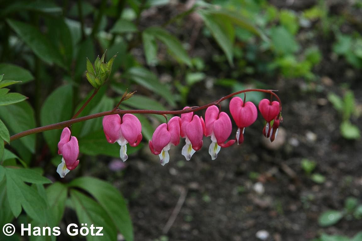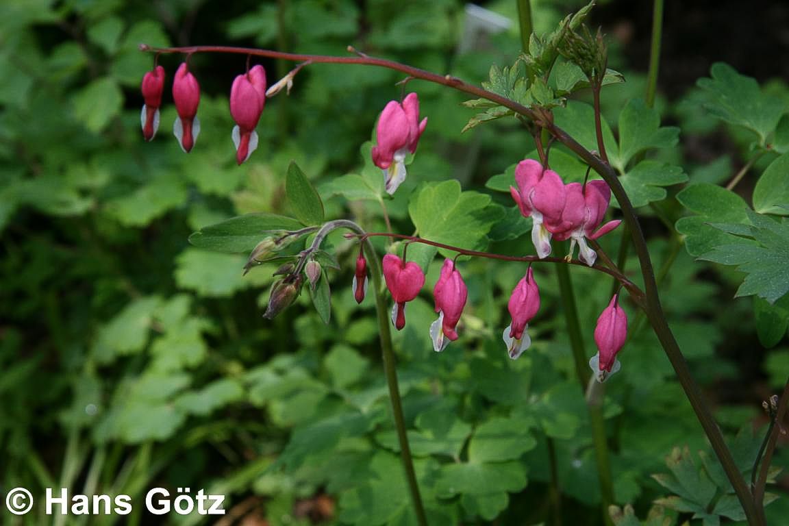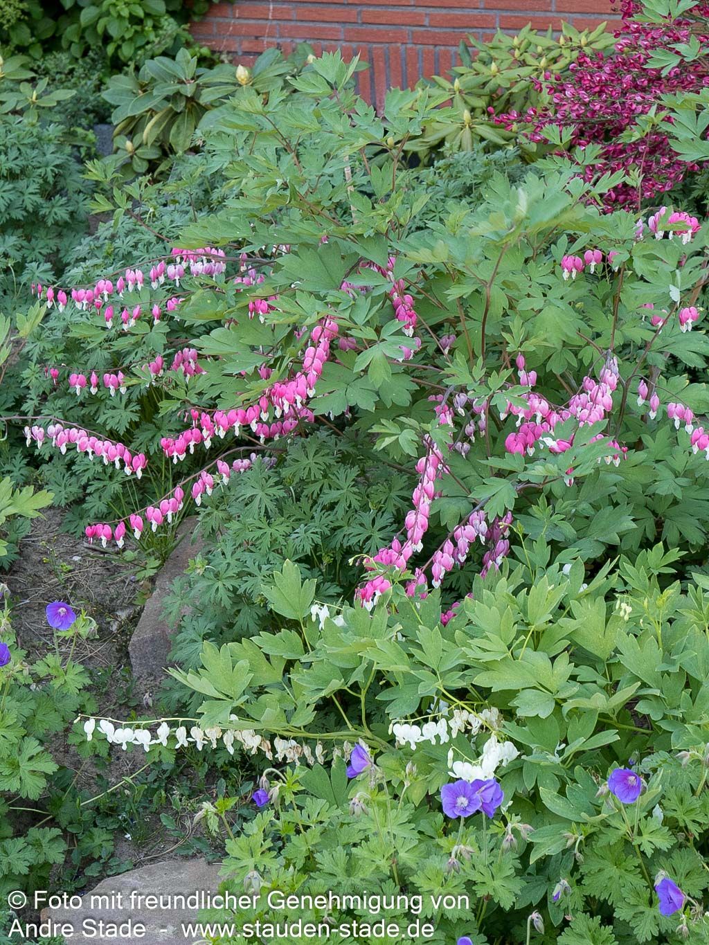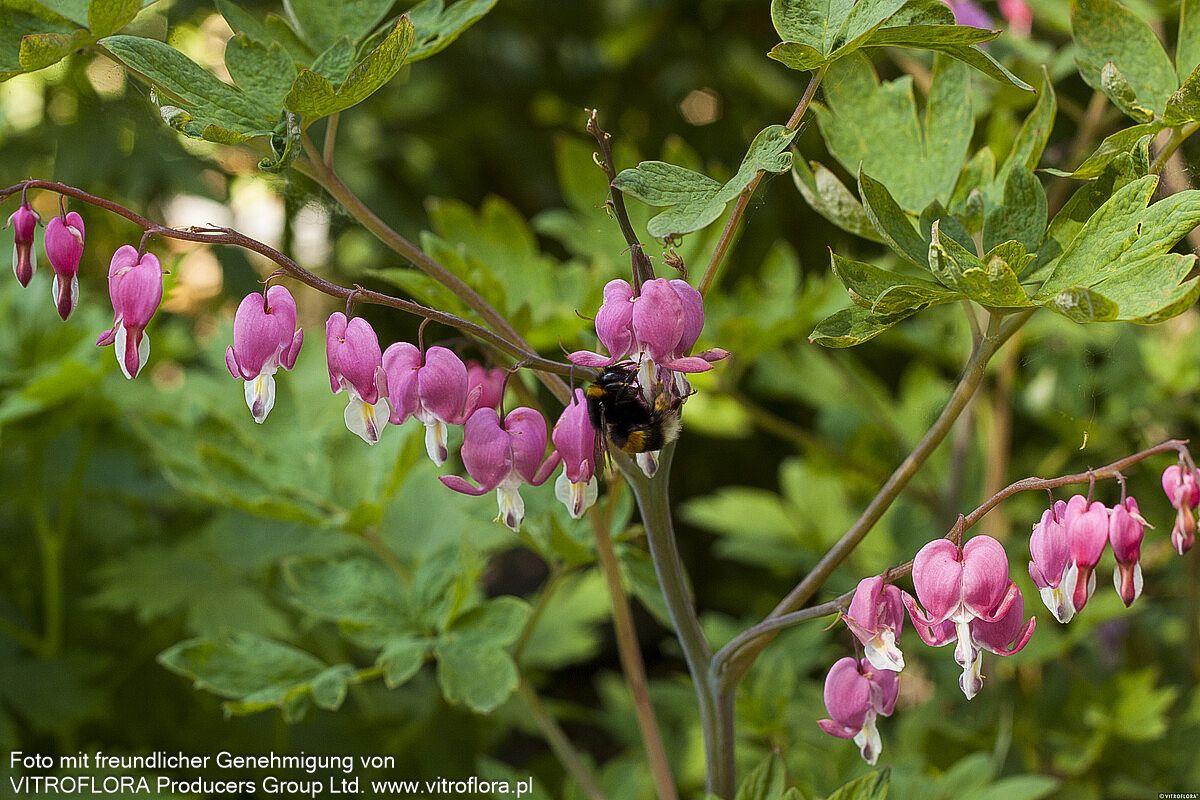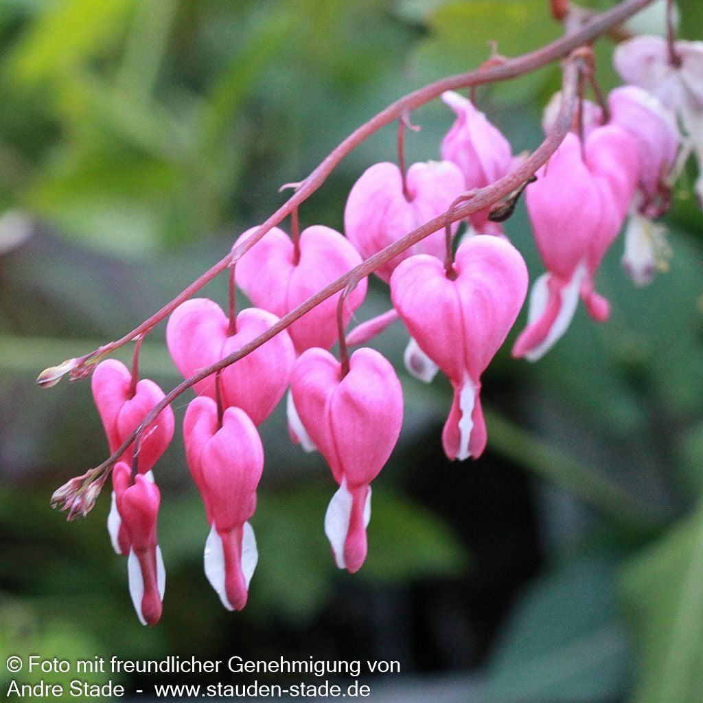 Das Tränende Herz (Dicentra spectabilis) ist eine bezaubernde Staude mit herzförmigen, rosa-weißen Blüten, die von Mai bis Juni an 80 cm hohen Stielen elegant herabhängen. Diese ausgezeichnete Sternensorte entwickelt ein blaugrünes, sommergrünes Blattwerk mit einer Höhe von 60 cm und zeigt eine ausladend bis breitausladende Wuchsform. Als vielseitige Gehölzrandstaude und Beetstaude gedeiht sie optimal an sonnigen bis absonnigen Standorten mit frischem Boden. Diese winterharte Leitstaude ist eine romantische Bereicherung für jeden Bauerngarten und sollte mit einem Pflanzabstand von 60-80 cm gesetzt werden.