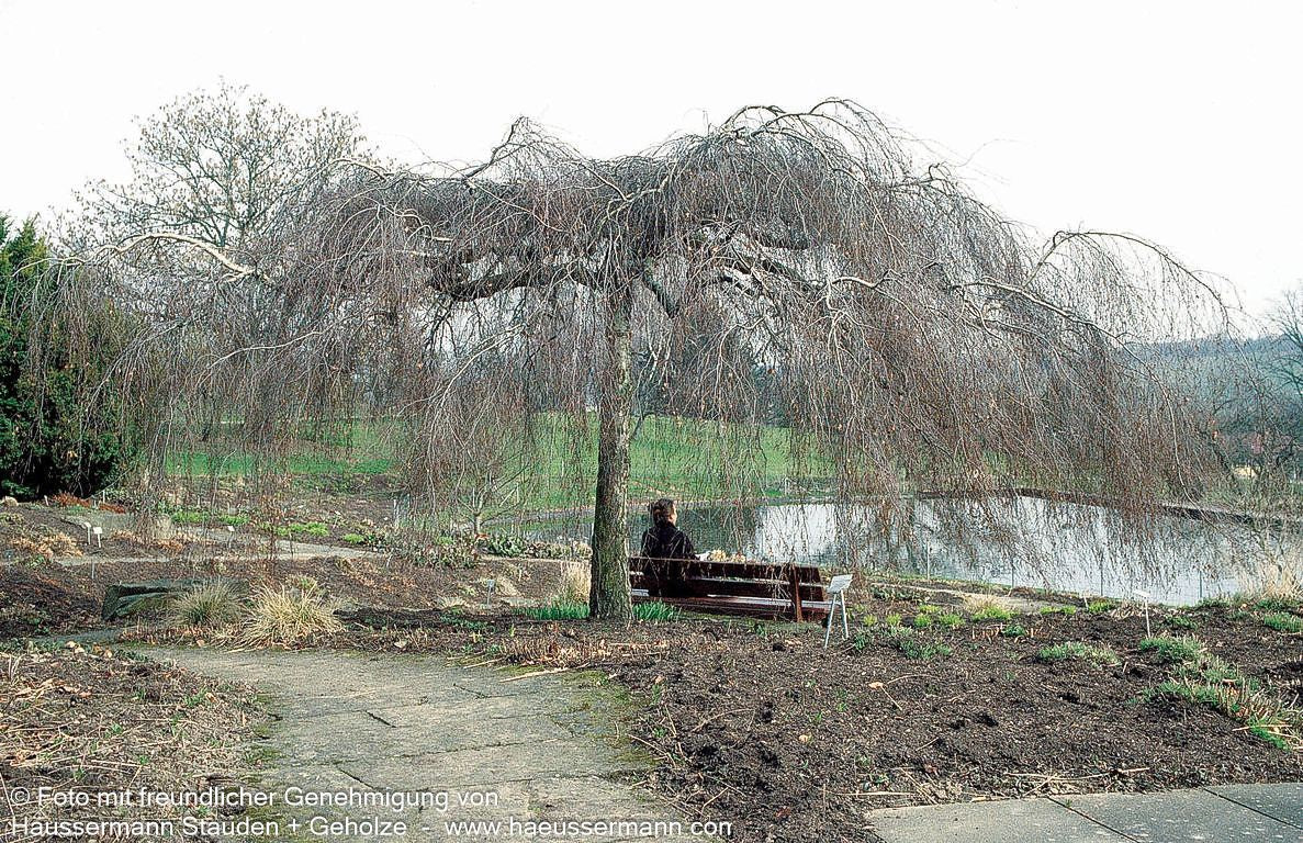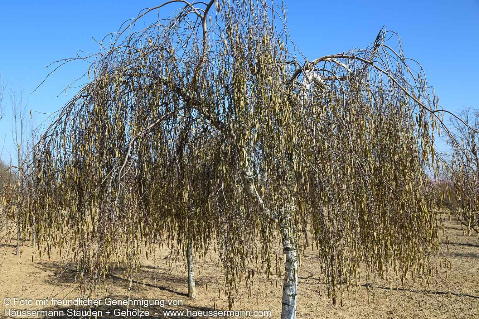Die Trauer-Birke (Betula pendula 'Youngii') ist ein bezaubernder kleiner Baum mit charakteristischer schirmartiger Krone, der mit seiner eleganten Hängeform jeden Garten zu einem besonderen Blickfang macht. Diese Laubgehölze erreichen eine Höhe von 4-6 Metern und begeistern mit ihren oft bis zum Boden herunterhängenden Ästen. Die frischgrünen, kleinen Blätter zeigen sich im Herbst in leuchtendem Goldgelb und sorgen für eine spektakuläre herbstfärbende Wirkung. Besonders reizvoll ist der Rindenschmuck der weißen Stämme, der vor allem in der laublosen Zeit einen faszinierenden Farbaspekt schafft. Die Trauer-Birke gedeiht optimal an sonnigen bis halbschattigen Standorten auf frischen bis feuchten Böden. Mit ihrer zarten Blüte von April bis Mai und als sommergrünes Gehölz ist diese Großgehölze perfekt für die Einzelstellung auch in kleineren Gärten geeignet.