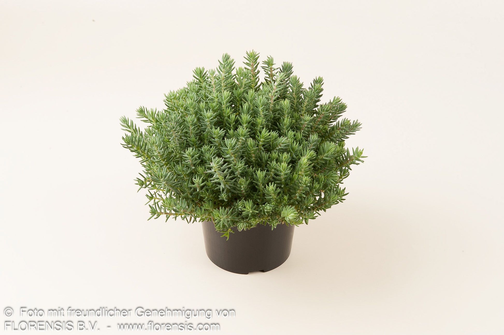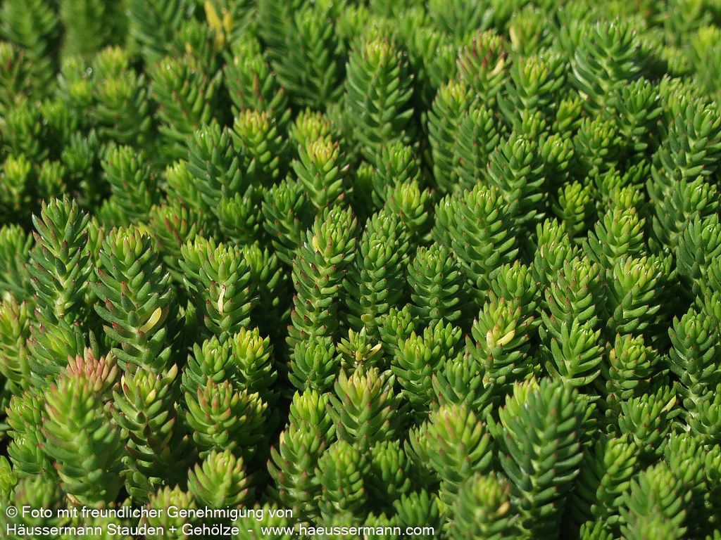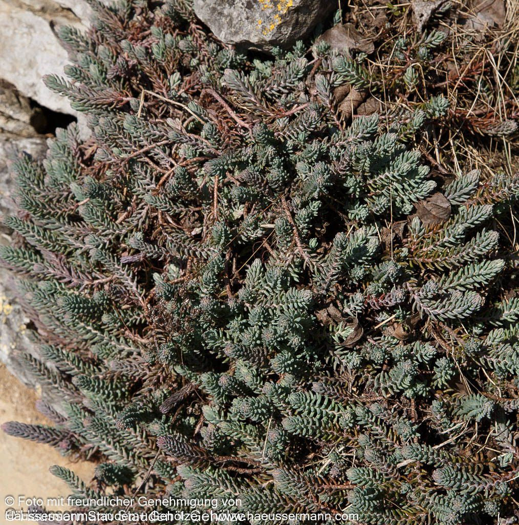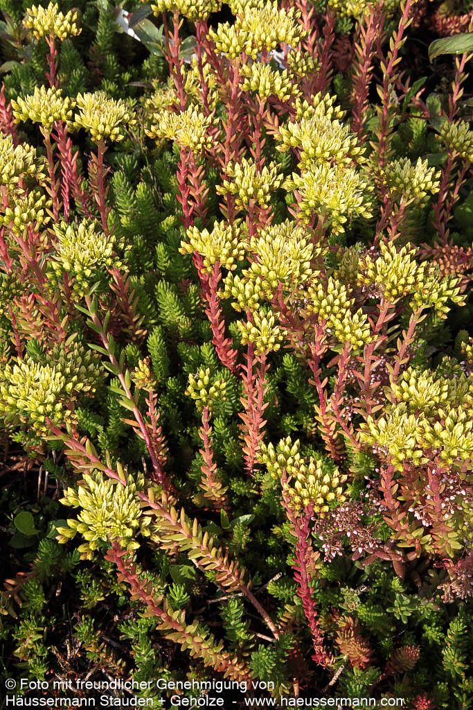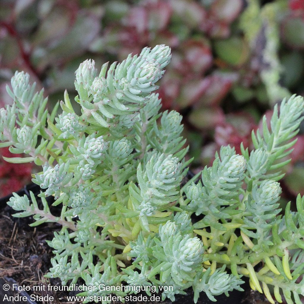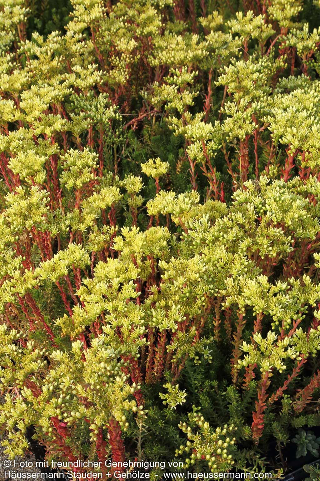 Der Tripmadam (Sedum reflexum) ist eine außergewöhnliche heimische Staude, die mit ihren tief-gelben Blüten von Juli bis August begeistert. Diese robuste Fit-Kräuter-Sorte erreicht eine Blütenhöhe von 20 bis 25 cm und überzeugt mit ihrem kriechenden, teils wurzelnden Wuchsverhalten als perfekter Bodendecker. Die graugrünen, wintergrünen Blätter bilden einen reizvollen Kontrast zu den goldgelben Blüten. Als Sternensorte der deutschen Staudensichtung und zweifache Staude des Jahres (2000 und 2011) ist diese kulinarisch bedeutsame Insektennährpflanze ideal für sonnige Standorte mit trockenen Böden geeignet und eignet sich hervorragend für Steinanlagen und sogar die extensive Dachbegrünung.
