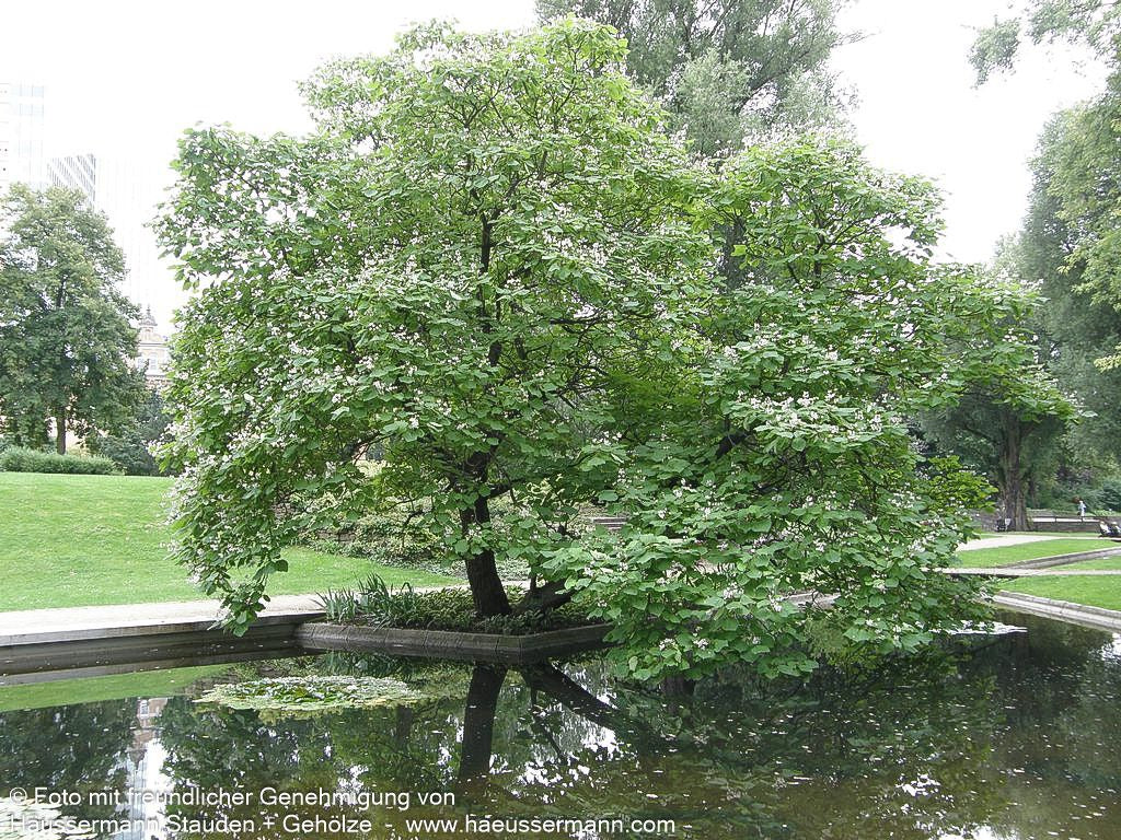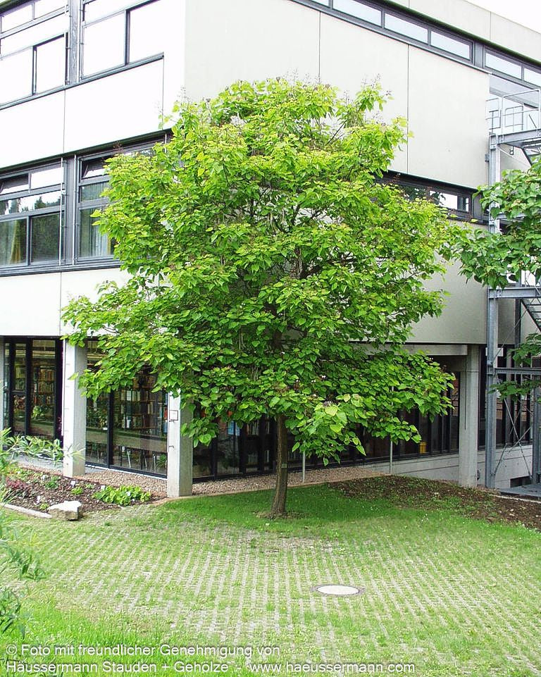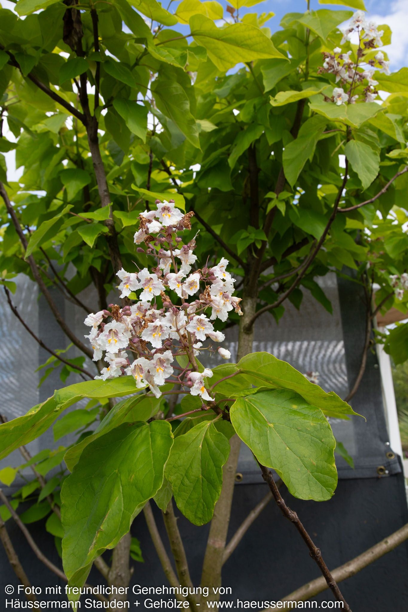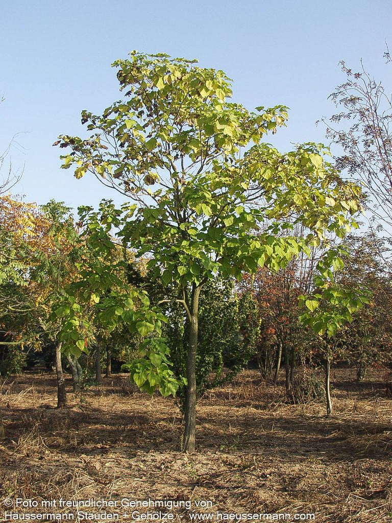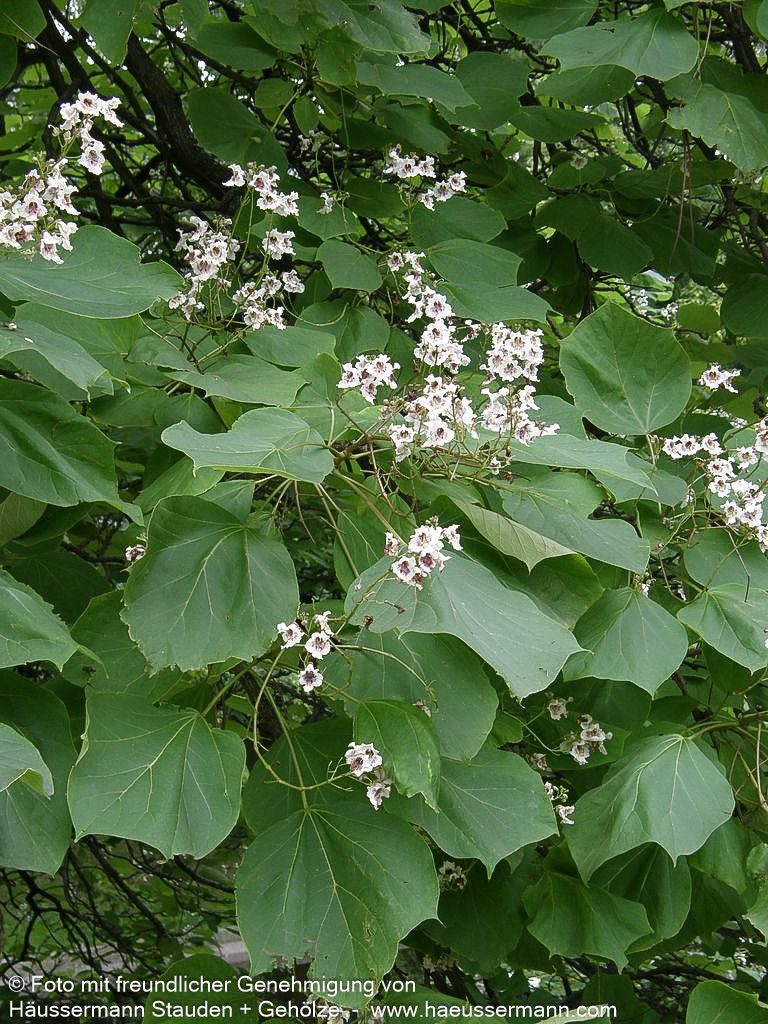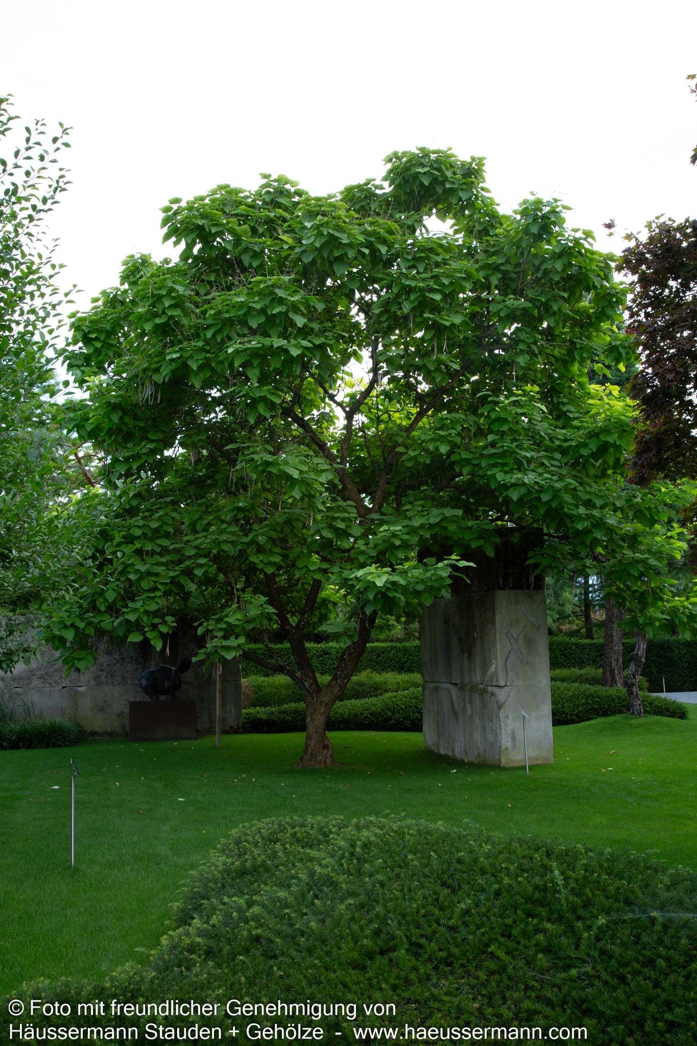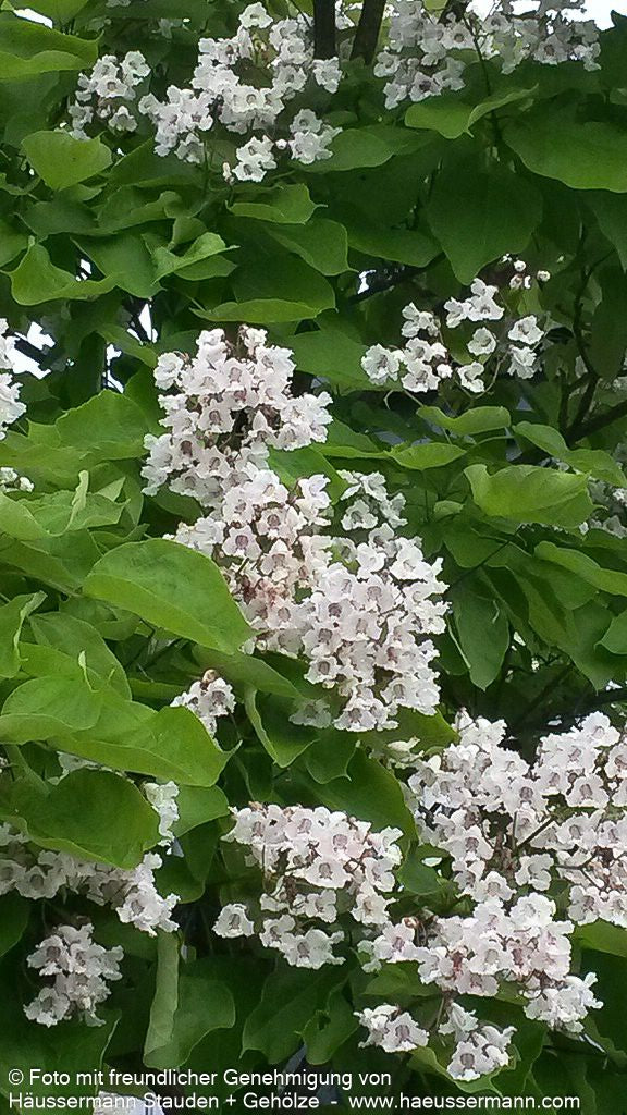 Der Trompetenbaum (Catalpa bignonioides) ist ein beeindruckender mittelgroßer Baum, der mit seinen sehr großen, hellgrünen herzförmigen Blättern und spektakulären weißen Blütenrispen jeden Garten zu einem wahren Blickfang macht. Dieser kleinwüchsige Baum erreicht eine Höhe von 10-15 Metern und entwickelt eine charakteristische breit aufrechte Wuchsform. Seine außergewöhnliche Blattform verleiht ihm ganzjährig Struktur, während die prächtigen Blüten in Juni und Juli für herrlichen Blütenschmuck sorgen. Das sommergrüne Laubgehölz zeigt sich zudem herbstfärbend und dient als wertvolle Insektennährpflanze. Der anspruchslose Trompetenbaum gedeiht sowohl sonnig als auch halbschattig oder absonnig und toleriert sowohl trockene als auch frische Böden – ideal für Parks oder große Gärten.