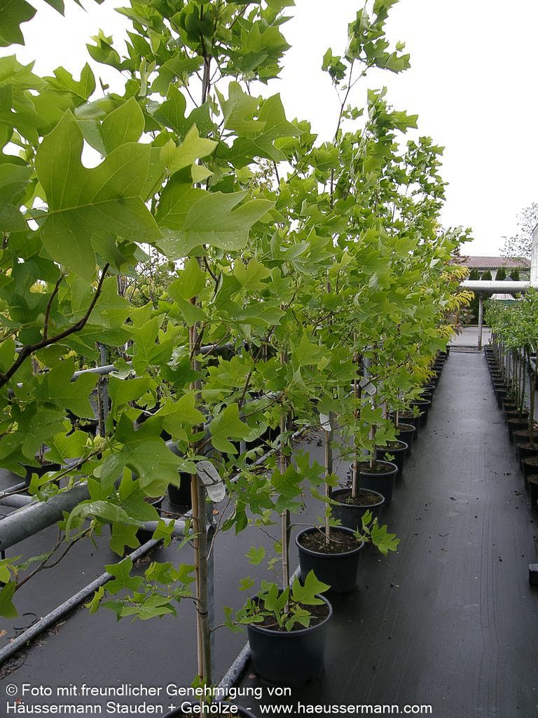 Der Tulpenbaum (Liriodendron tulipifera) ist ein majestätischer, schnellwachsender Laubbaum, der mit seiner imposanten Erscheinung jeden Garten bereichert. Dieser Großbaum entwickelt sich schmal aufrecht und kegelförmig zu einer beeindruckenden Höhe von 25-35 Metern und eignet sich perfekt für die Einzelstellung in weitläufigen Gärten. Die frischgrünen Blätter bestechen durch ihre besondere Form und verwandeln sich im Herbst in ein spektakuläres Goldgelb - ein wahres herbstfärbendes Schauspiel. Im Juni zeigt sich der sommergrüne Baum von seiner schönsten Seite mit den charakteristischen tulpenförmigen Blüten in gelbgrüner Farbe, die ihm seinen Namen verleihen und für einen einzigartigen Blütenschmuck sorgen. An einem sonnigen Standort mit frischen bis feuchten Böden entfaltet dieser außergewöhnliche Baum seine volle Pracht und wird zum unverwechselbaren Blickfang in Ihrem Garten.