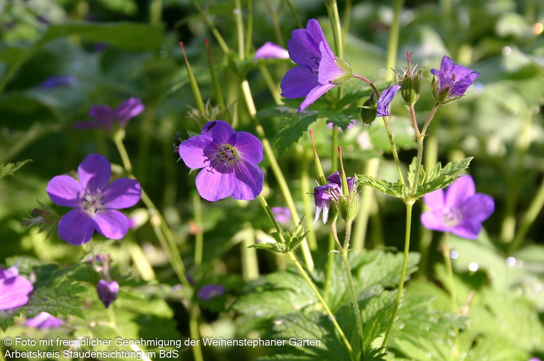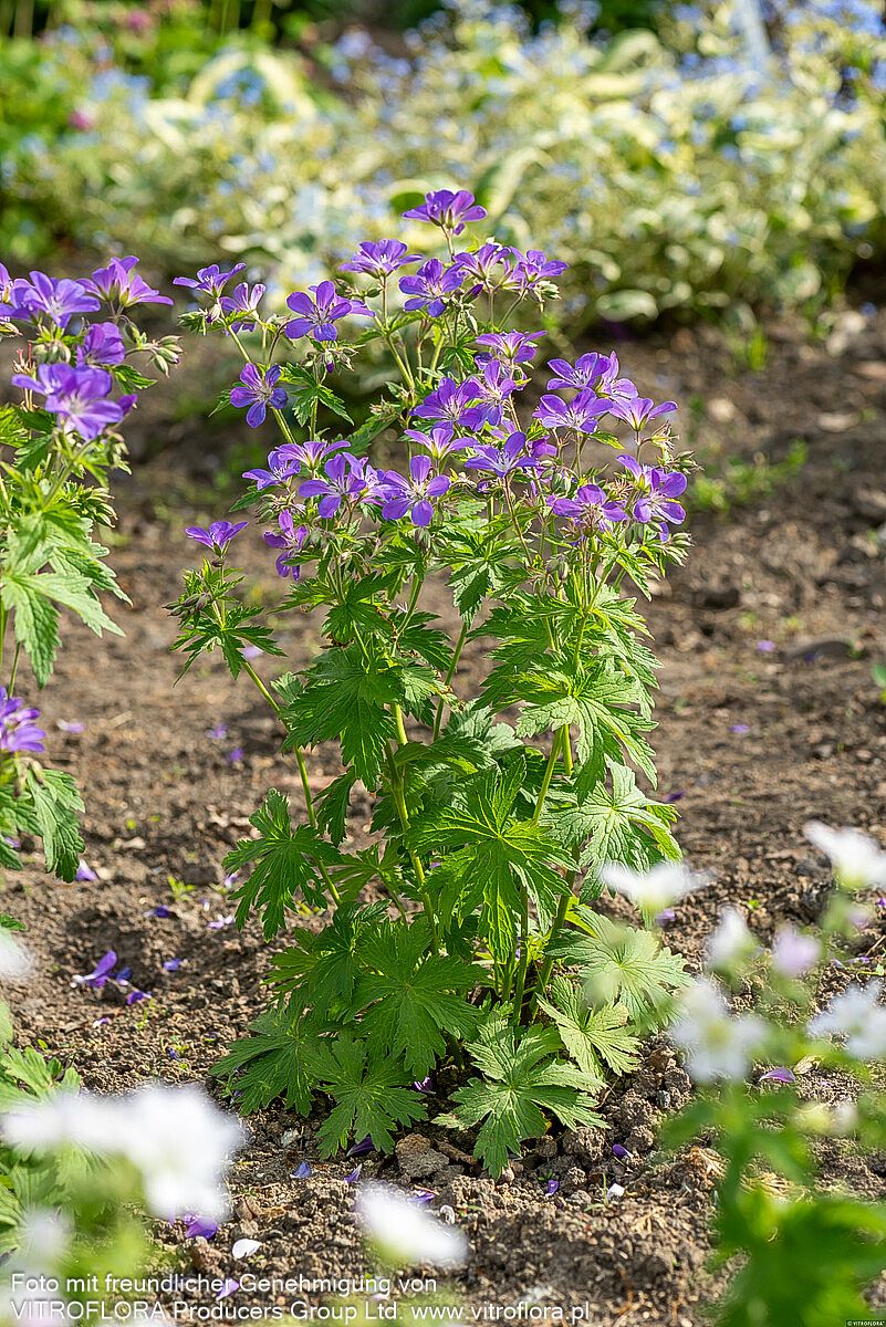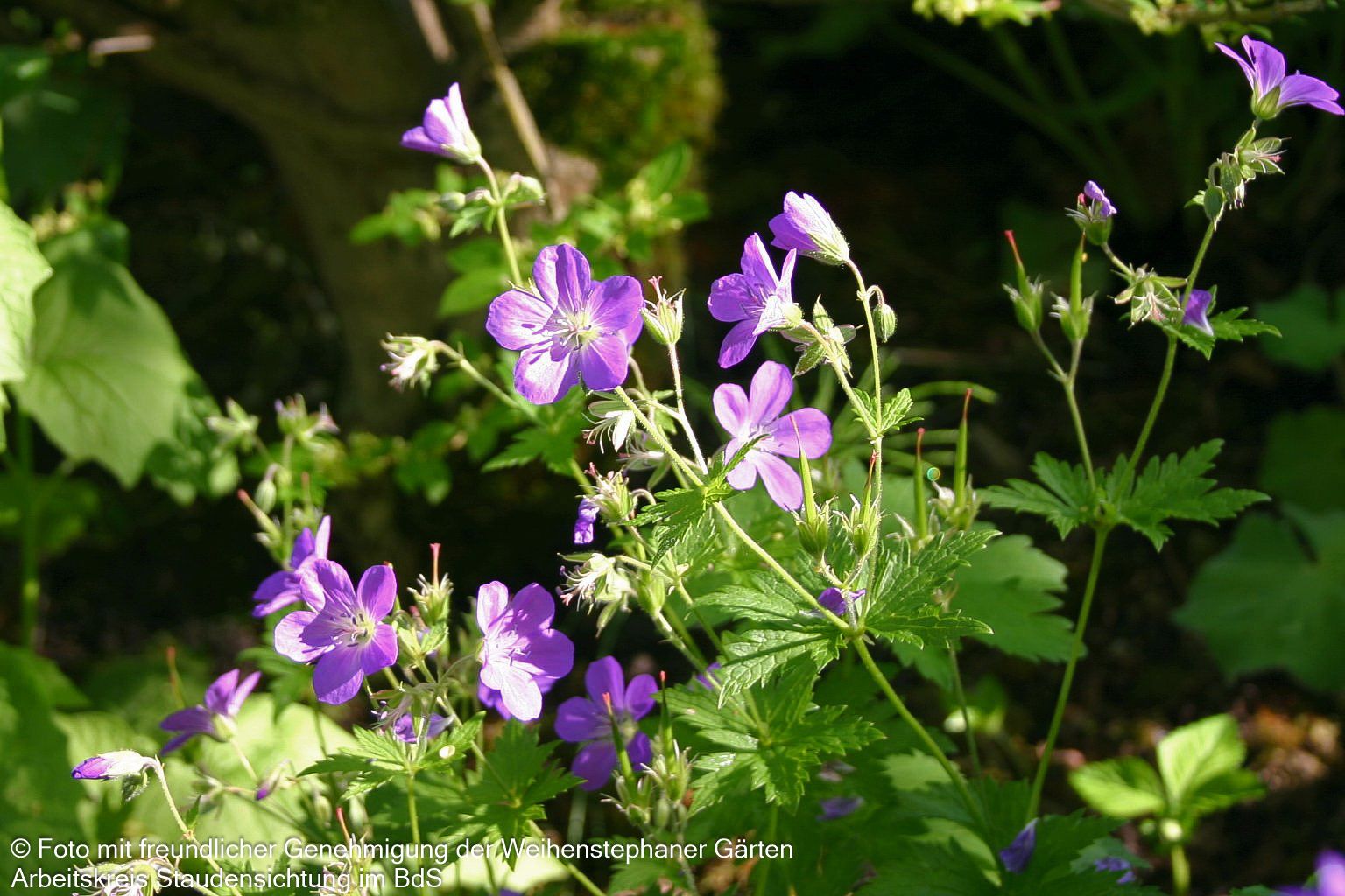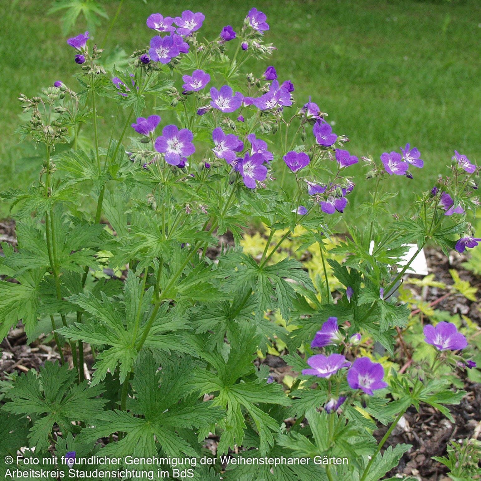 Der Wald-Storchschnabel (Geranium sylvaticum 'Mayflower') ist eine bezaubernde Staude, die mit ihren hell-blauen, einfachen Blüten von Mai bis Juli begeistert. Diese prämierte Sternensorte wurde sogar zur Staude des Jahres 2004 gekürt und erreicht eine Blütenhöhe von 40-60 cm. Der halbschattige Standort mit frischem Boden ist ideal für diese winterharte Staude der Zone 4. Mit ihrer buschigen Wuchsform und den grünen, sommergrünen Blättern eignet sie sich hervorragend als kleinflächiger Bodendecker oder für Rhododendron-Pflanzungen. Als Gerüststaude empfiehlt sich ein Pflanzabstand von 40 cm für optimale Entwicklung.