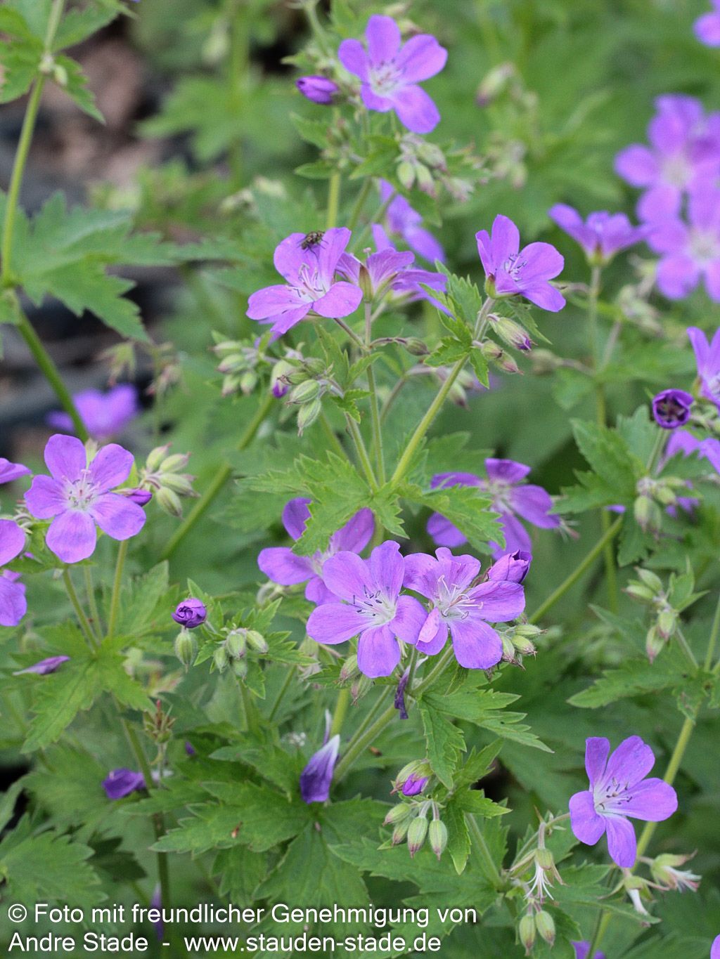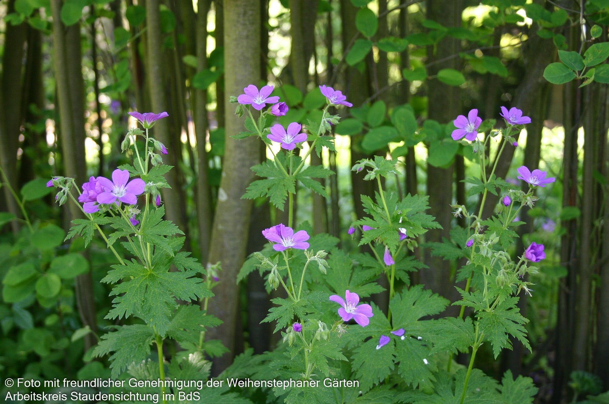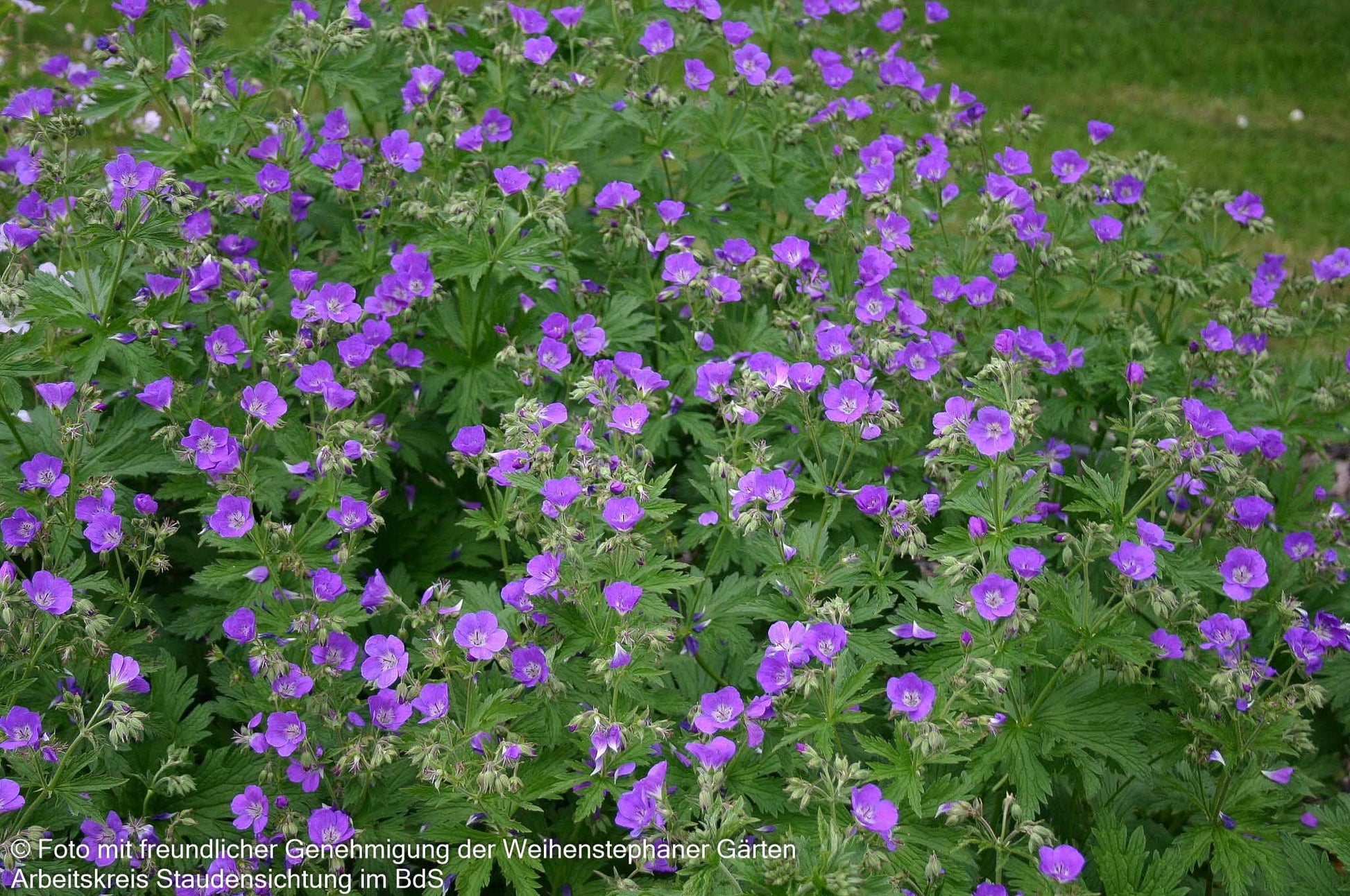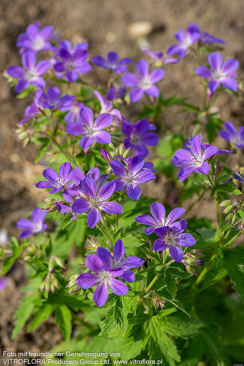 Der Wald-Storchschnabel (Geranium sylvaticum 'Mayflower') ist eine bezaubernde Staude, die mit ihren hell-blauen, einfachen Blüten von Mai bis Juli begeistert. Diese prämierte Sternensorte wurde sogar zur Staude des Jahres 2004 gekürt und erreicht eine Blütenhöhe von 40-60 cm. Der halbschattige Standort mit frischem Boden ist ideal für diese winterharte Staude der Zone 4. Mit ihrer buschigen Wuchsform und den grünen, sommergrünen Blättern eignet sie sich hervorragend als kleinflächiger Bodendecker oder für Rhododendron-Pflanzungen. Als Gerüststaude empfiehlt sich ein Pflanzabstand von 40 cm für optimale Entwicklung.