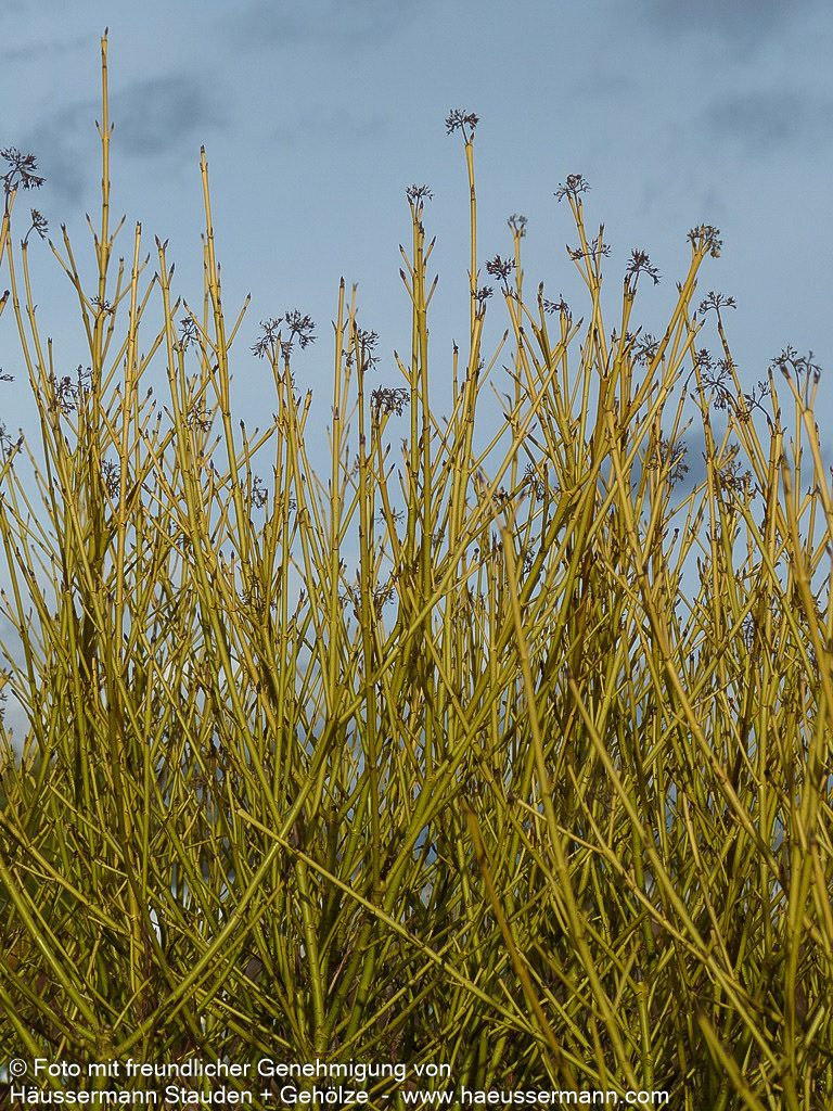 Der Weißbunte Gelbholz-Hartriegel (Cornus stolonifera 'White Gold') ist ein außergewöhnlicher Zierstrauch, der mit seiner gelbgrünen Rinde und den unregelmäßig weiß gerandeten Blättern das ganze Jahr über für Aufsehen sorgt. Dieses sommergrüne Laubgehölz erreicht eine kompakte Größe von bis zu 2 Metern und gehört zu den mittelhohen Gehölzen mit breit aufrechter Wuchsform. Im April verzaubert er mit seinen weißen Doldenblüten, die einen herrlichen Blütenschmuck bilden. Die weißen Blüten werden im Spätsommer von dekorativen bläulich-weißen Früchten abgelöst. Besonders reizvoll ist der besondere Winteraspekt durch die leuchtende Rinde. Dieser anspruchslose Strauch gedeiht optimal an sonnigen bis absonnigen Standorten auf frischen bis feuchten Böden und eignet sich perfekt für Blütenhecken sowie für den kleinen Garten.