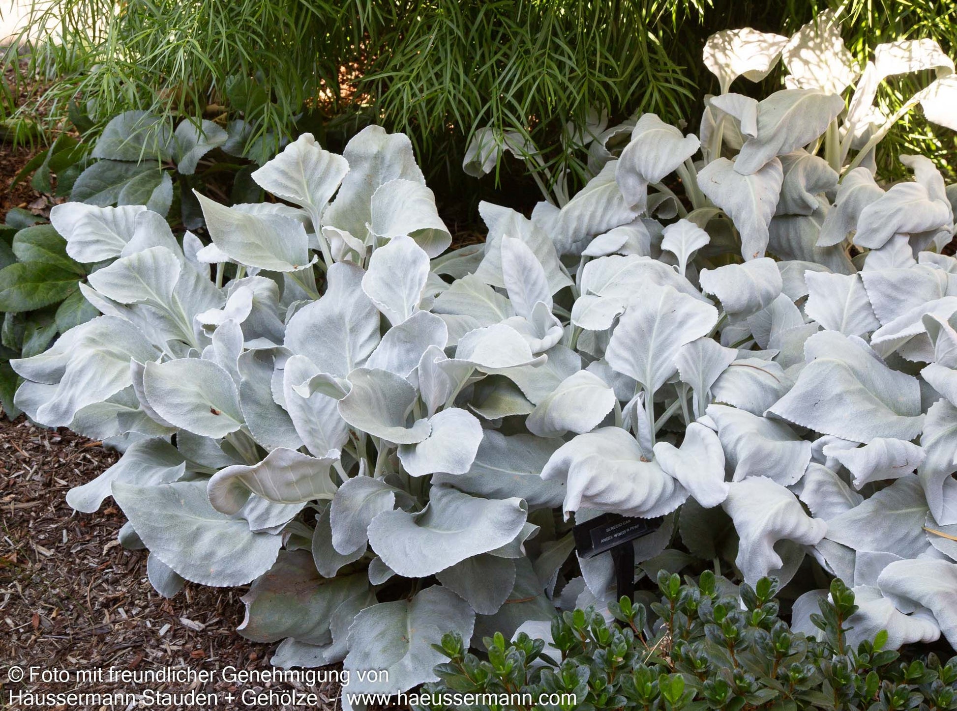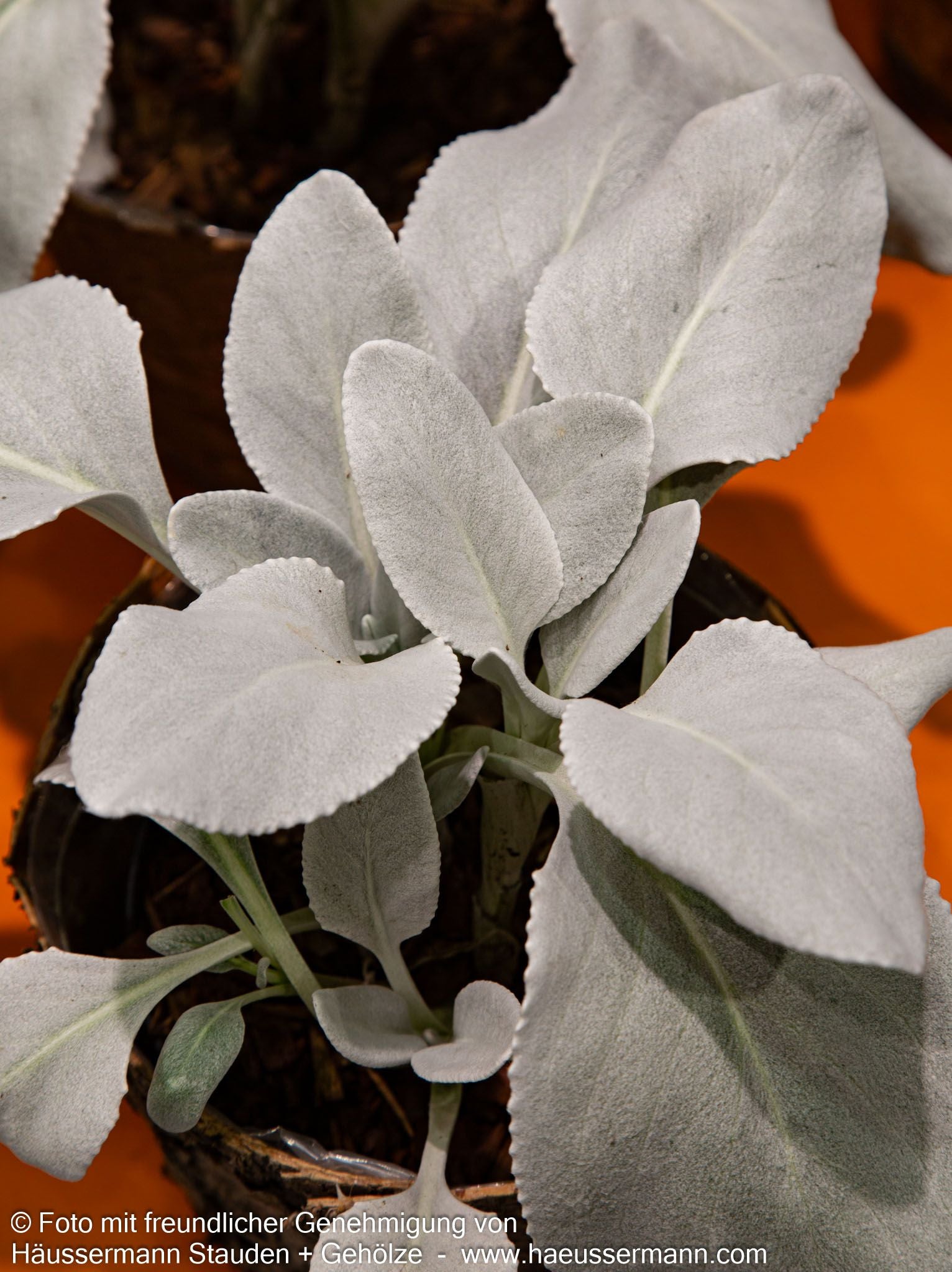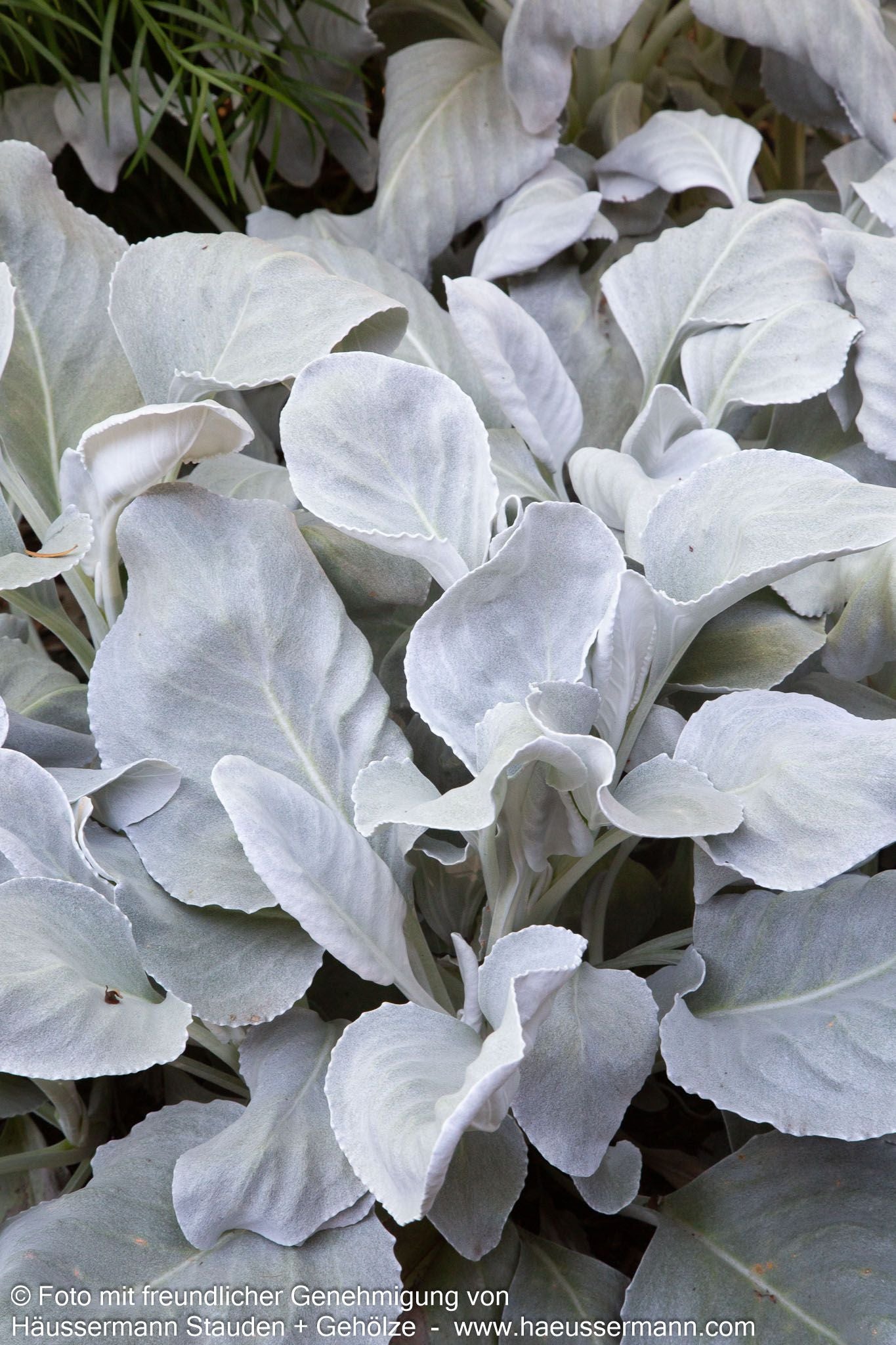 Das Weißlaubige Greiskraut (Senecio candicans 'Angel Wings') verzaubert mit seinen seidig silberweißen, großblättrigen Blättern, die einen faszinierenden Kontrast zu den gelben Blüten bilden. Diese außergewöhnliche Staude erreicht eine Wuchshöhe von 30-40 cm und begeistert von Juni bis August mit ihren einfachen Blütenständen, die eine imposante Höhe von 80-120 cm erreichen. Als wertvolle Insektennährpflanze bevorzugt sie einen sonnigen Standort am Gehölzrand mit frischem Boden. Die wintergrüne Sorte 'Angel Wings' ist bis zu -18°C winterhart und sollte als Leitstaude mit einem Pflanzabstand von 60 cm gesetzt werden - bei Kahlfrost empfiehlt sich ein leichter Schutz.