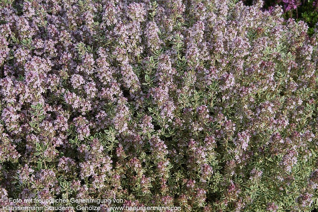 Der Weißrandige Zitronen-Thymian (Thymus x citriodorus 'Silver King') ist eine bezaubernde Duftstaude mit außergewöhnlich attraktivem Laub und charmanten Blüten. Diese wintergrüne Staude besticht durch ihre grünen, weiß gerandeten Blätter und entwickelt von Juni bis August zart-rosa Blüten. Mit ihrer kissenartigen Wuchsform erreicht sie eine Höhe von 8-12 cm und eignet sich hervorragend als kleinflächiger Bodendecker. Diese aromatische Pflanze gedeiht optimal an sonnigen Standorten mit trockenem Boden und ist perfekt für Steinanlagen, Felssteppen oder Mauerkronen geeignet. Als wertvolle Insektennährpflanze mit intensivem Blatt- und Blütenduft bereichert sie jeden Garten sinnlich und ökologisch.