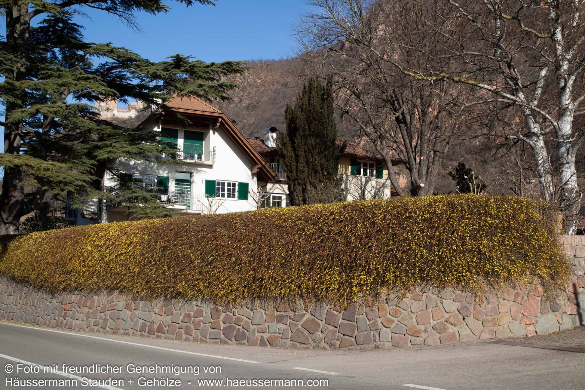 Der Winter-Jasmin (Jasminum nudiflorum) ist ein wahres Winterwunder, das mit seinen leuchtend primelgelben Blüten von Dezember bis März selbst die trübsten Monate des Jahres erhellt. Dieser vielseitige Laubstrauch besticht durch seinen flachen, ausgebreiteten Wuchs und seine charakteristische Hängeform. Als Kletterpflanze erreicht er mit entsprechender Rankhilfe bis zu 3 Meter Höhe und eignet sich perfekt für Mauerkronen, Pergolen oder Gefäße. Der anspruchslose Winterblüher gedeiht sowohl an sonnigen als auch halbschattigen Standorten und toleriert verschiedenste Bodenverhältnisse von trocken bis feucht. Seine gelben Blüten bieten frühen Wildbienen wertvolle Nahrung und machen dieses Kleingehölz zu einem ökologisch wertvollen Blütenschmuck für jeden Garten.