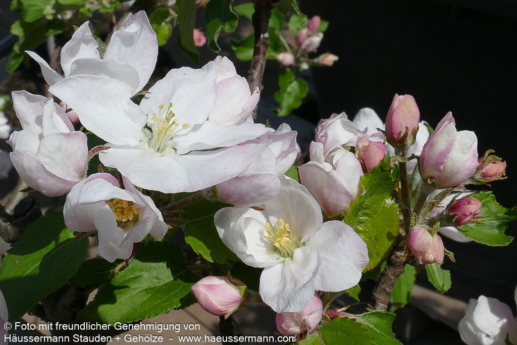 Der Winterapfel Malus 'Roter Boskoop' ist eine bewährte rote Auslese der traditionsreichen holländischen Boskoop-Sorte mit besonders niedrigem Allergengehalt. Dieser robuste Laubbaum entwickelt eine charakteristische breitkronige Wuchsform und gedeiht hervorragend an sonnigen bis halbschattigen Standorten. Die weißen Blüten erscheinen von April bis Mai und machen ihn zur wertvollen Insektennährpflanze. Das sommergrüne Laub zeigt sich in kräftigem Dunkelgrün. Die großen, dunkelroten Äpfel reifen im Oktober und sind dank ihres säuerlich-saftigen Geschmacks und ihrer ausgezeichneten Lagerfähigkeit bis April kulinarisch besonders wertvoll. Als Vogelnährpflanze bereichert er zusätzlich die heimische Tierwelt und eignet sich ideal für schwere Böden.