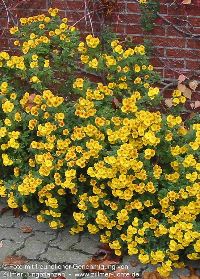 Die Winteraster (Chrysanthemum x hort. 'Bienchen') verzaubert Ihren Herbstgarten mit ihren goldgelben, gefüllten Blüten und der charakteristischen braunen Mitte. Diese robuste Staude erreicht eine Blütenhöhe von 60 bis 80 cm und blüht zuverlässig von September bis Oktober. Als Sternensorte der deutschen Staudensichtung überzeugt 'Bienchen' durch ihre Qualität und Langlebigkeit. Die graugrünen, sommergrünen Blätter bilden einen wunderschönen Kontrast zu den leuchtenden Herbstblüten. Diese Beetstaude bevorzugt sonnige Standorte mit frischem Boden und entwickelt eine buschige Wuchsform. Perfekt für den Bauerngarten oder für Schnittzwecke geeignet, verströmt sie einen angenehmen Blütenduft und ist bis -11°C winterhart.