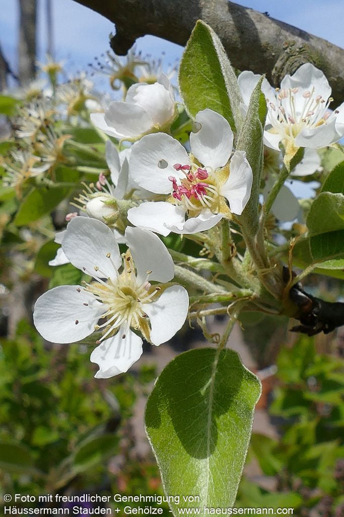 Die Winterbirne (Pyrus communis 'Novembra') ist eine bemerkenswerte neuere Züchtung aus Moldawien, die Gartenfreunde mit ihren außergewöhnlich großen, saftigen und aromatischen Früchten begeistert. Dieses anspruchslose und robuste Laubgehölz eignet sich hervorragend für Hausgärten und Streuobstwiesen und überzeugt mit hohen, regelmäßigen Erträgen. Von April bis Mai schmückt sich der Baum mit weißen Blüten, die nicht nur optisch bezaubern, sondern auch als wertvolle Insektennährpflanze dienen. Die im September geernteten Birnen reifen von November bis Februar nach und sind durch ihre halbschmelzende Konsistenz und lange Lagerfähigkeit vielseitig verwendbar. Das sommergrüne Laub in frischem Grün macht 'Novembra' auch als Vogelnährpflanze zu einer ökologisch wertvollen Bereicherung für jeden Garten.