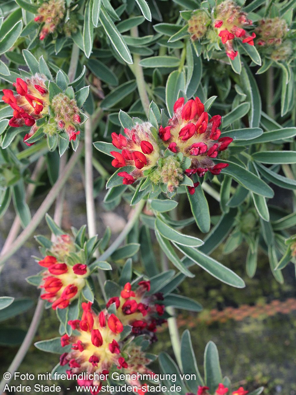 Der Wundklee (Anthyllis vulneraria var. coccinea) ist eine beeindruckende Staude mit leuchtend orangeroten Blüten, die von Mai bis August eine spektakuläre Farbpracht entfalten. Diese niederliegende bis aufsteigende Pflanze erreicht eine Blütenhöhe von 10-30 cm und besticht durch ihre attraktiven blaugrünen, sommergrünen Blätter. Der robuste Wundklee gedeiht optimal an sonnigen Standorten und toleriert sowohl trockene als auch frische Böden. Diese winterharte Züchtung eignet sich hervorragend für Freiflächenpflanzungen, Steinanlagen und Heidegärten, wo sie als Gerüststaude in Gruppen von 3-5 Stück pro Tuff mit einem Pflanzabstand von 20-30 cm besonders eindrucksvoll zur Geltung kommt.