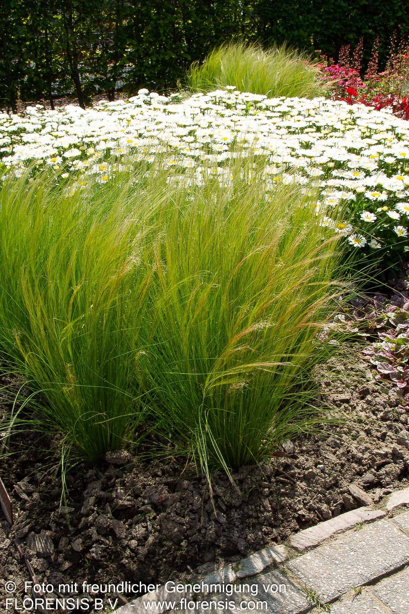 Das Zarte Federgras (Stipa tenuissima 'Ponytails') ist ein bezauberndes Ziergras, das Ihren Garten mit seinen filigranen, weiß-silbrigen Blütenrispen von Mai bis Juli verzaubert. Diese elegante Züchtung erreicht eine Blütenhöhe von 30 bis 40 cm und gedeiht optimal an sonnigen Standorten mit trockenem Boden. Das wintergrüne Laub sorgt ganzjährig für Struktur im Garten, während sich das Gras durch Selbstaussaat natürlich vermehrt. Perfekt geeignet für Freiflächen, Steinanlagen, Steppenheide und Felssteppe – ein Muss für jeden naturnahen Garten!