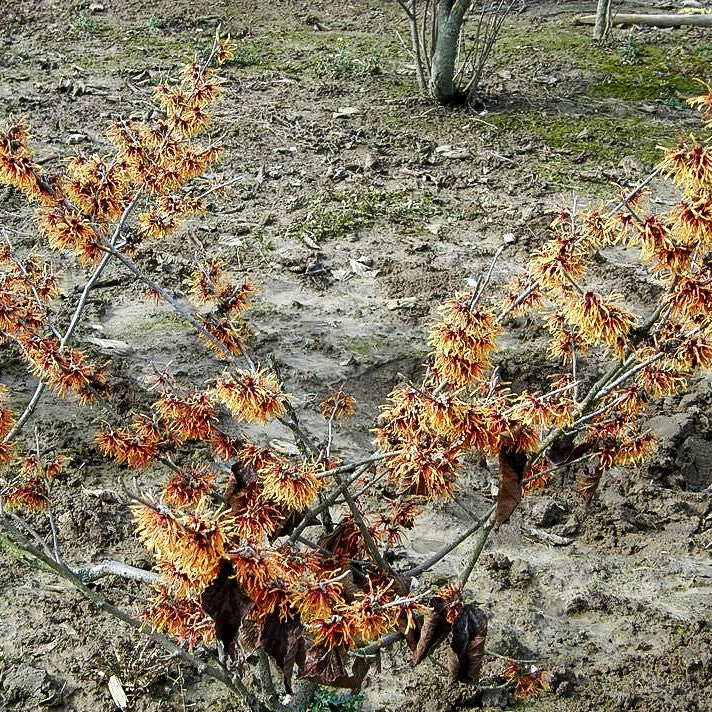 Die Zaubernuss 'Jelena' (Hamamelis x interm. 'Jelena') verzaubert Ihren Garten mit einer spektakulären Winterblüte, wenn andere Pflanzen noch im Winterschlaf ruhen. Dieser eindrucksvolle Großstrauch wächst breit aufrecht und erreicht eine stattliche Höhe von 3-4 Metern. Von Dezember bis in den Februar, März und April hinein entfalten sich die faszinierenden, fadenförmigen orangeroten Blüten, die einen angenehm leichten Duft verströmen und als wertvoller Blütenschmuck dienen.
