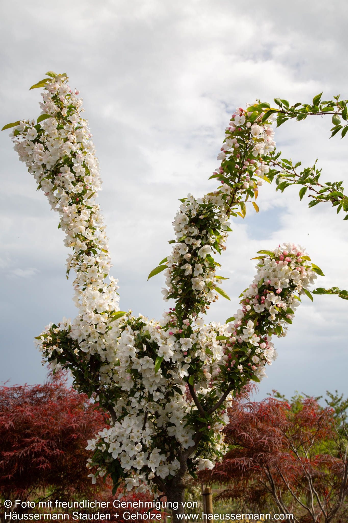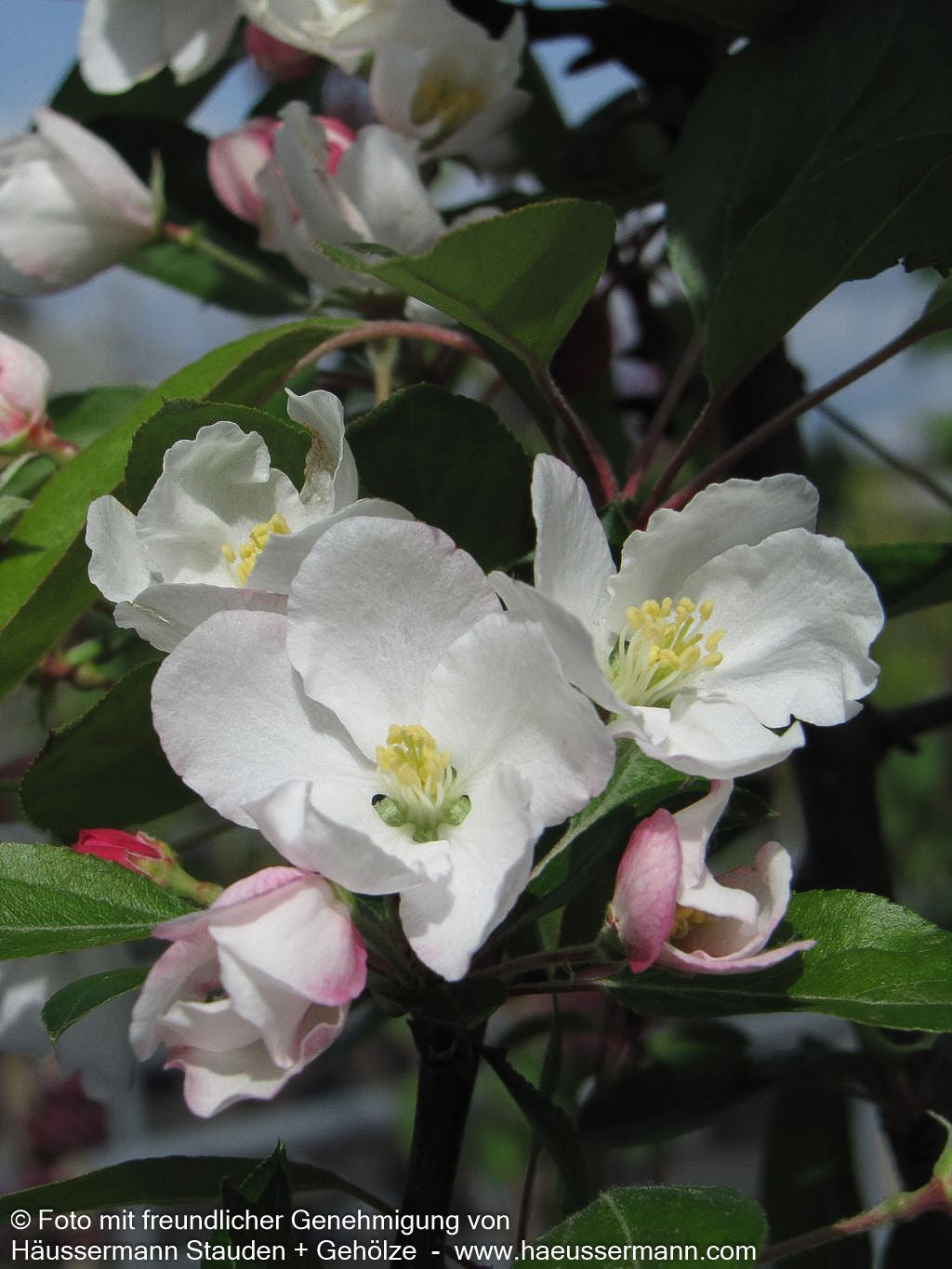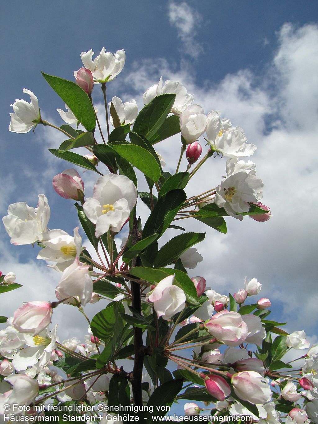 Der Zier-Apfel Malus x cult. 'Adirondack' ist ein außergewöhnlich gesundes Laubgehölz mit breit aufrechter Wuchsform, das als Großgehölz eine Höhe von 2,5 bis 4 Metern erreicht. In den Monaten April und Mai verzaubert dieser sommergrüne Strauch mit seinem prächtigen Blütenschmuck aus zahlreichen weißen Blüten. Im Herbst folgt der attraktive Fruchtschmuck mit vielen kleinen, dunkelroten Früchten, die nicht nur optisch begeistern, sondern auch kulinarisch bedeutsam sind. Das dunkelgrüne Laub bildet einen wunderschönen Kontrast zu Blüten und Früchten. Dieser vielseitige Zier-Apfel gedeiht optimal an sonnigen bis halbschattigen Standorten auf frischen bis feuchten Böden und dient gleichzeitig als wertvolle Insektennährpflanze und Vogelnährpflanze – ein echter Gewinn für jeden naturnahen Garten!