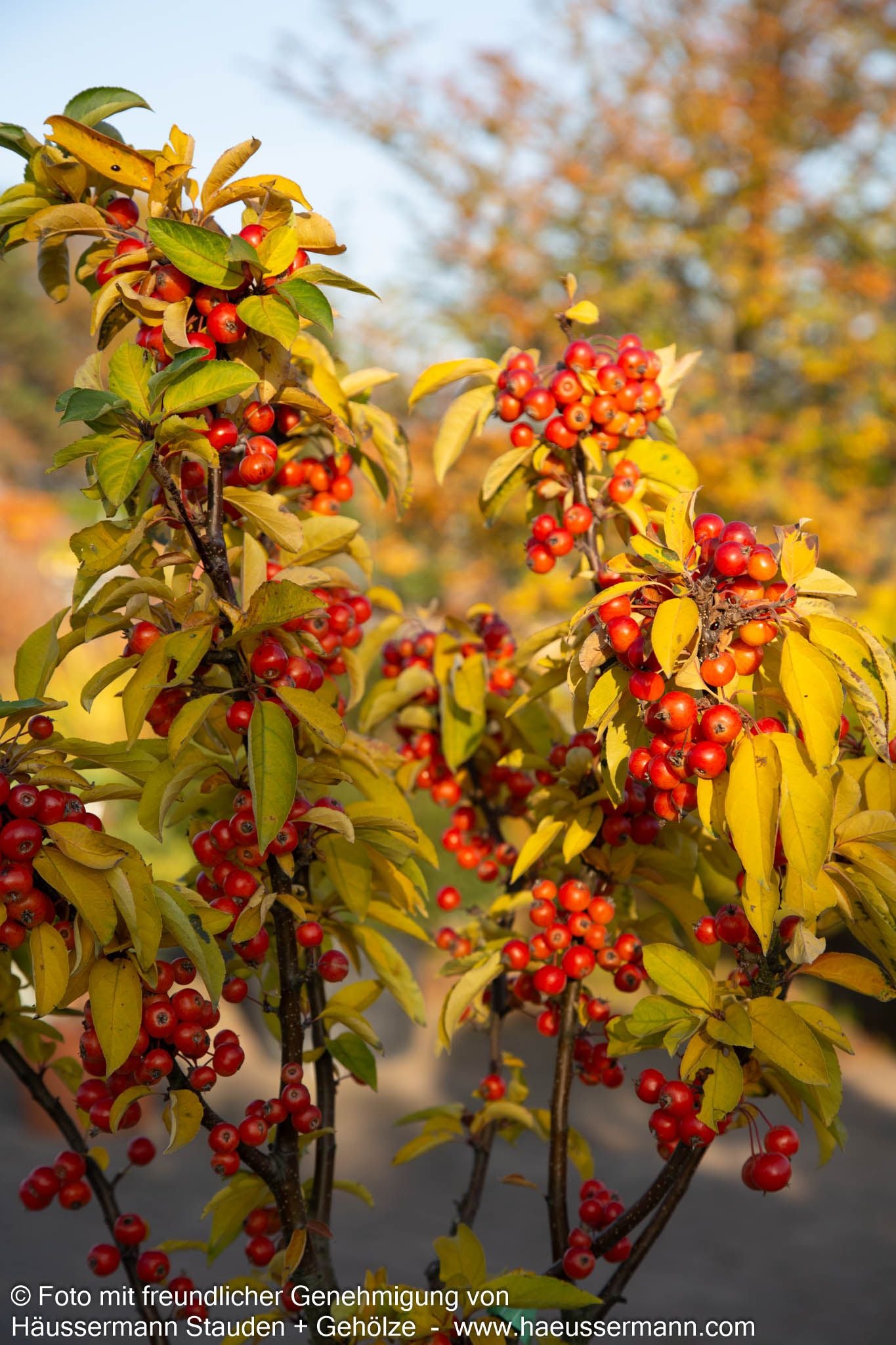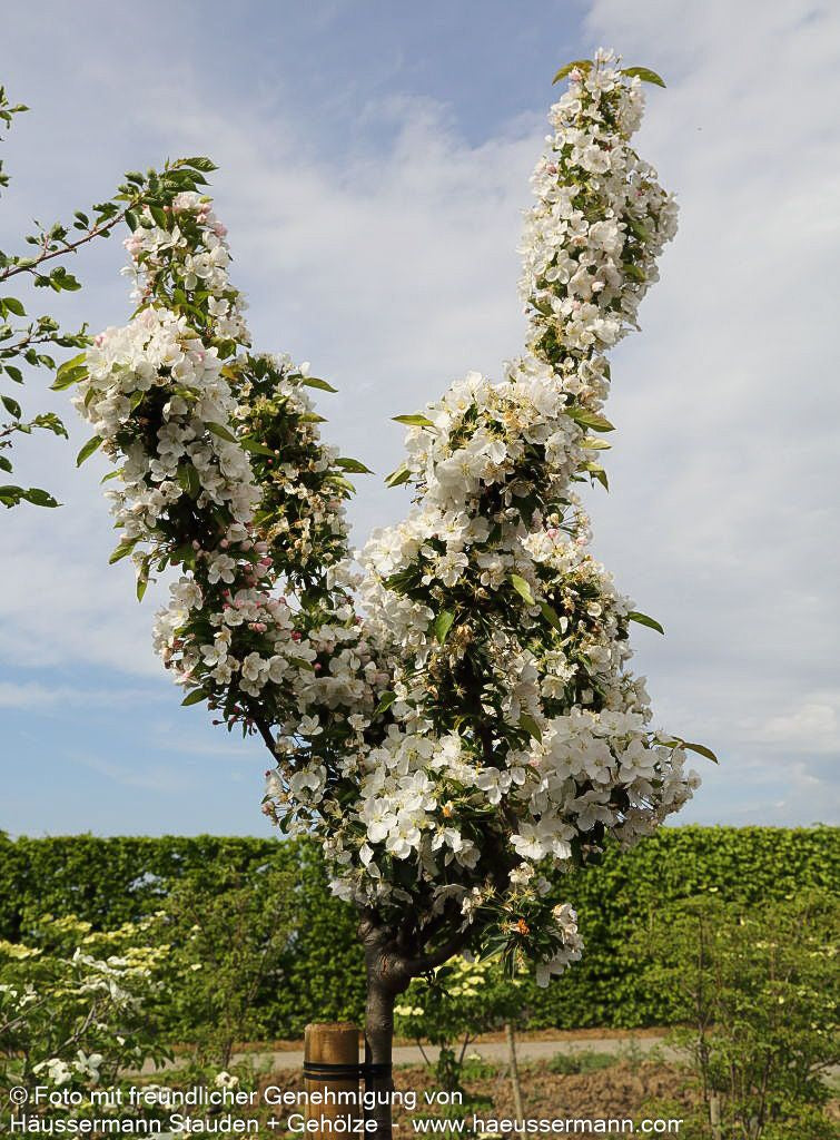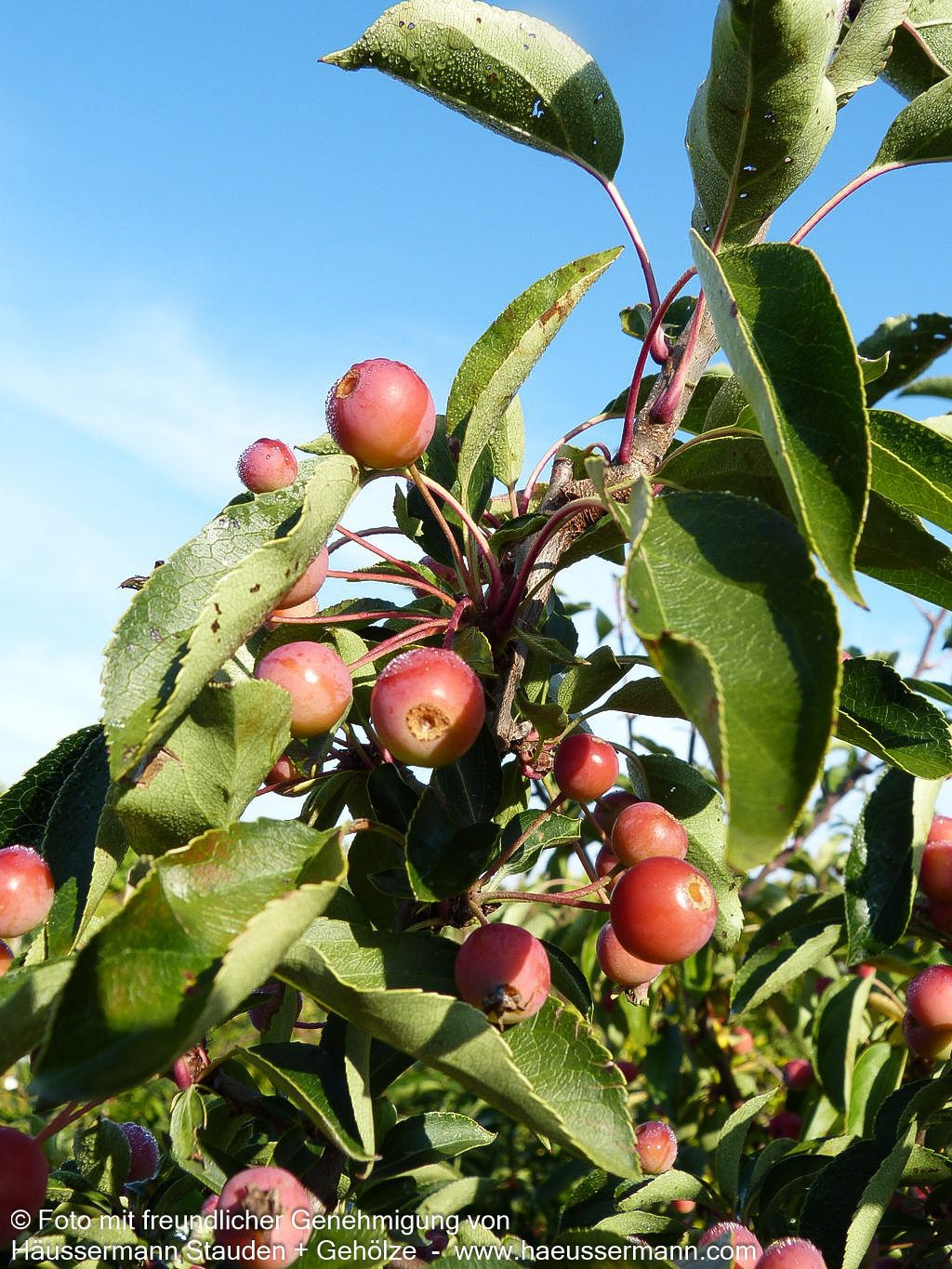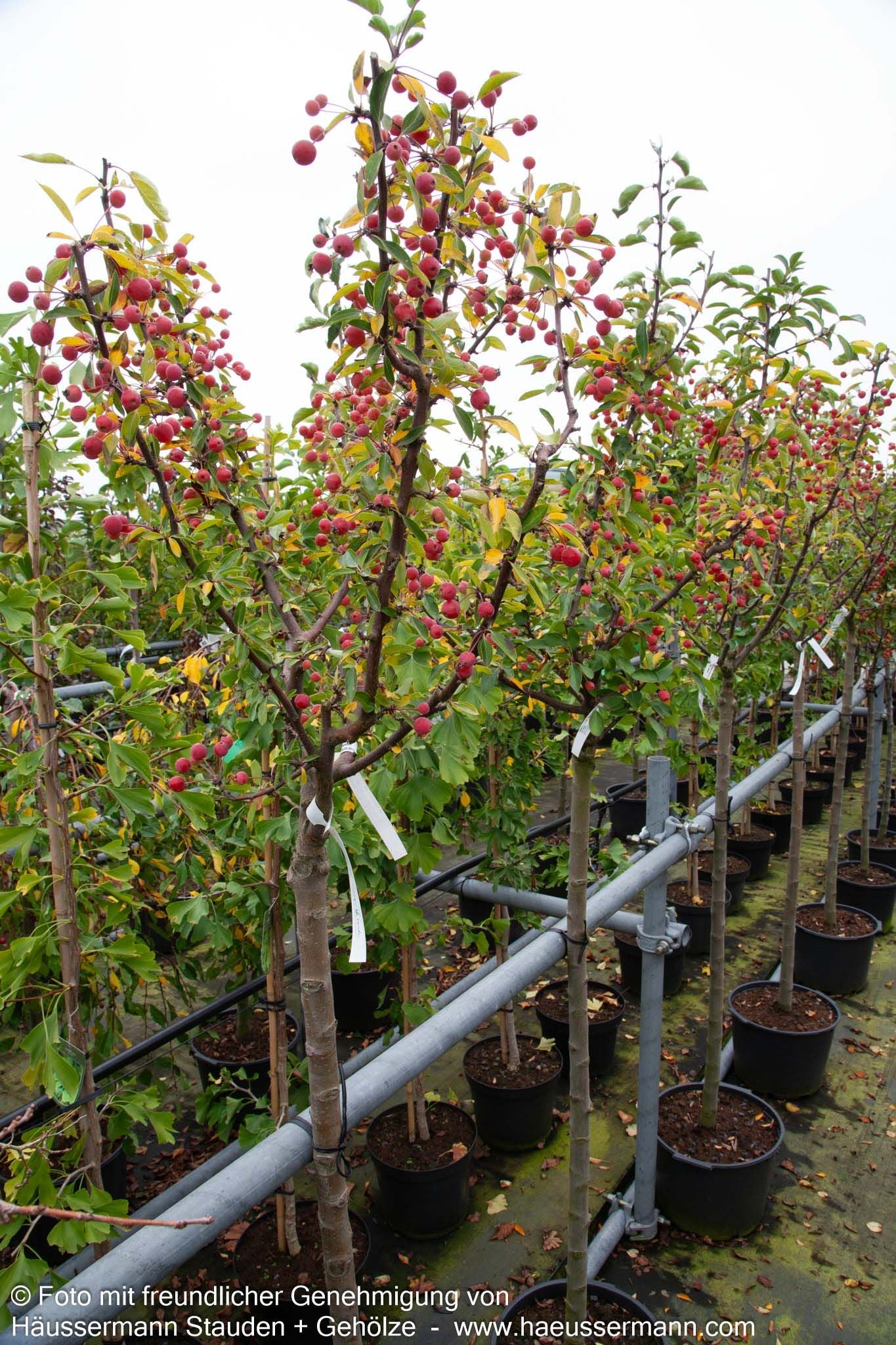 Der Zier-Apfel Malus x cult. 'Adirondack' ist ein außergewöhnlich gesundes Laubgehölz mit breit aufrechter Wuchsform, das als Großgehölz eine Höhe von 2,5 bis 4 Metern erreicht. In den Monaten April und Mai verzaubert dieser sommergrüne Strauch mit seinem prächtigen Blütenschmuck aus zahlreichen weißen Blüten. Im Herbst folgt der attraktive Fruchtschmuck mit vielen kleinen, dunkelroten Früchten, die nicht nur optisch begeistern, sondern auch kulinarisch bedeutsam sind. Das dunkelgrüne Laub bildet einen wunderschönen Kontrast zu Blüten und Früchten. Dieser vielseitige Zier-Apfel gedeiht optimal an sonnigen bis halbschattigen Standorten auf frischen bis feuchten Böden und dient gleichzeitig als wertvolle Insektennährpflanze und Vogelnährpflanze – ein echter Gewinn für jeden naturnahen Garten!