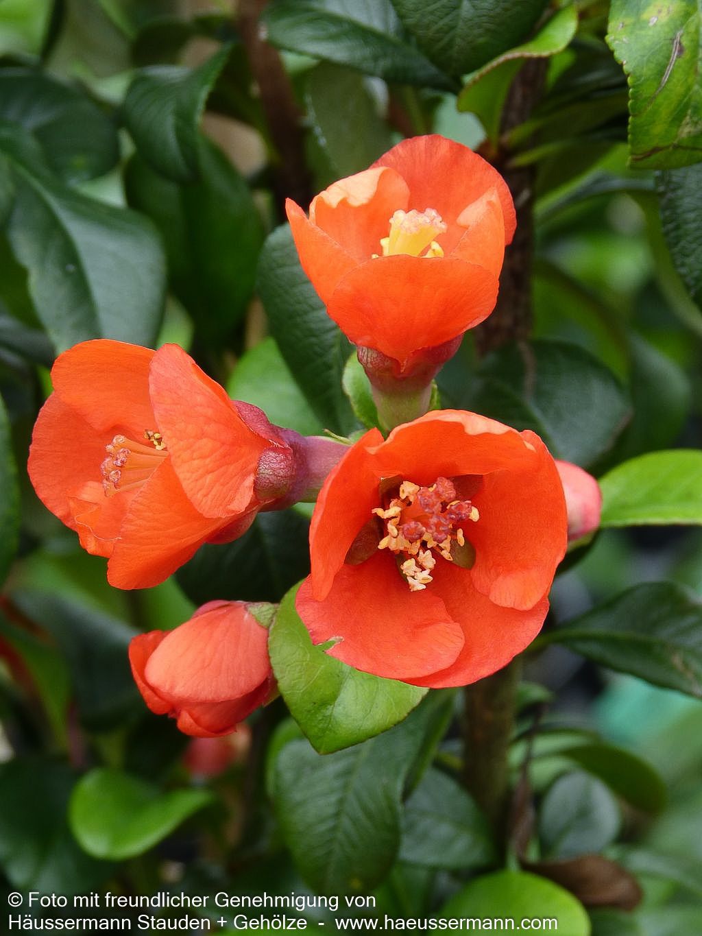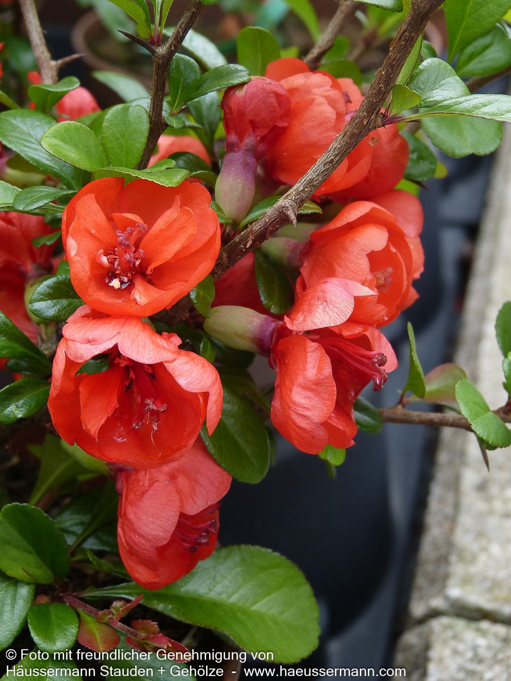 Die Zierquitte (Chaenomeles x sup. 'Friesdorfer Typ 18') ist ein besonderer Kleinstrauch mit breit aufrechtem Wuchs, der eine Höhe von 1,5-2 Metern erreicht und speziell als Schnittsorte für Blütenhecken gezüchtet wurde. Im April bis Mai beeindruckt dieses Laubgehölz mit seinen auffallenden hellroten Blüten, die nicht nur einen wunderschönen Blütenschmuck bieten, sondern auch als wertvolle Insektennährpflanze mit reichem Nektar- und Pollenangebot dienen. Im Herbst entwickeln sich bis zu 5 cm dicke, erst grüne dann gelbe Früchte, die für einen attraktiven Fruchtschmuck sorgen. Diese anspruchslose Kleinpflanze gedeiht sowohl an sonnigen als auch halbschattigen Standorten sowie in absonnigen Lagen und toleriert sowohl trockene als auch frische Böden.