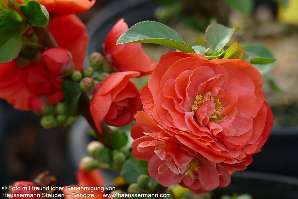 Die Zierquitte (Chaenomeles speciosa 'Orange Storm') ist ein bezaubernder Frühlingsblüher, der mit seinen leuchtend orangeroten bis scharlachroten gefüllten Blüten im April und Mai jeden Garten zum Strahlen bringt. Dieses kompakte Laubgehölz wächst breit aufrecht und erreicht als Kleingehölz eine Höhe von bis zu 1,5 Metern. Die sommergrüne Zierquitte begeistert nicht nur mit ihrem spektakulären Blütenschmuck, sondern auch mit dekorativem Fruchtschmuck - im Herbst entwickeln sich bis zu 5 cm dicke, erst grüne, dann gelbe Früchte. Als wertvolle Insektennährpflanze eignet sie sich hervorragend für niedrige Hecken und gedeiht optimal an sonnigen bis halbschattigen Standorten auf trockenen bis frischen Böden.