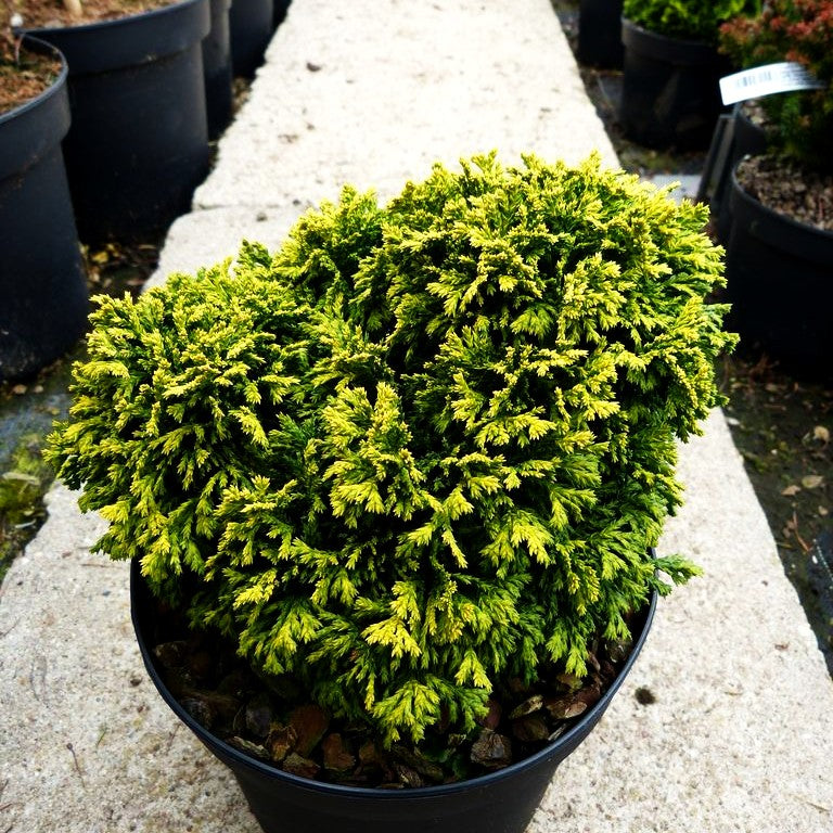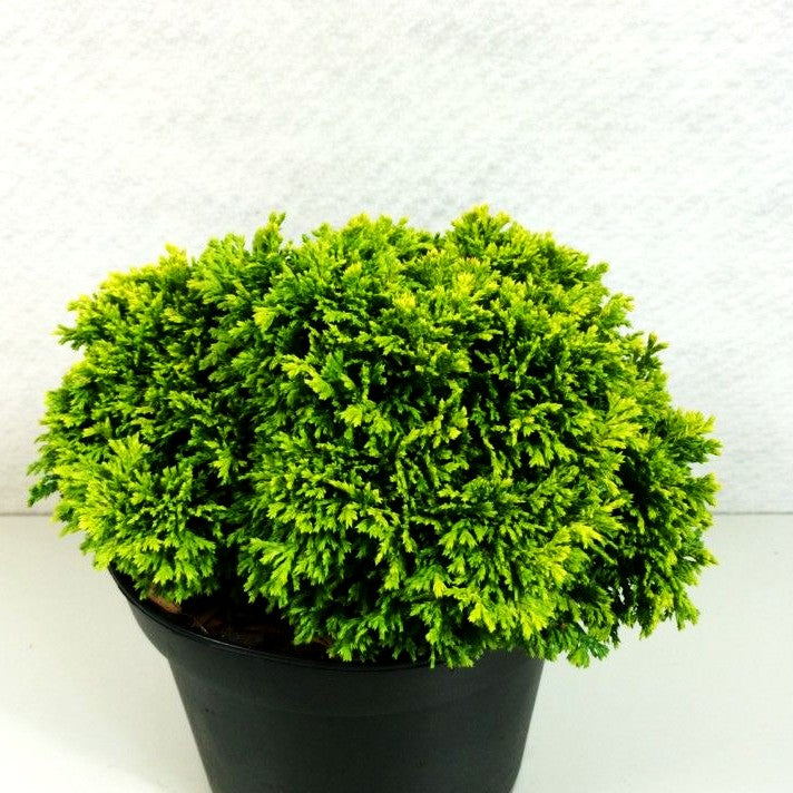 Die Zwerg-Moos-Scheinzypresse (Chamaecyparis pisifera 'Nana Bergh's') ist eine bezaubernde Rarität unter den Nadelgehölzen. Diese noch wenig bekannte Sorte besticht durch ihre weichen, moosartigen Nadeln in frischem Gelbgrün und zählt zu den Pflanzen mit besonderer Blattfarbe. Mit ihrem breitrunden, kompakten Wuchs und einer maximalen Höhe von nur 0,4 Metern gehört sie zu den Zwerggehölzen – perfekt für den kleinen Garten. Die extrem langsam wachsende Zwergkonifere bevorzugt einen sonnigen Standort sowie frische bis feuchte Böden. Als wintergrünes Schmuckstück setzt sie das ganze Jahr über reizvolle Akzente in Steingärten, Trögen oder Beeten.